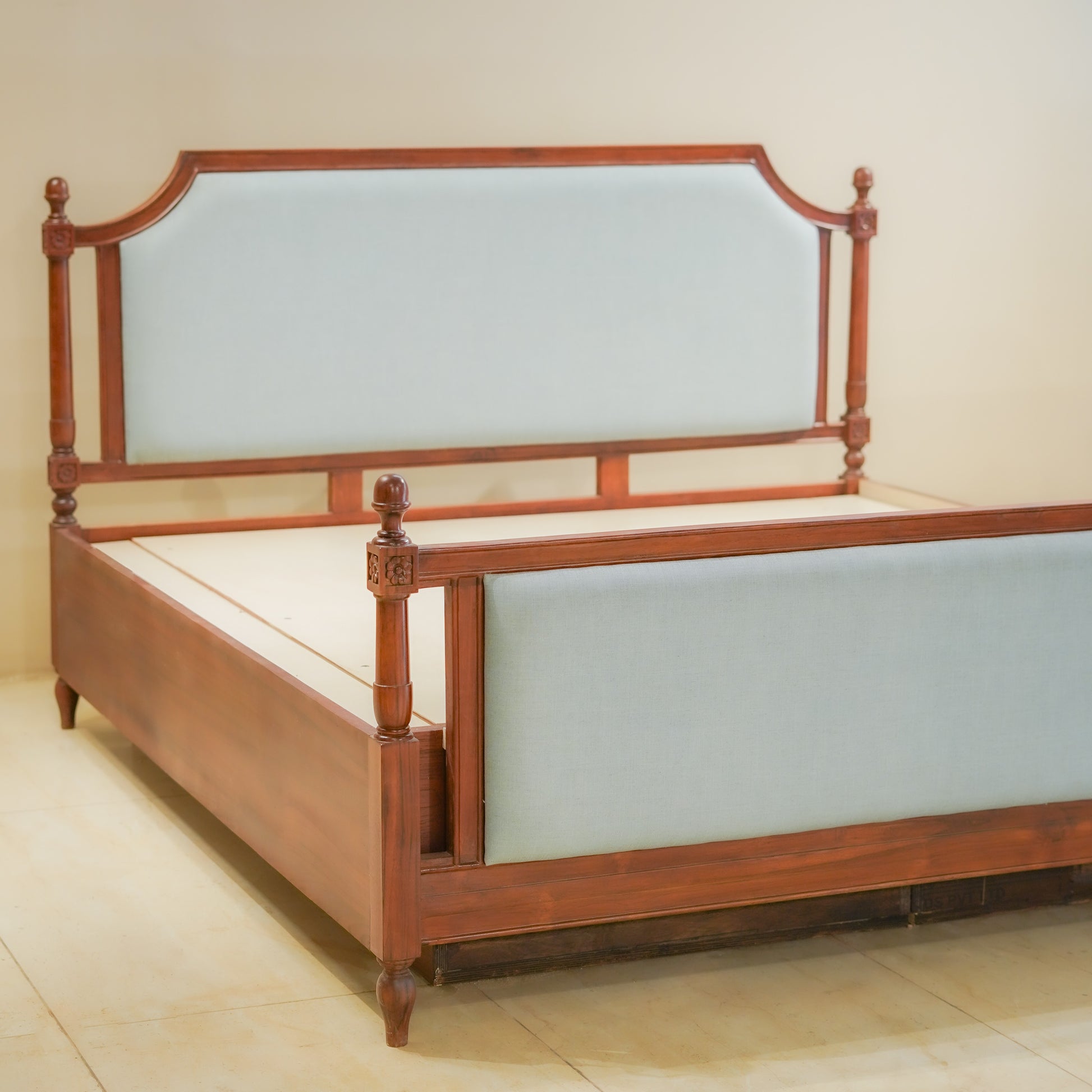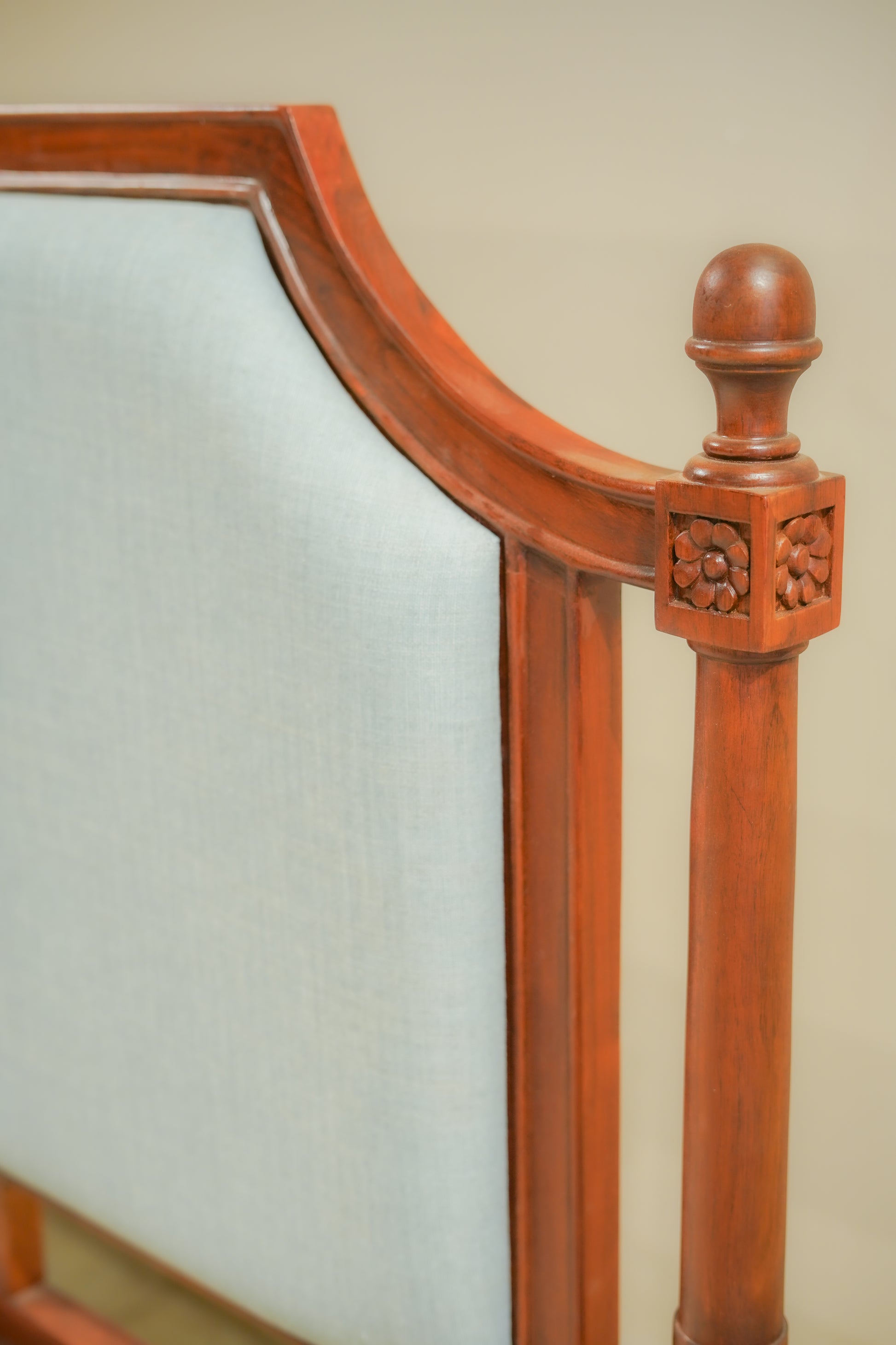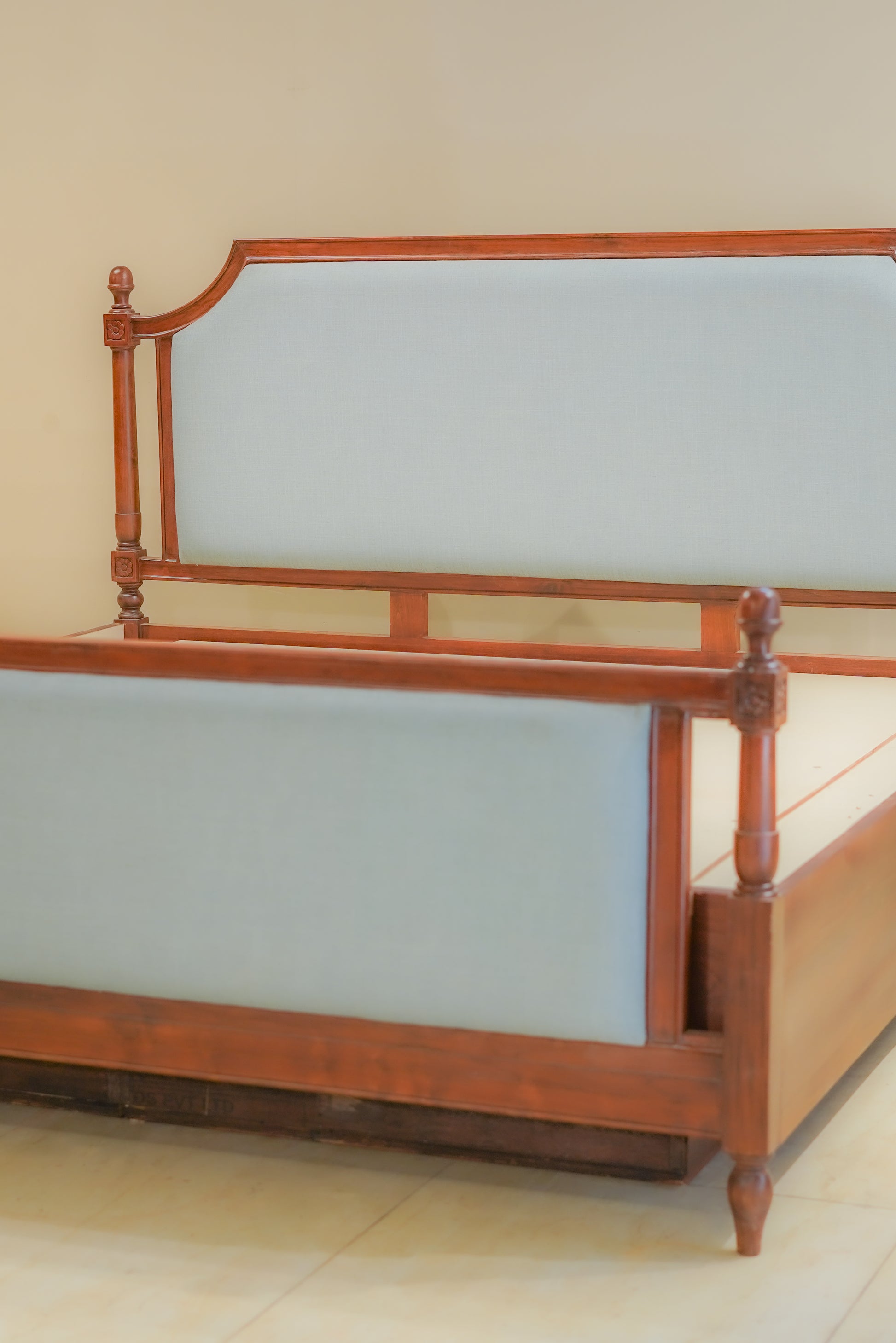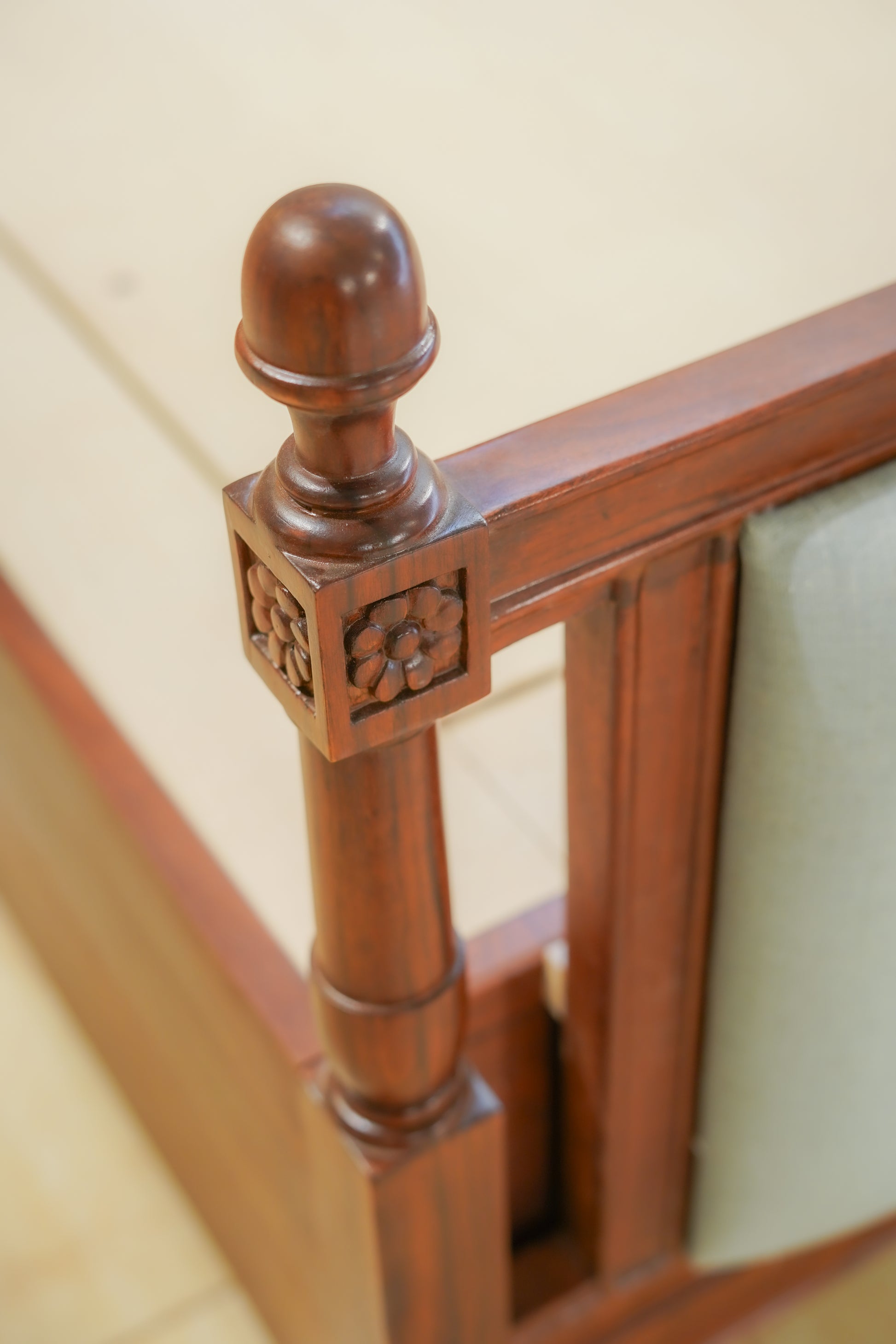 The rosewood polish is deep and romantic—like something aged in silence and smoke. Her finials stand poised, like candle flames caught mid-flicker, while the padded panels promise repose wrapped in grace.