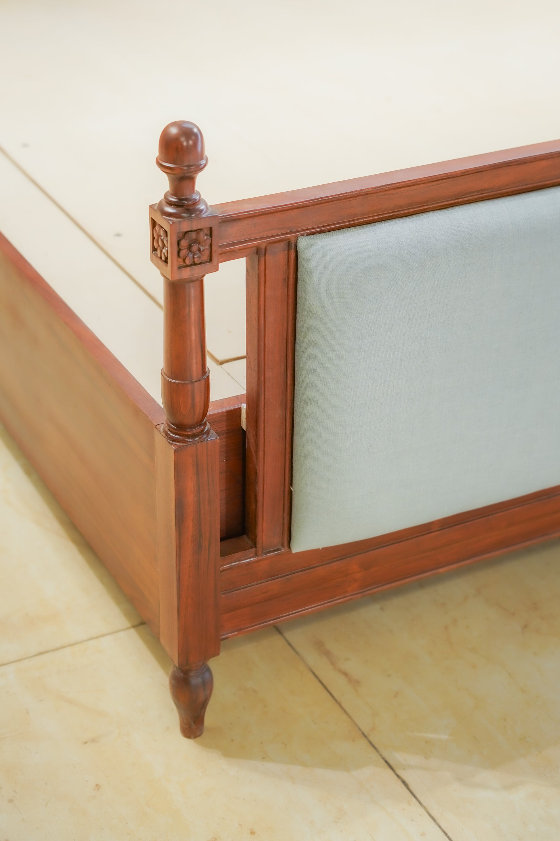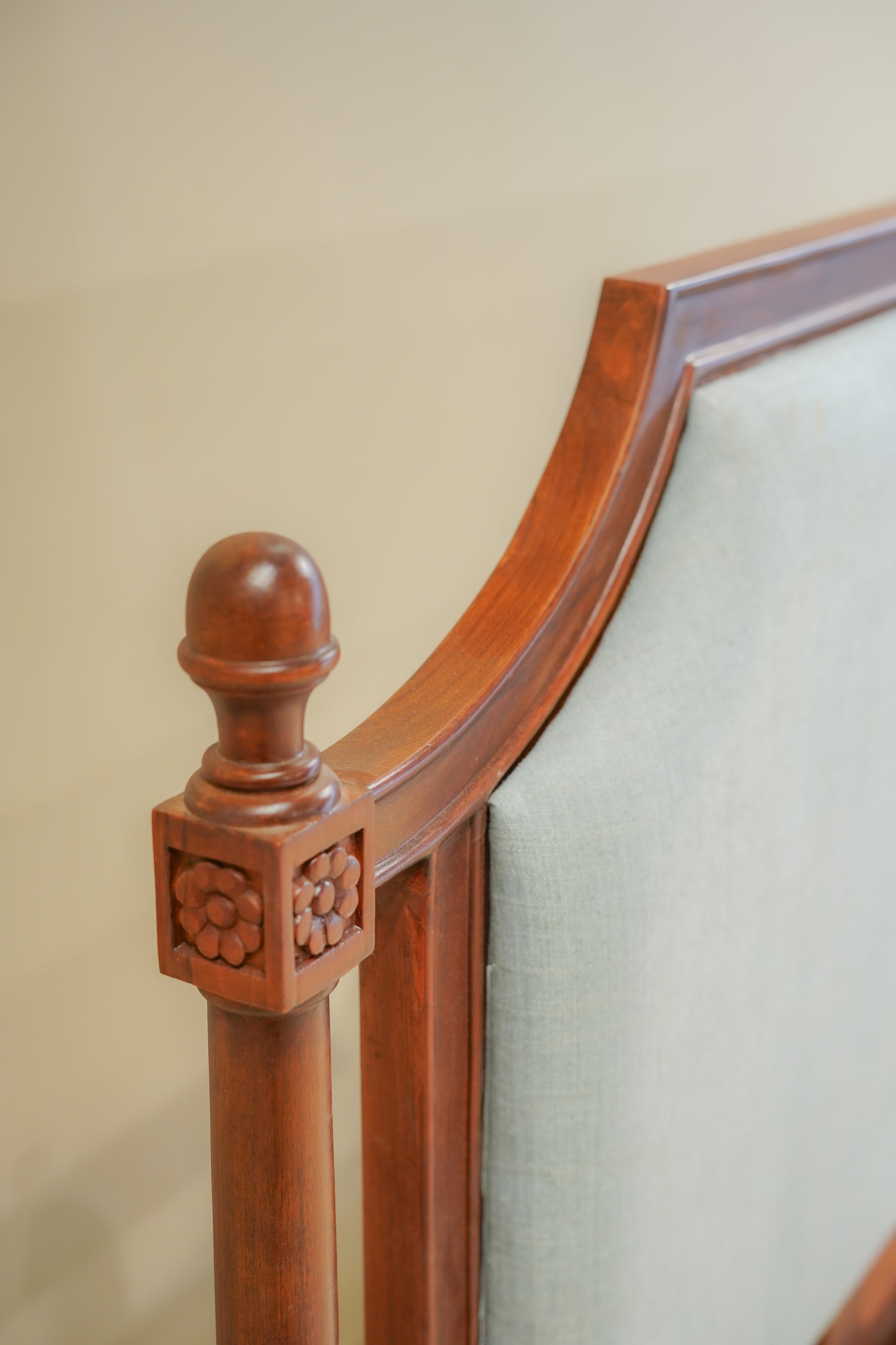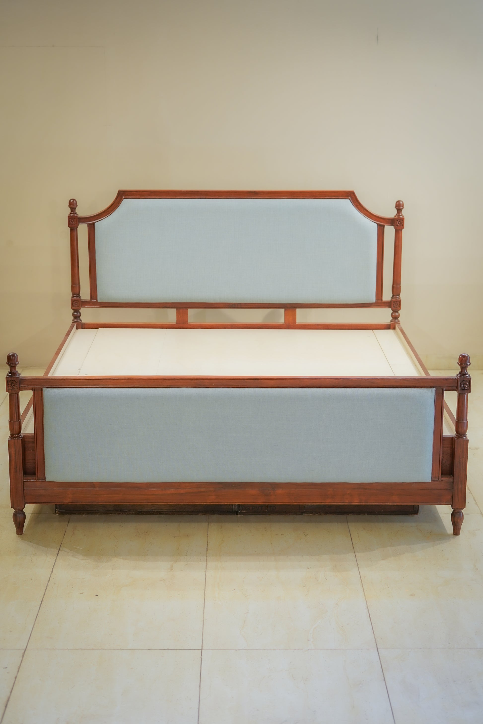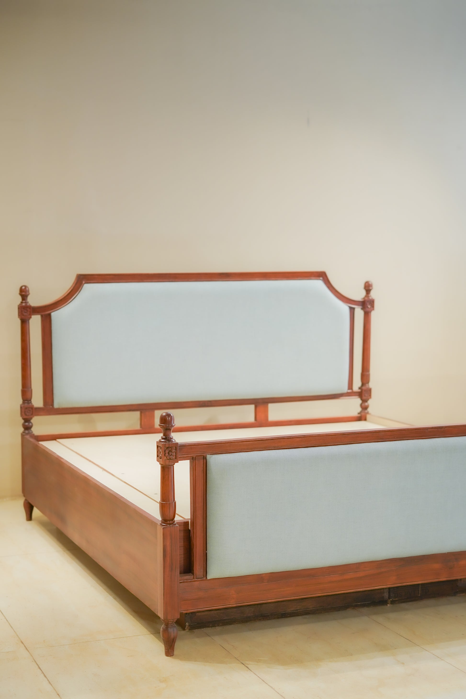 The rosewood polish is deep and romantic—like something aged in silence and smoke. Her finials stand poised, like candle flames caught mid-flicker, while the padded panels promise repose wrapped in grace.