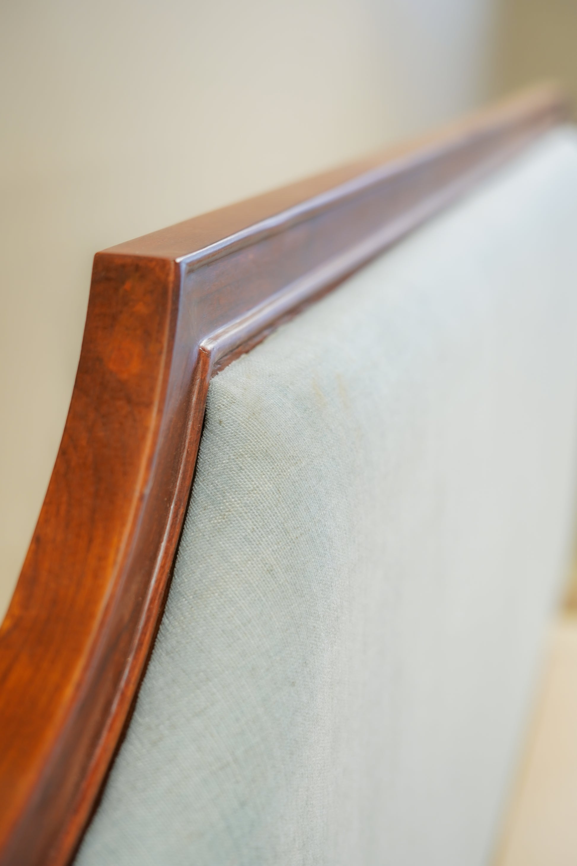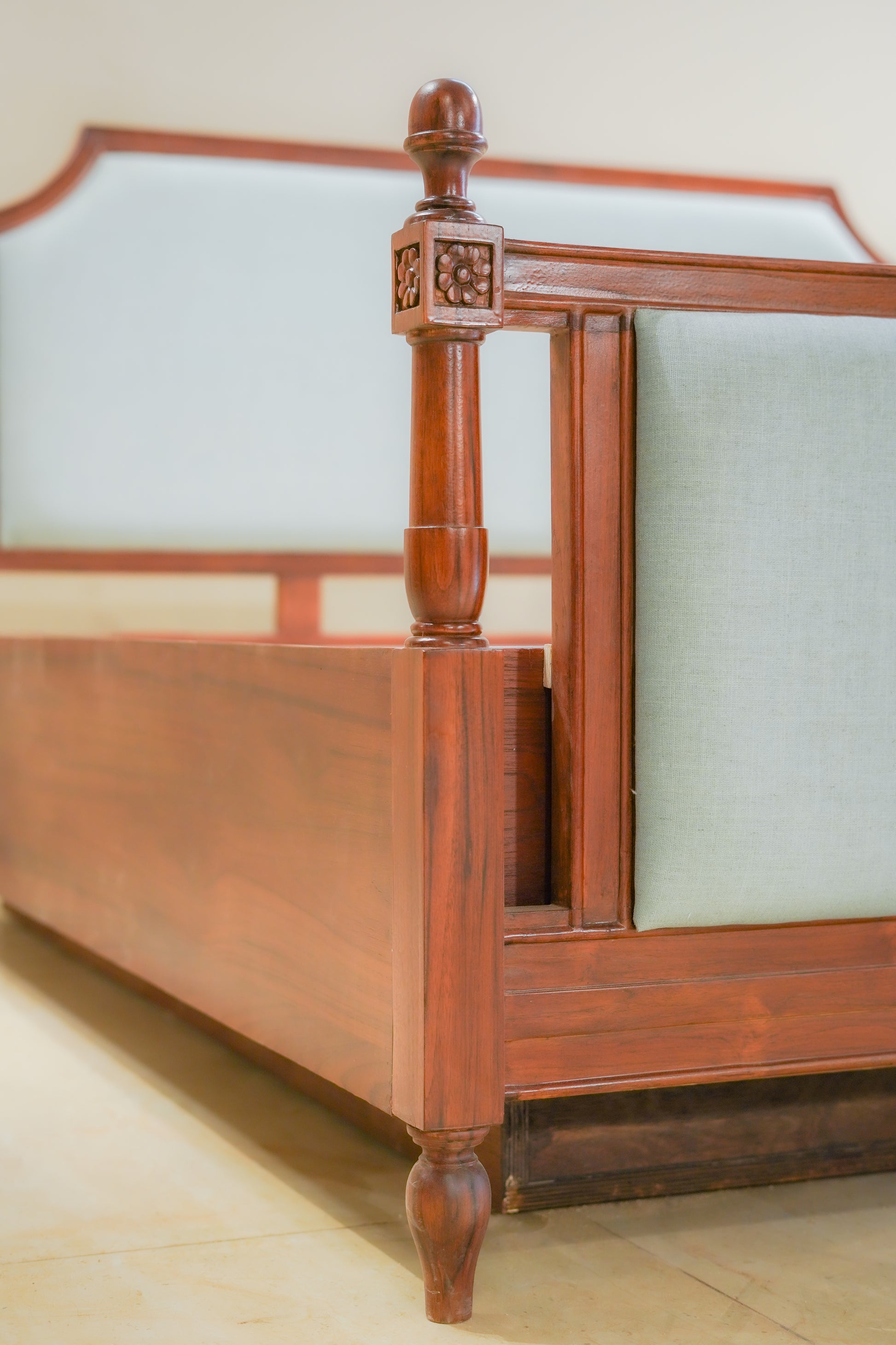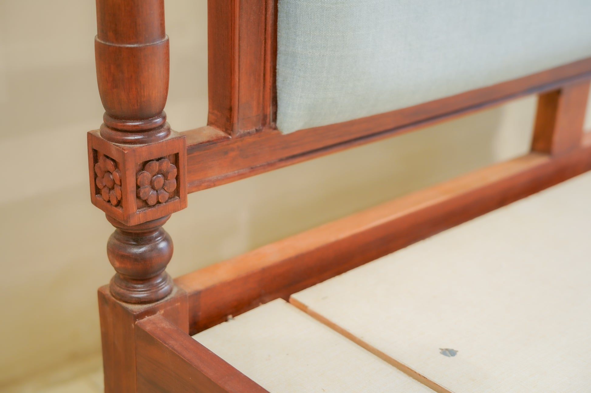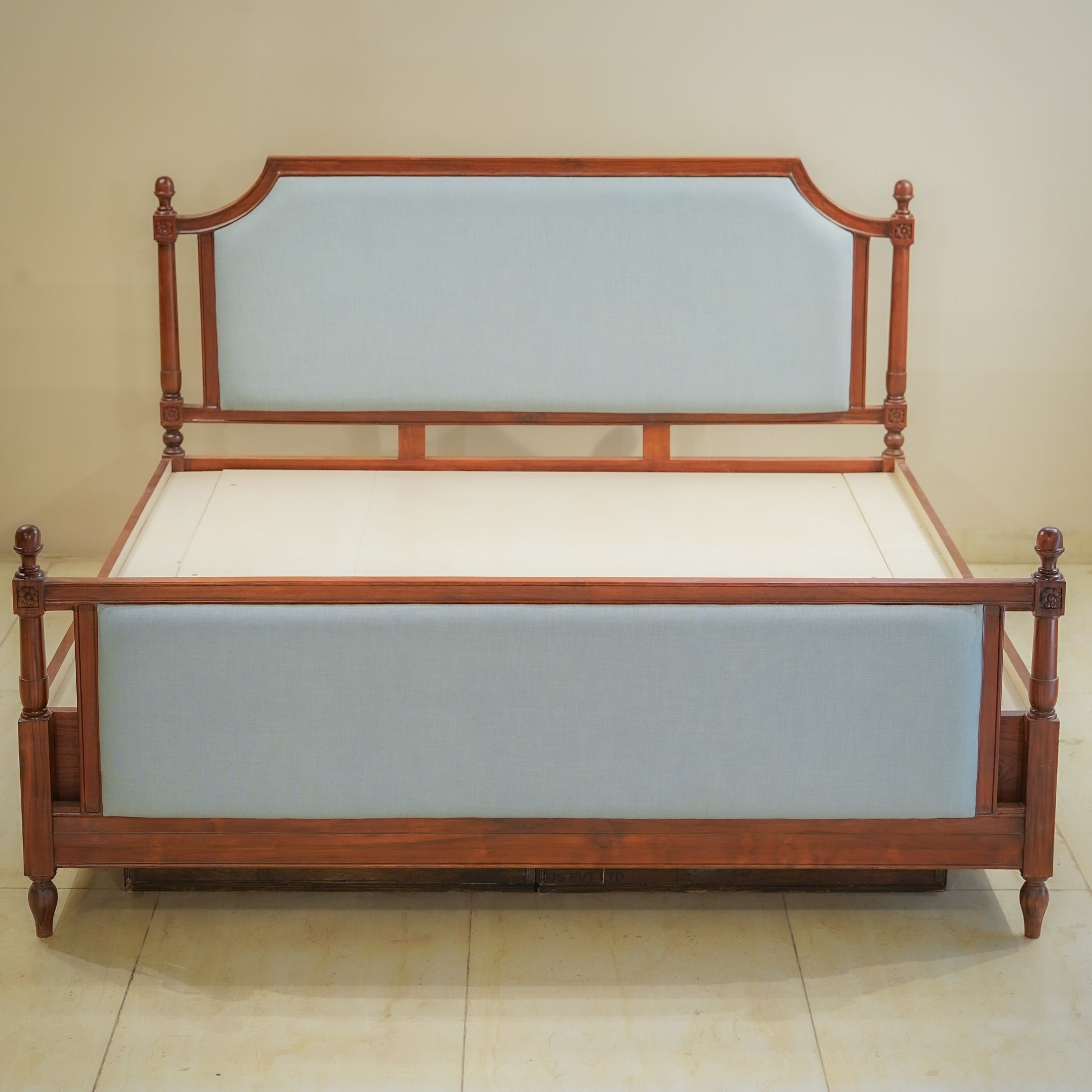 The rosewood polish is deep and romantic—like something aged in silence and smoke. Her finials stand poised, like candle flames caught mid-flicker, while the padded panels promise repose wrapped in grace.