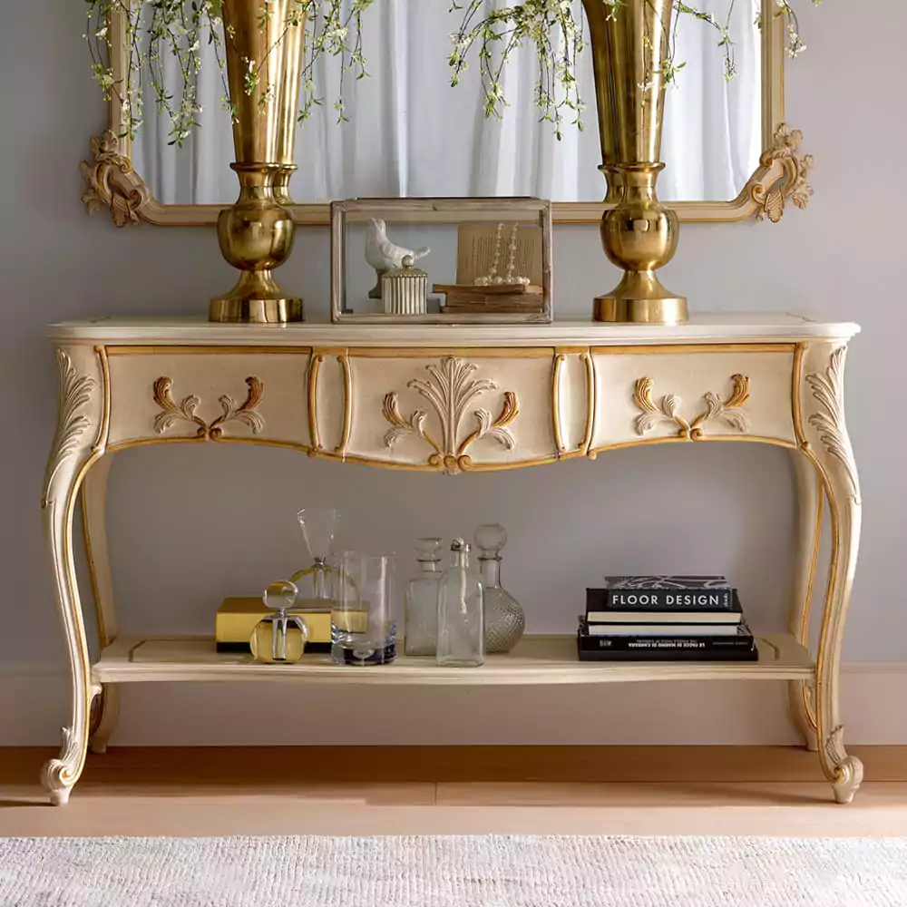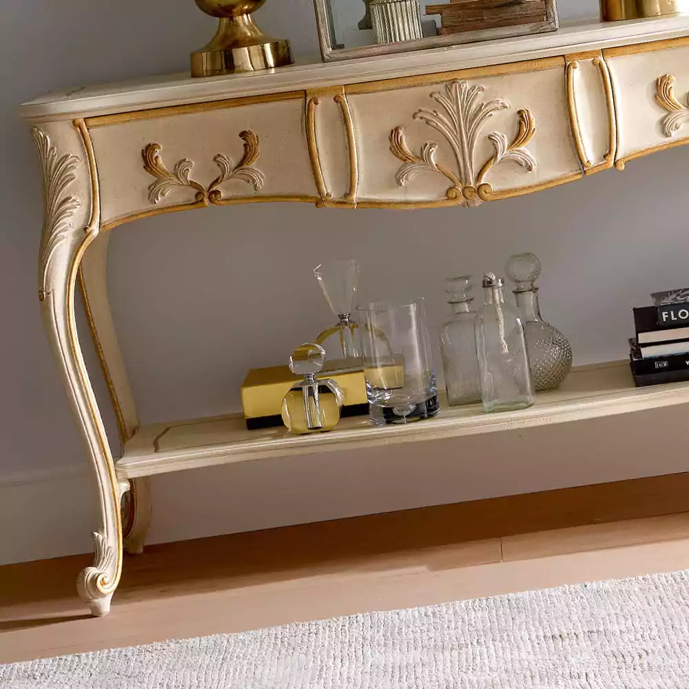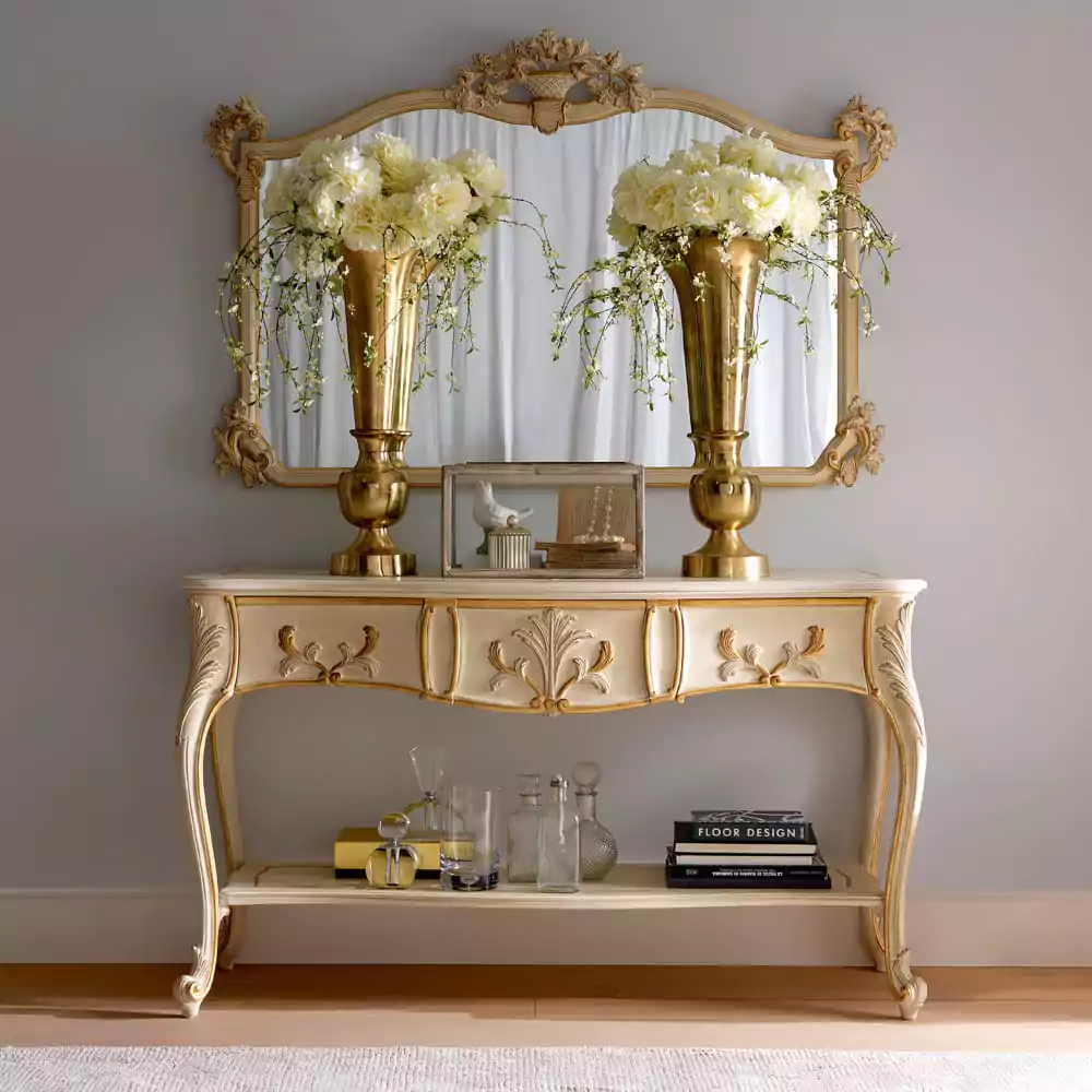 Her console and mirror both extend with purpose, holding space like old architecture softened by time.