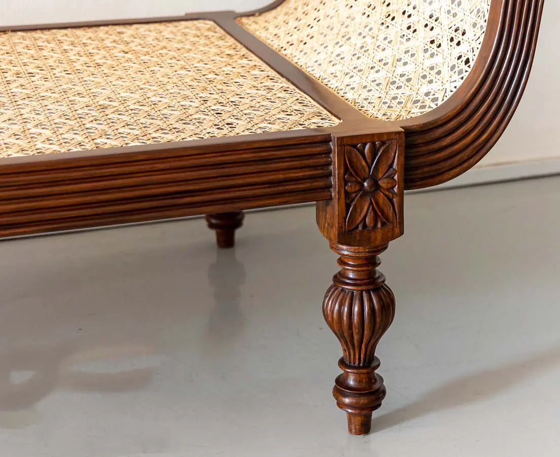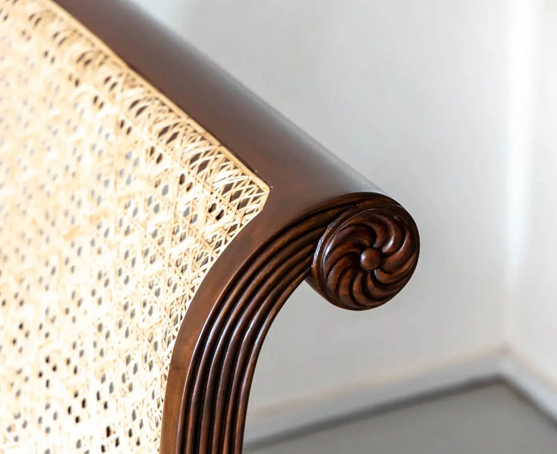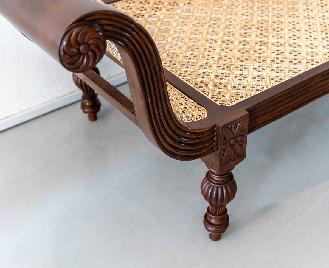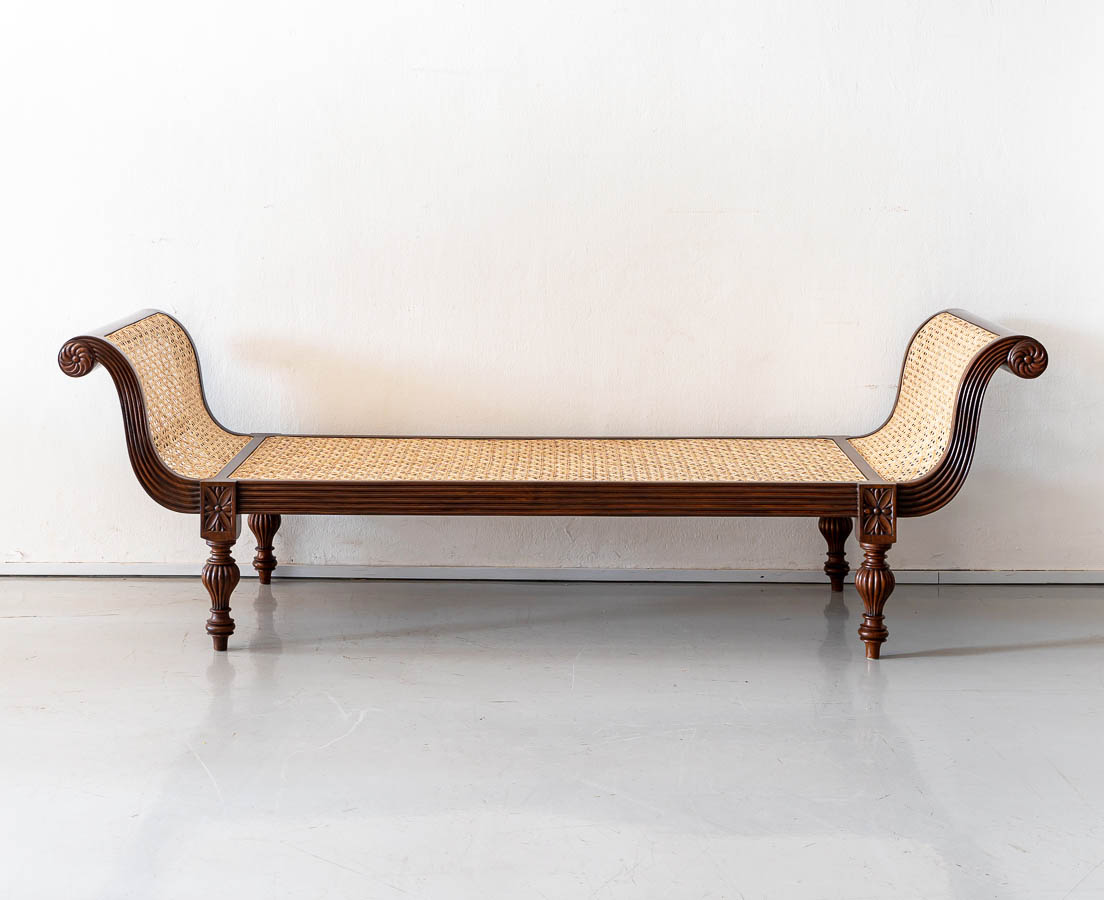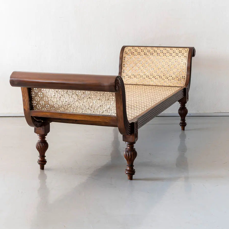 This colonial daybed evokes still afternoons and echoing verandas — with scrolled arms that hold the memory of movement and legs that rise like a sonnet in wood.