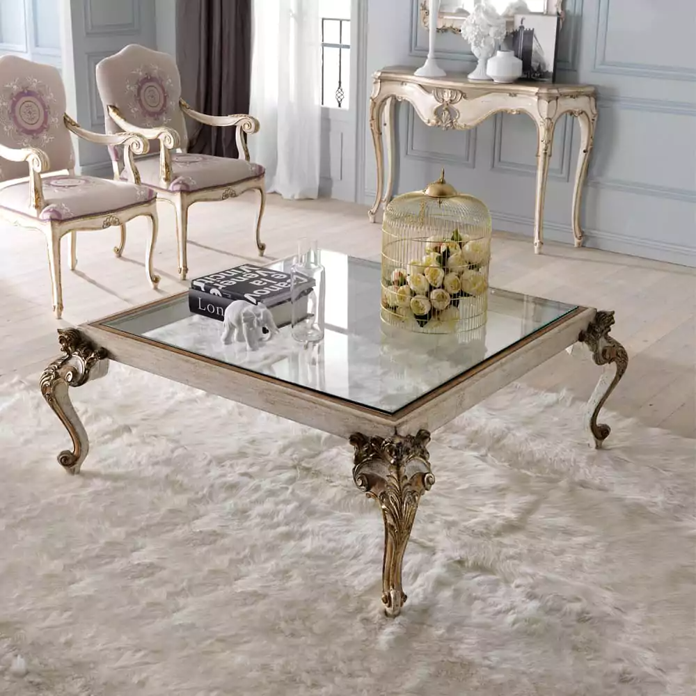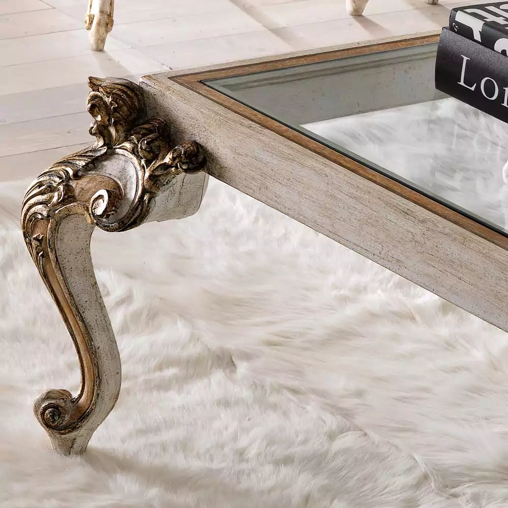 The glass top rests above like a clear sky over architecture, exposing every deliberate angle of her carved legs. The contrast is deliberate: silver and gold, clarity and flourish.