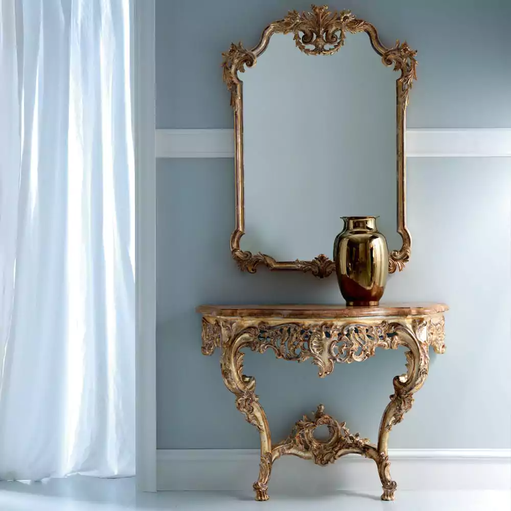A console that clings like a secret whispered to the wall — all curves and carvings, lavish as a love letter left unfinished.