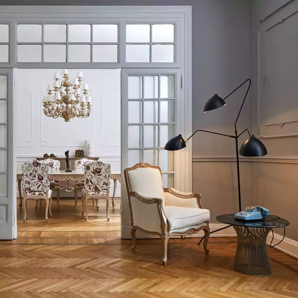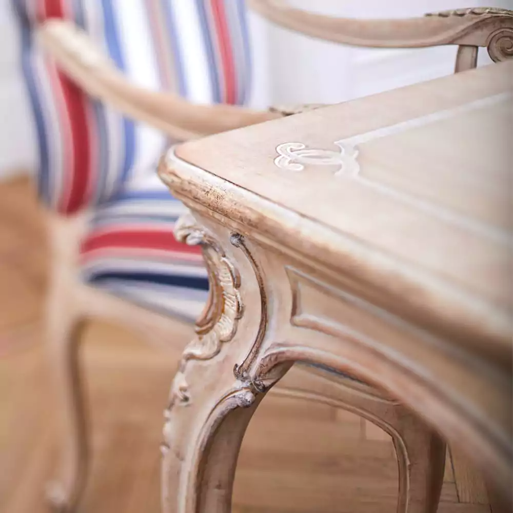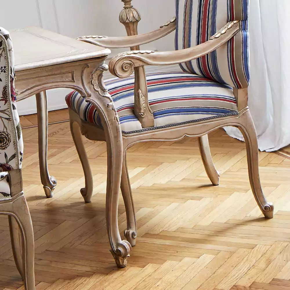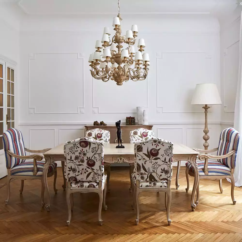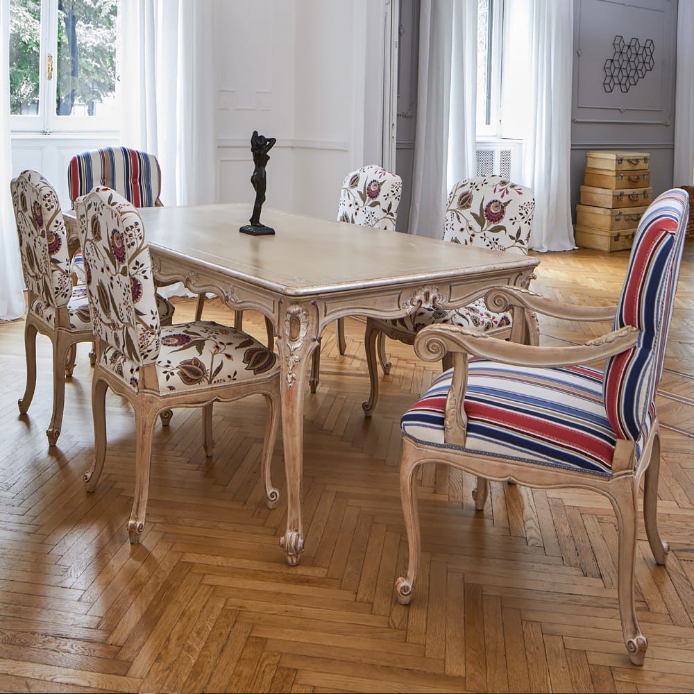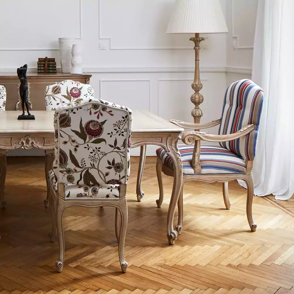 The side chairs bloom with a graceful pattern, while the head chairs wear slender stripes—two styles meeting in perfect accord.