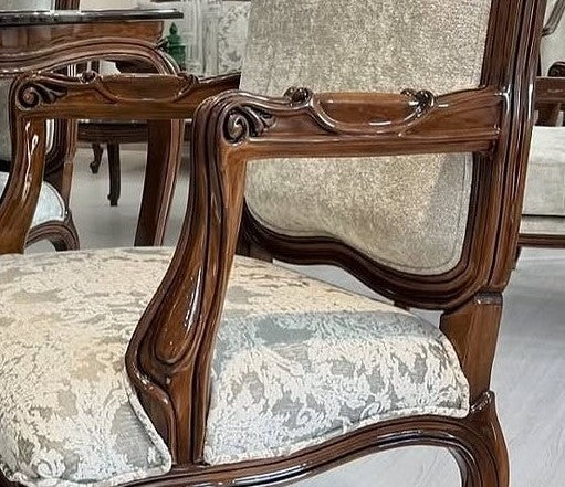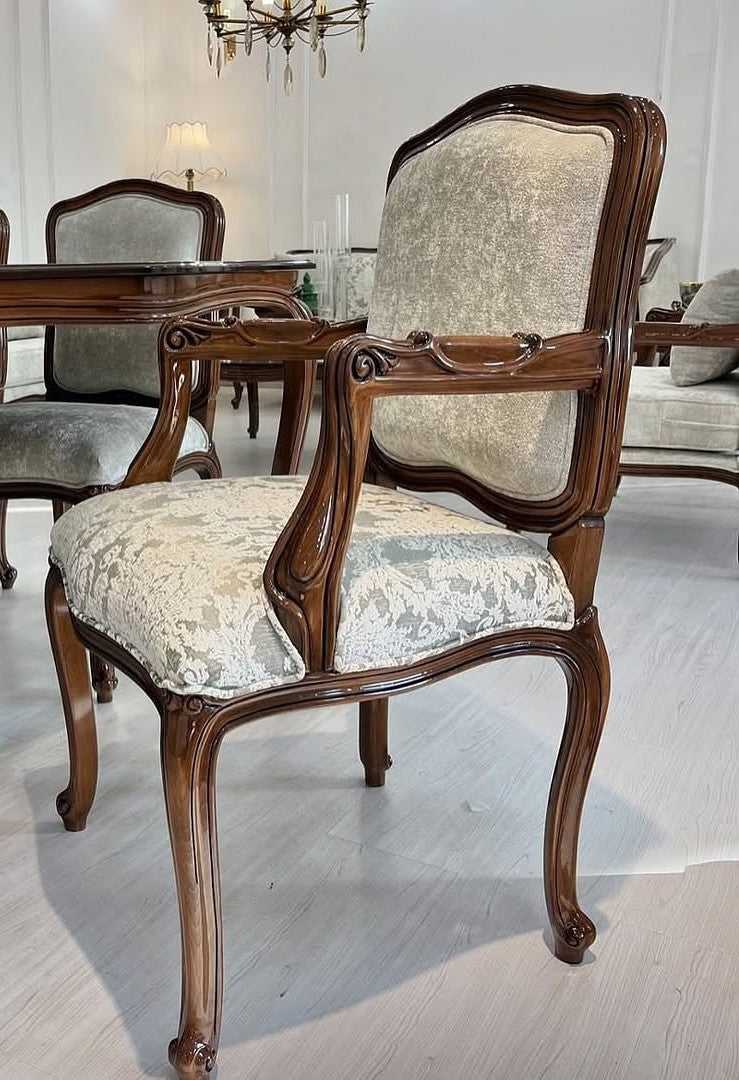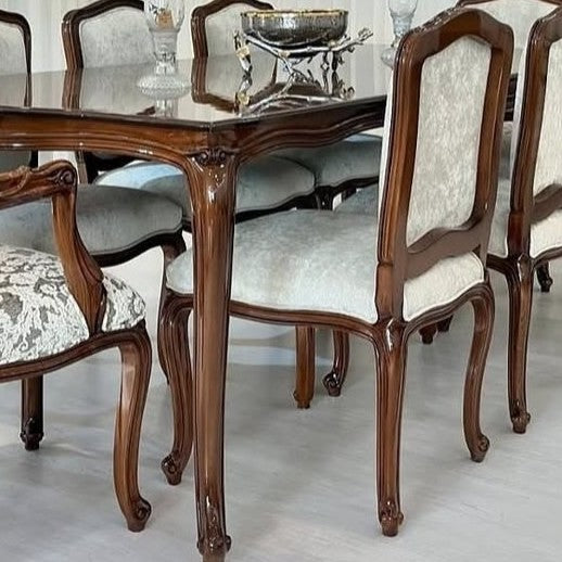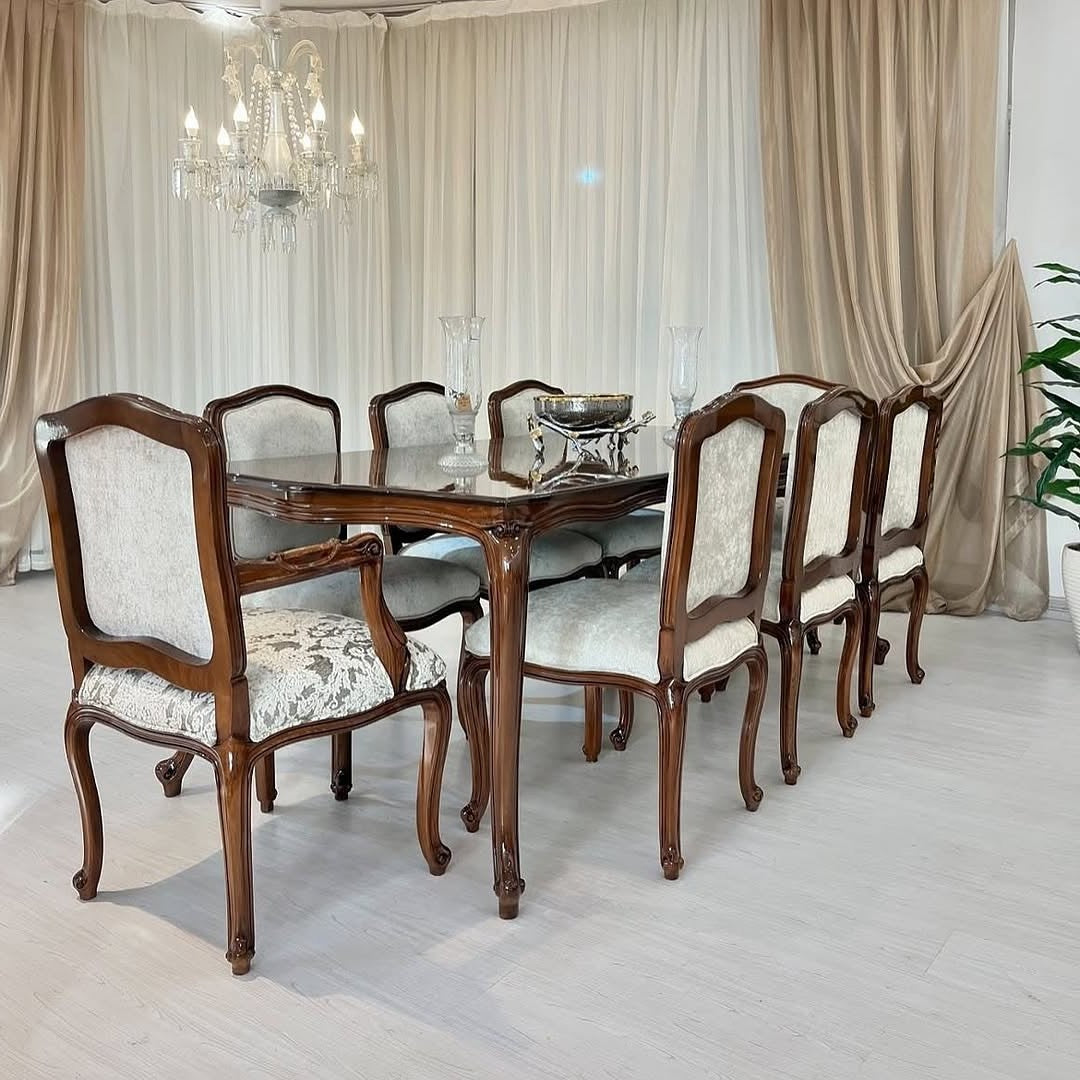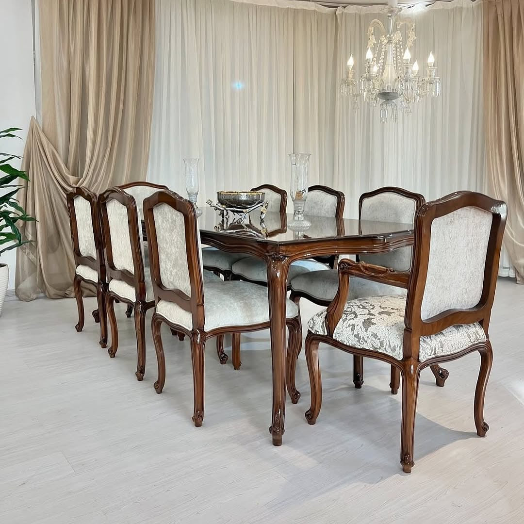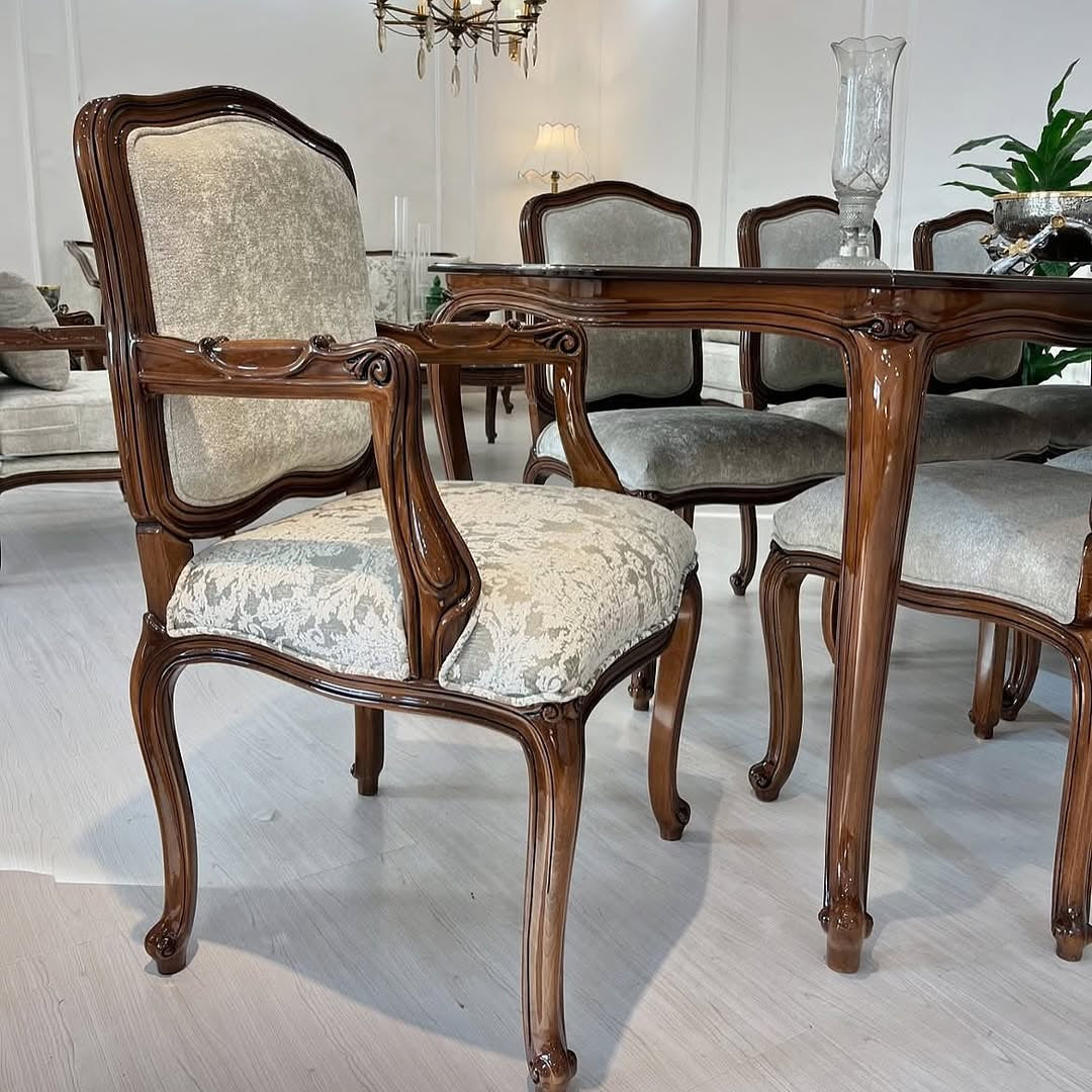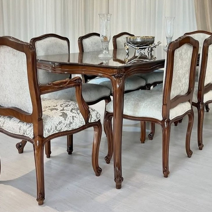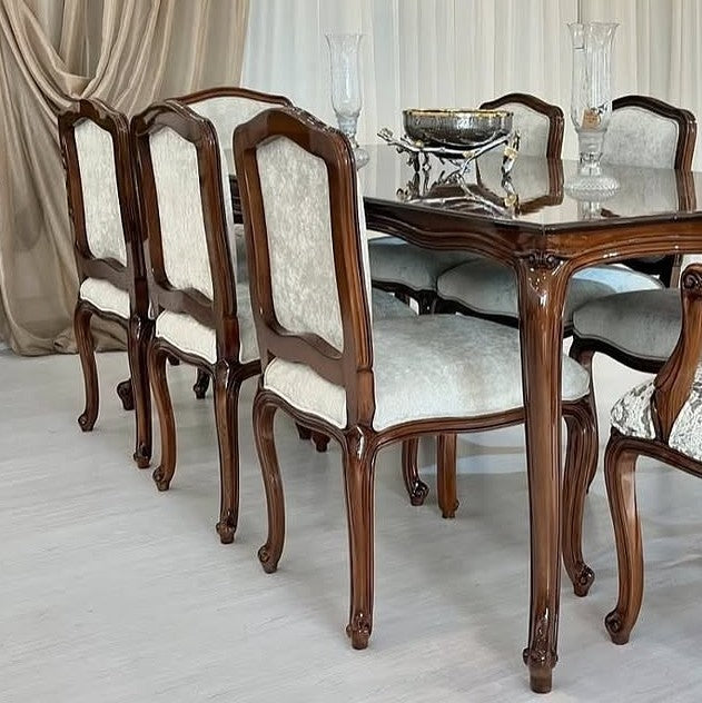 She enters the room like a waltz—poised, polished, and utterly aware of her allure. The table gleams in rich walnut luster, cradled by chairs that wear velvet like memory, their edges carved in sweeping cadence.