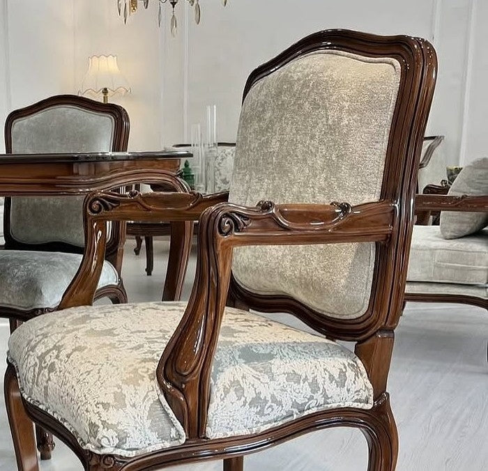 Scroll arms and cabriole legs speak a fluent French—each detail rendered with discipline, each joint born of a craftsman's hush.