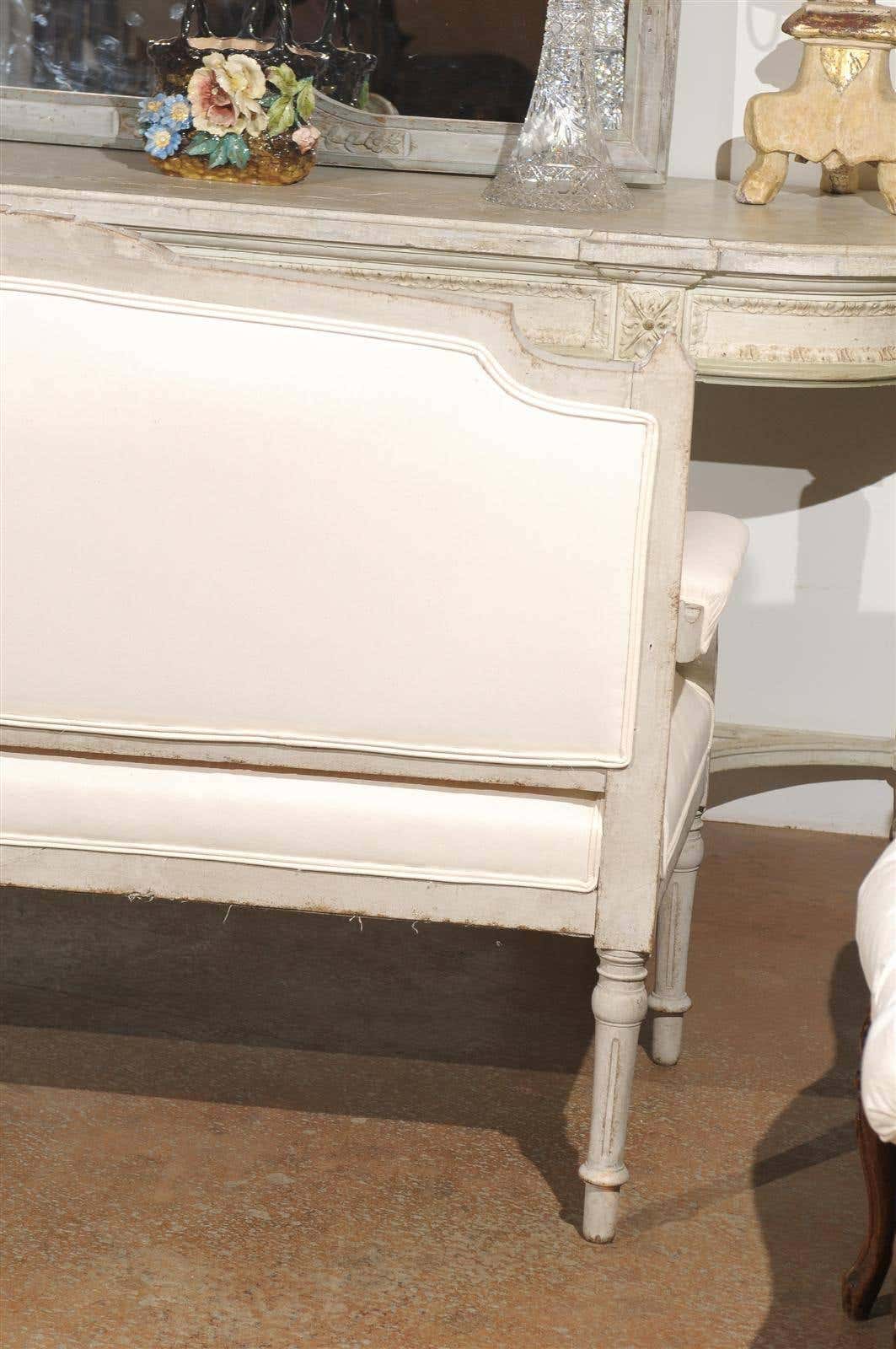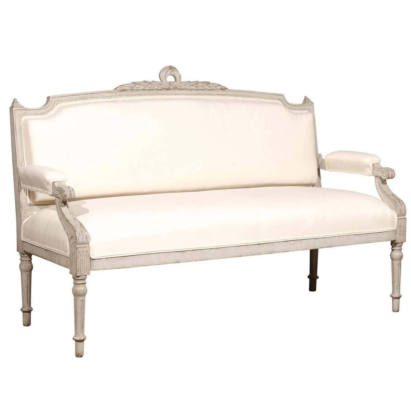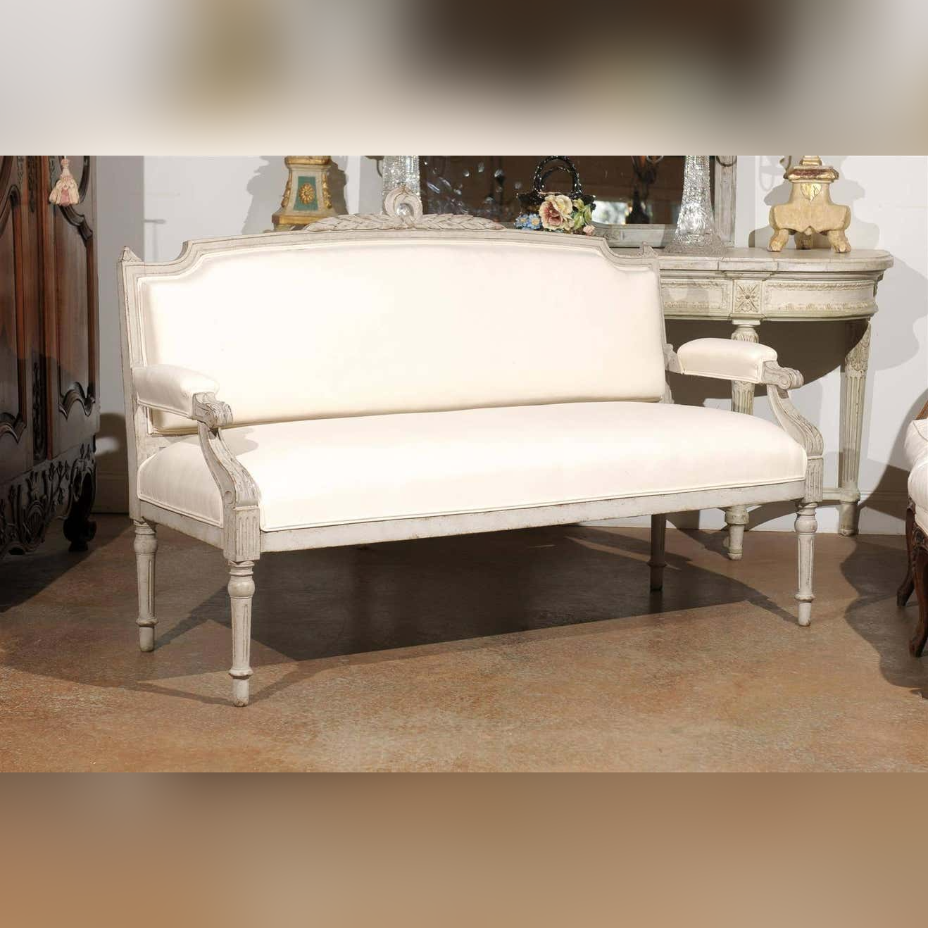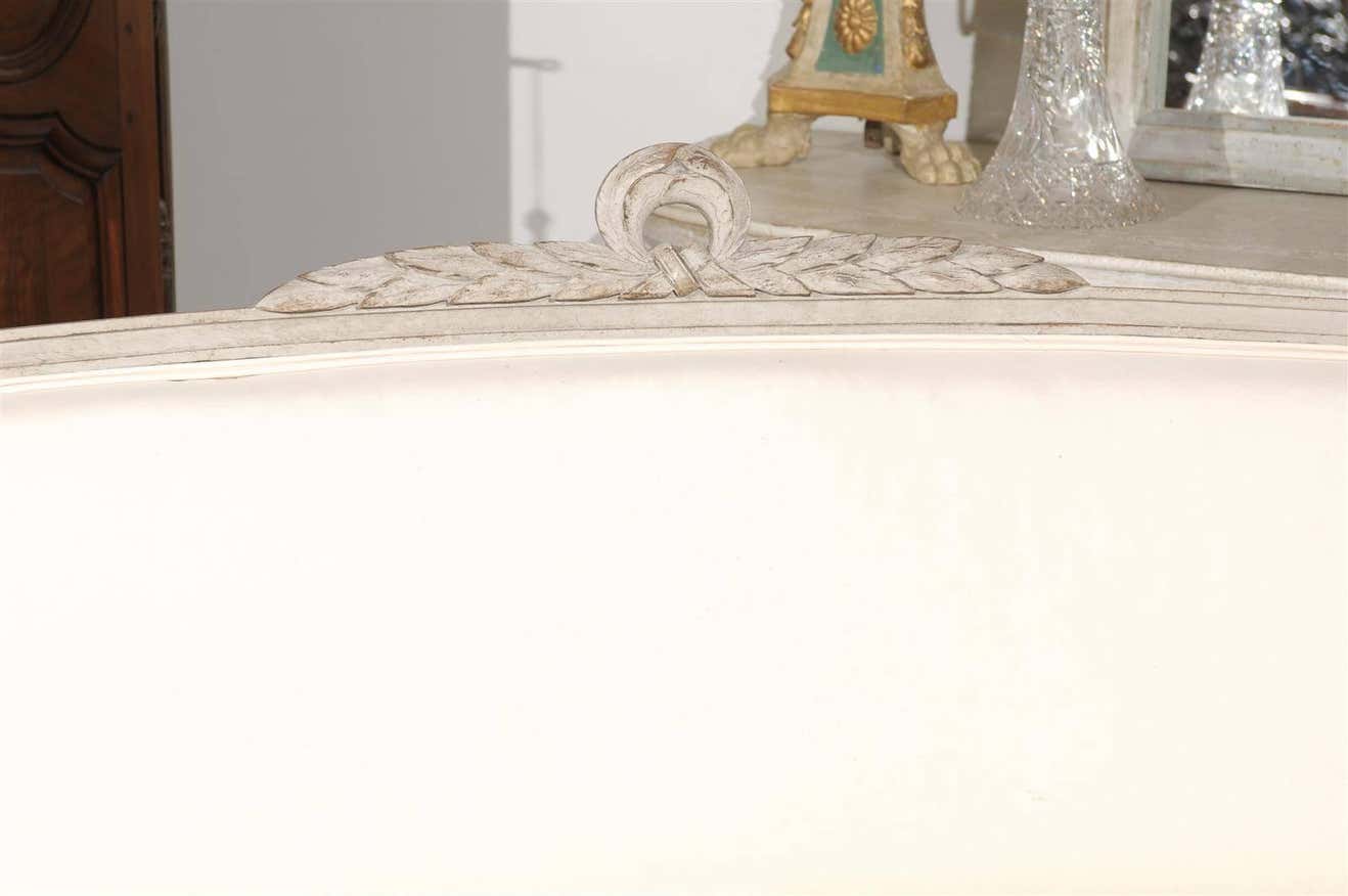 The whitewashed frame, subtly distressed, reveals soft carvings that speak of old-world gentility—never loud, always graceful.
