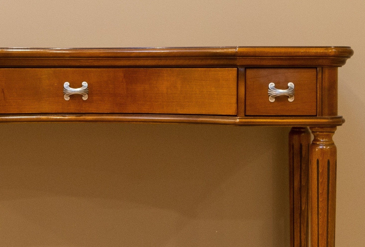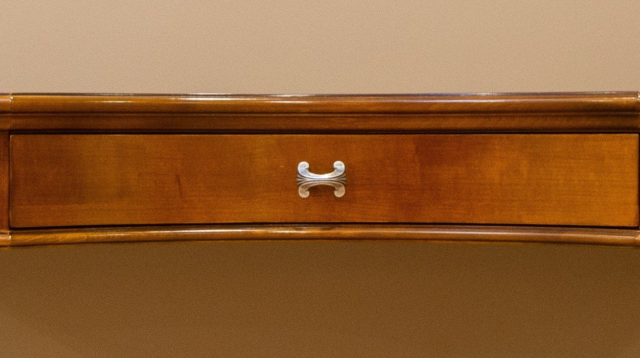 Her body stretches with grace, three slender drawers lining the top like a thoughtful pause, each one adorned with silver handles that gleam like moonlight on wood.