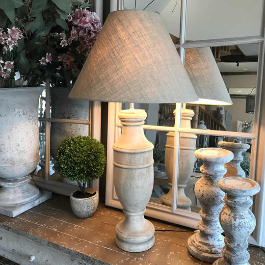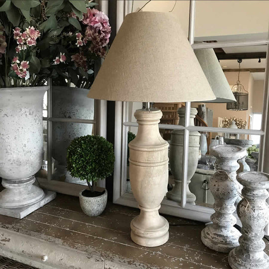 Its sculpted base—reminiscent of weathered urns along a château terrace—anchors the soft taper of its natural shade, diffusing a golden, grainy glow.