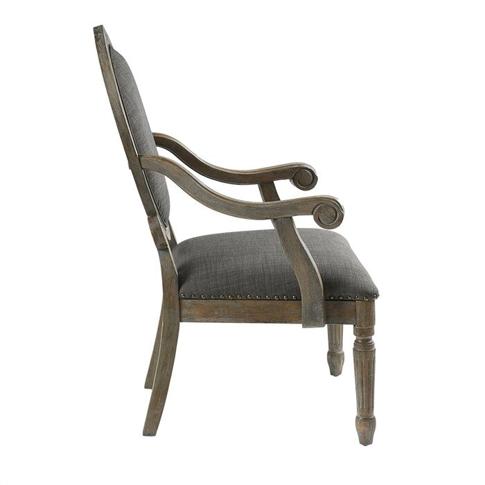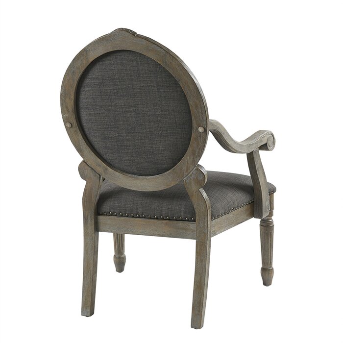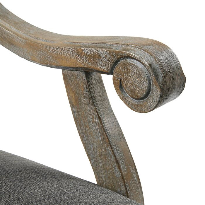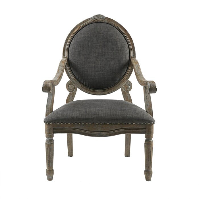 Arms curve like whispers of an old tale, their contours sculpted with a quiet confidence. An oval back rests against time itself, in tones of twilight grey, dignified and unhurried.