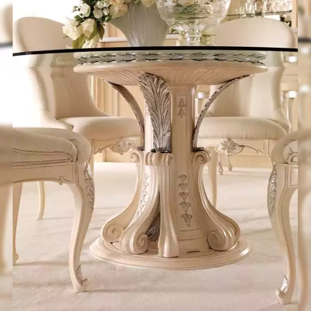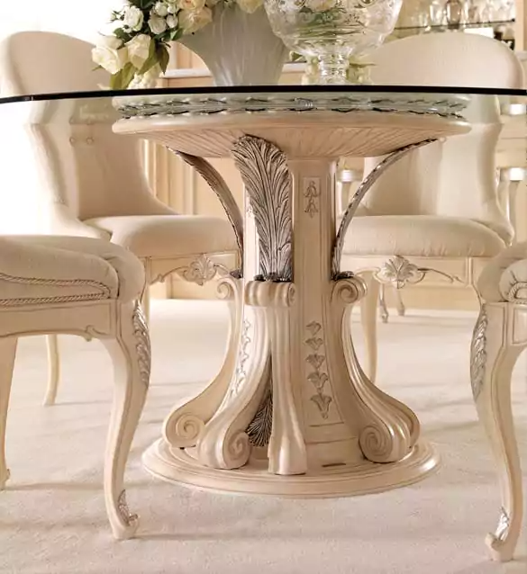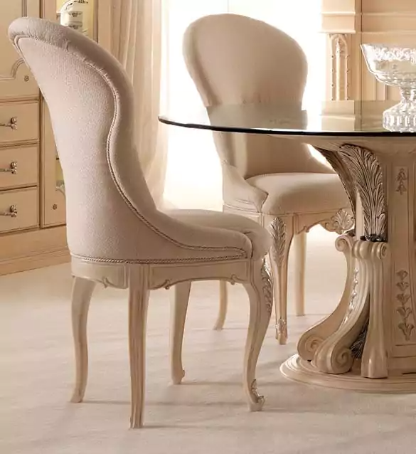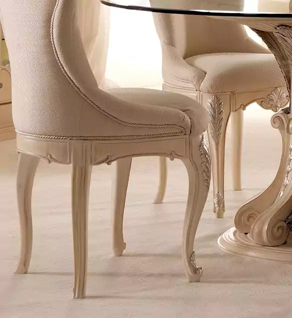 Her chairs, pale and graceful, hold their own quiet grandeur—each detail kissed with silver, each curve a whisper of old-world craft.