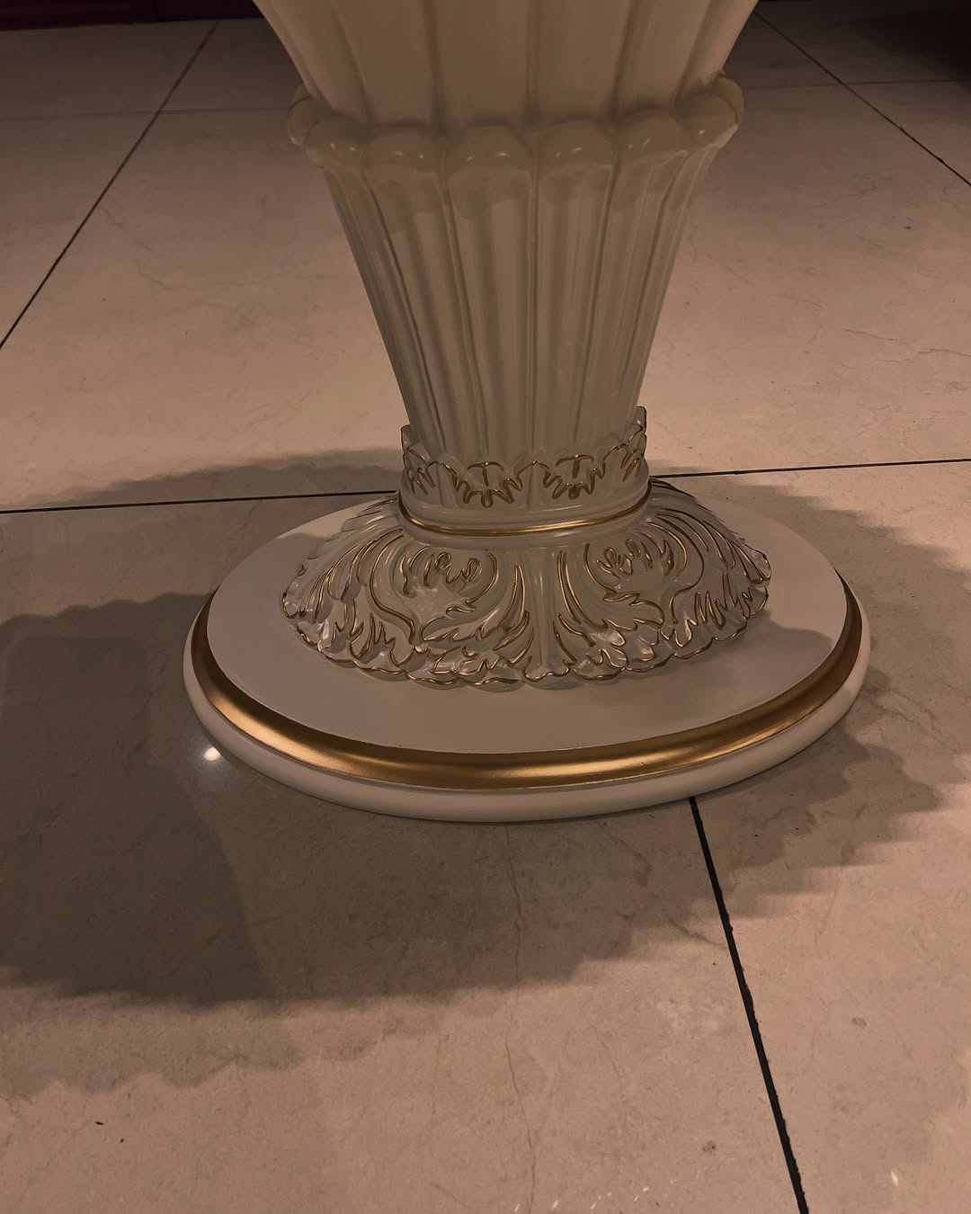 Her base twists in white, like a bleached trunk kissed by gold, with branches that stretch outward, curling into a wreath of light and shadow.