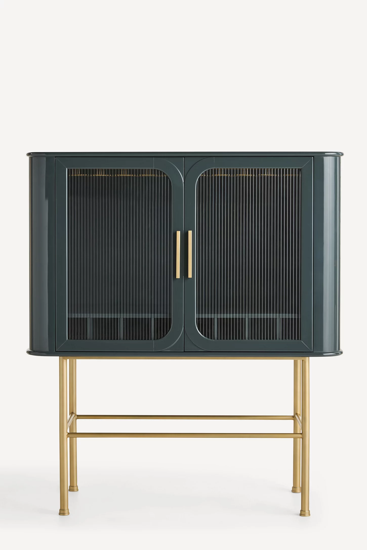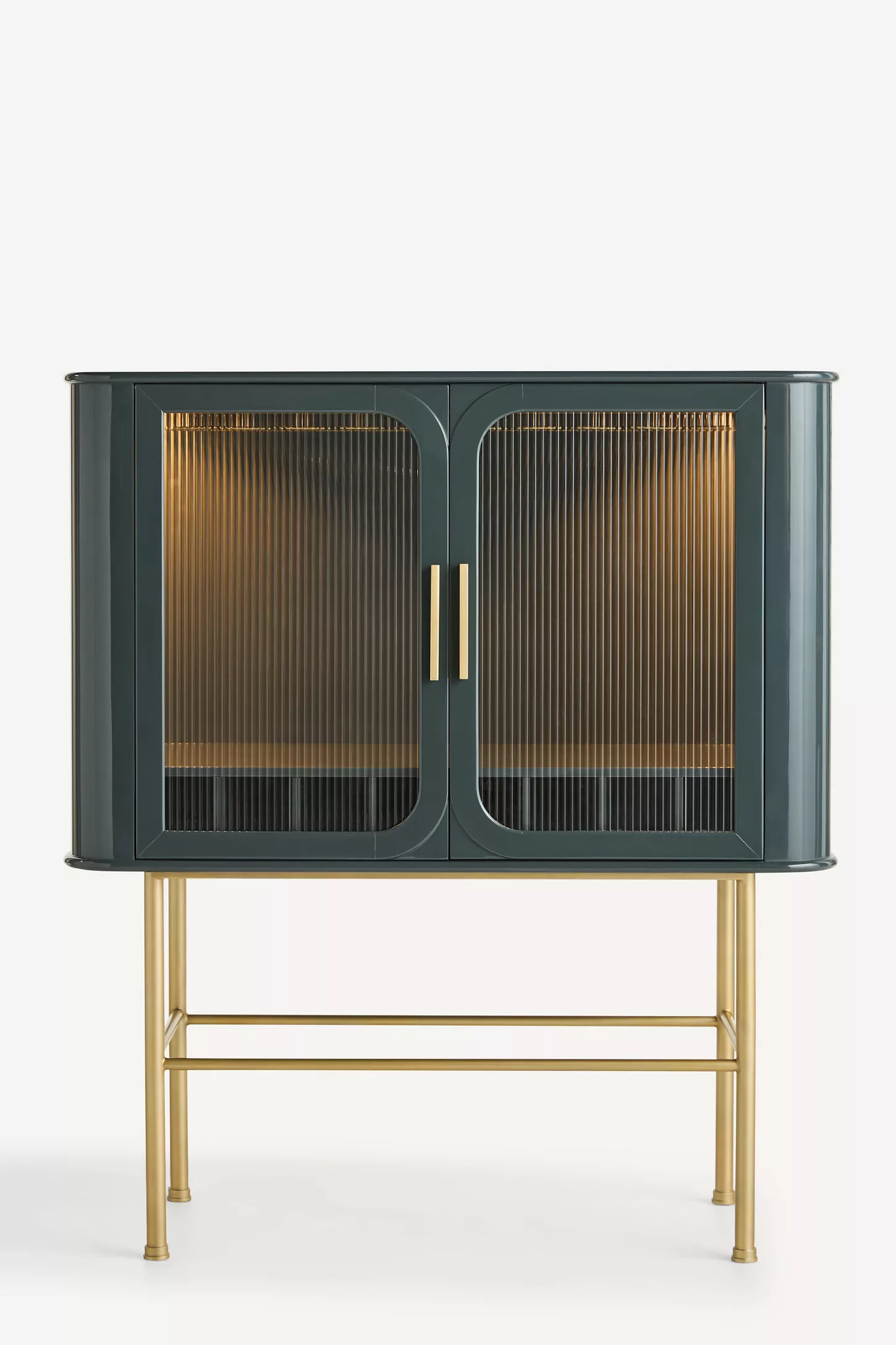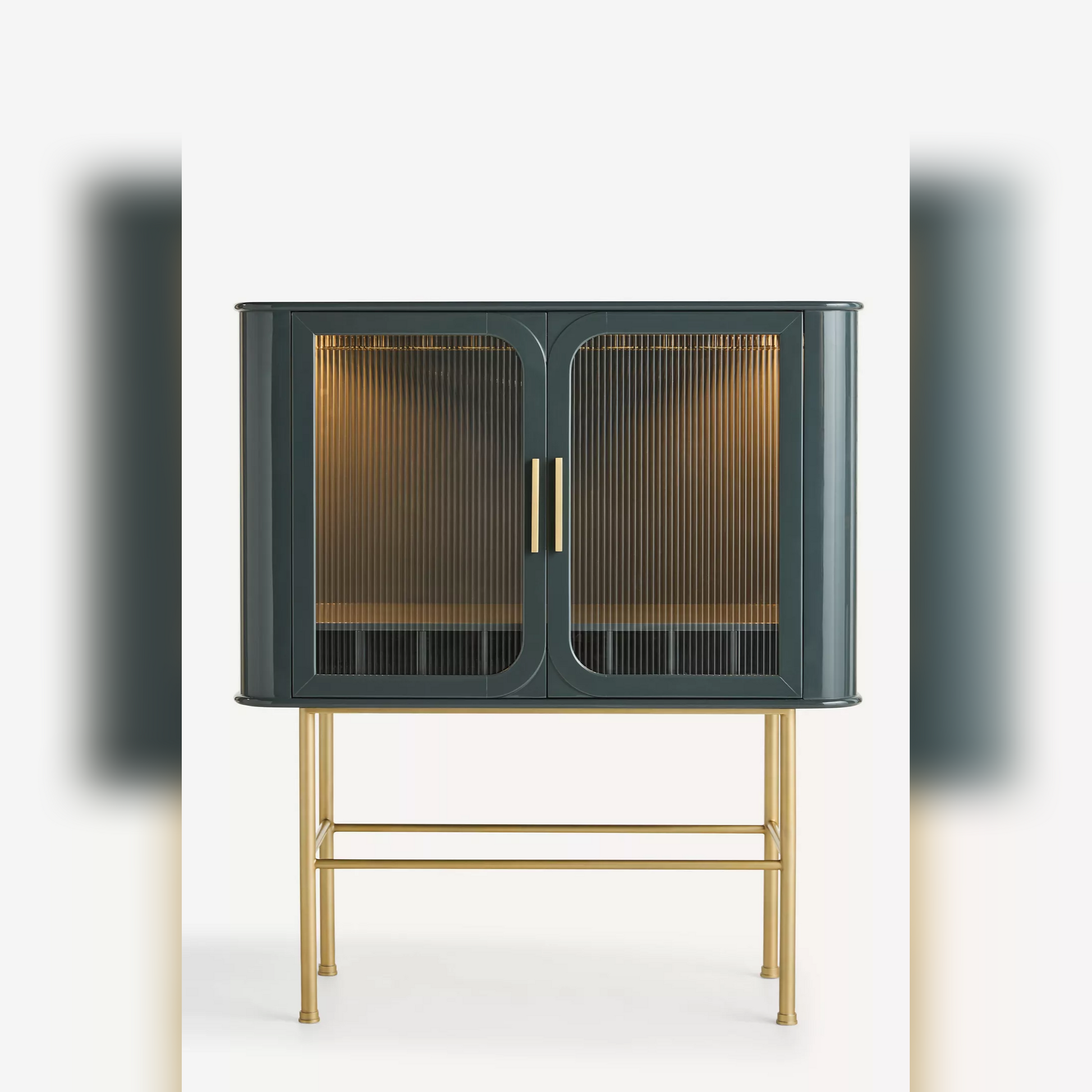 Fluted glass doors soften the glow within, a delicate veil over the treasures she holds.