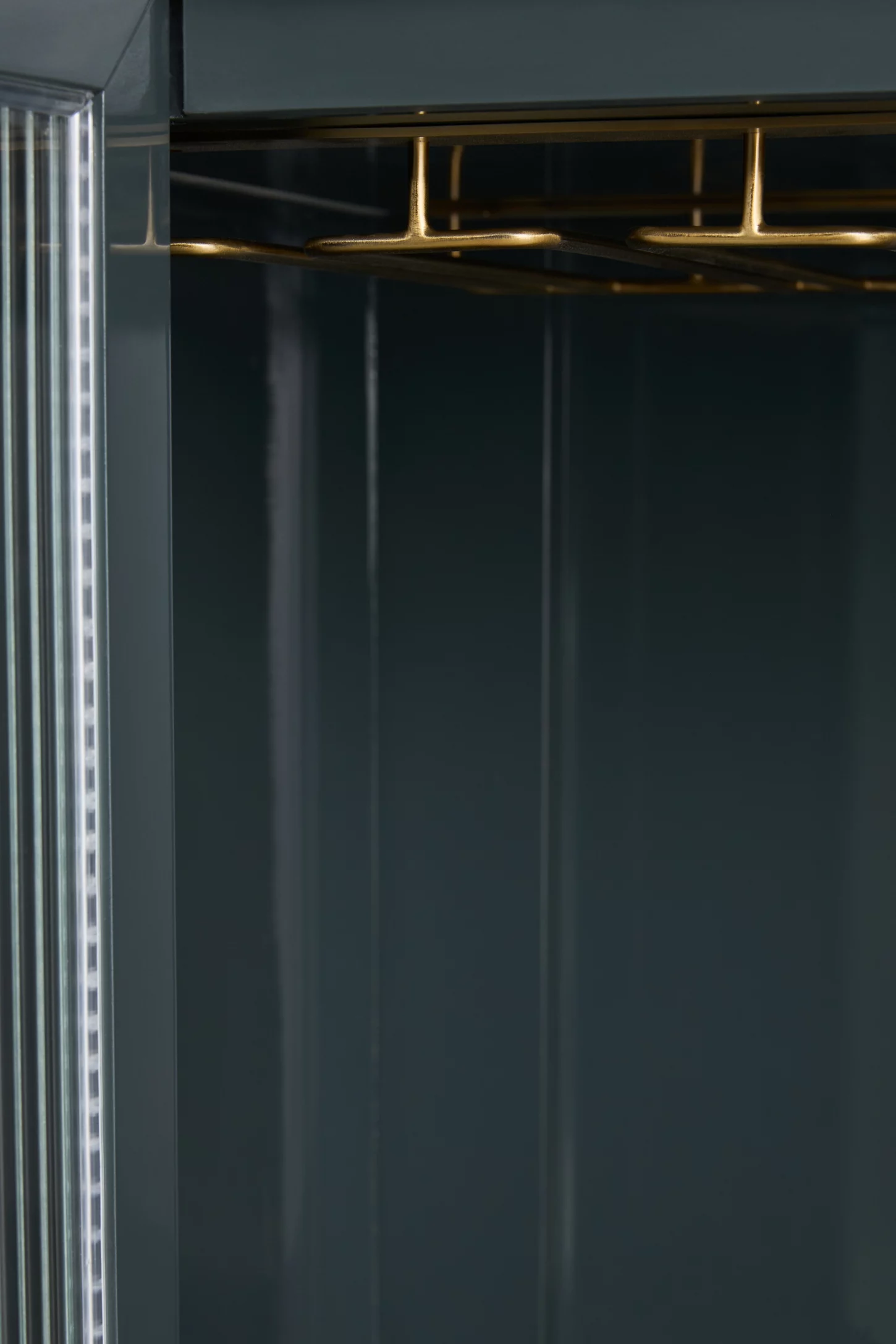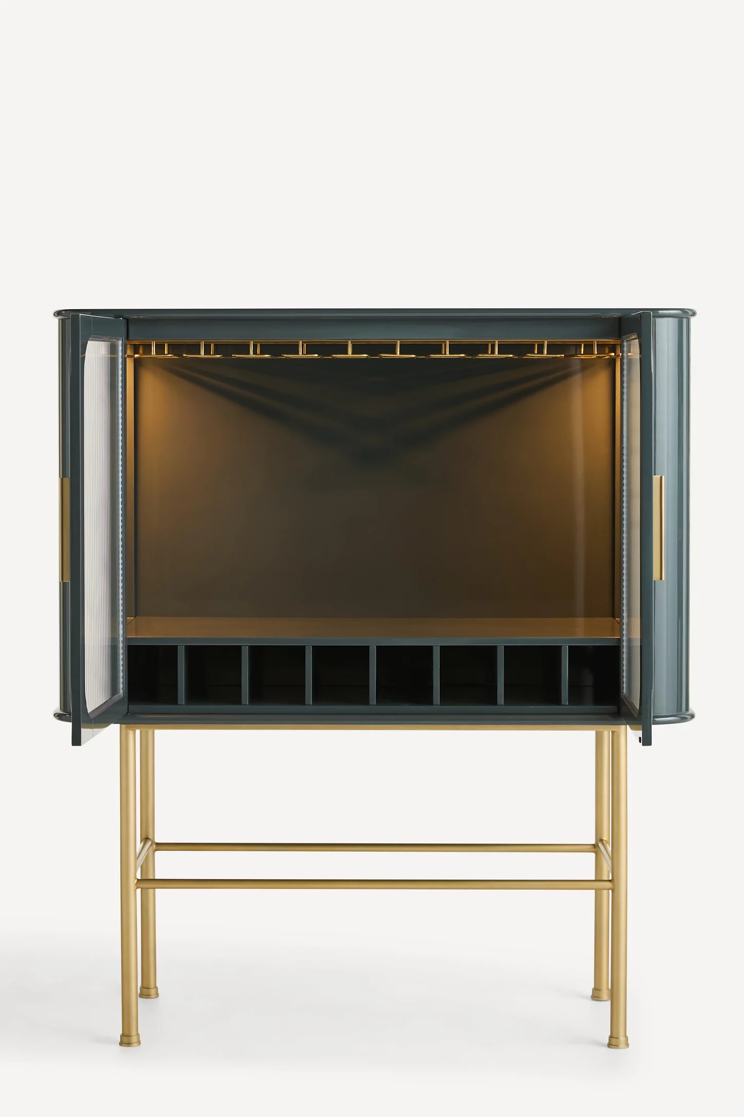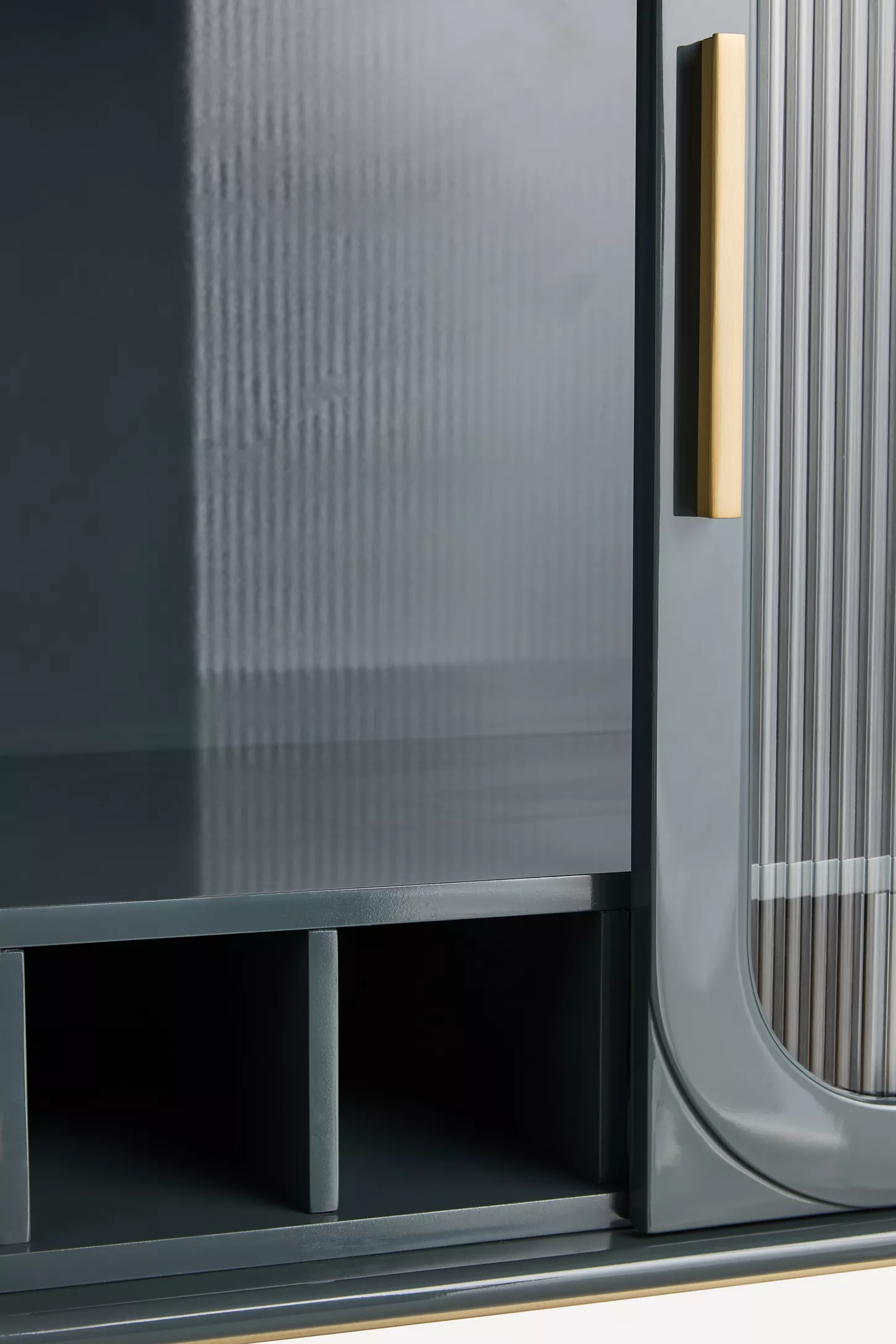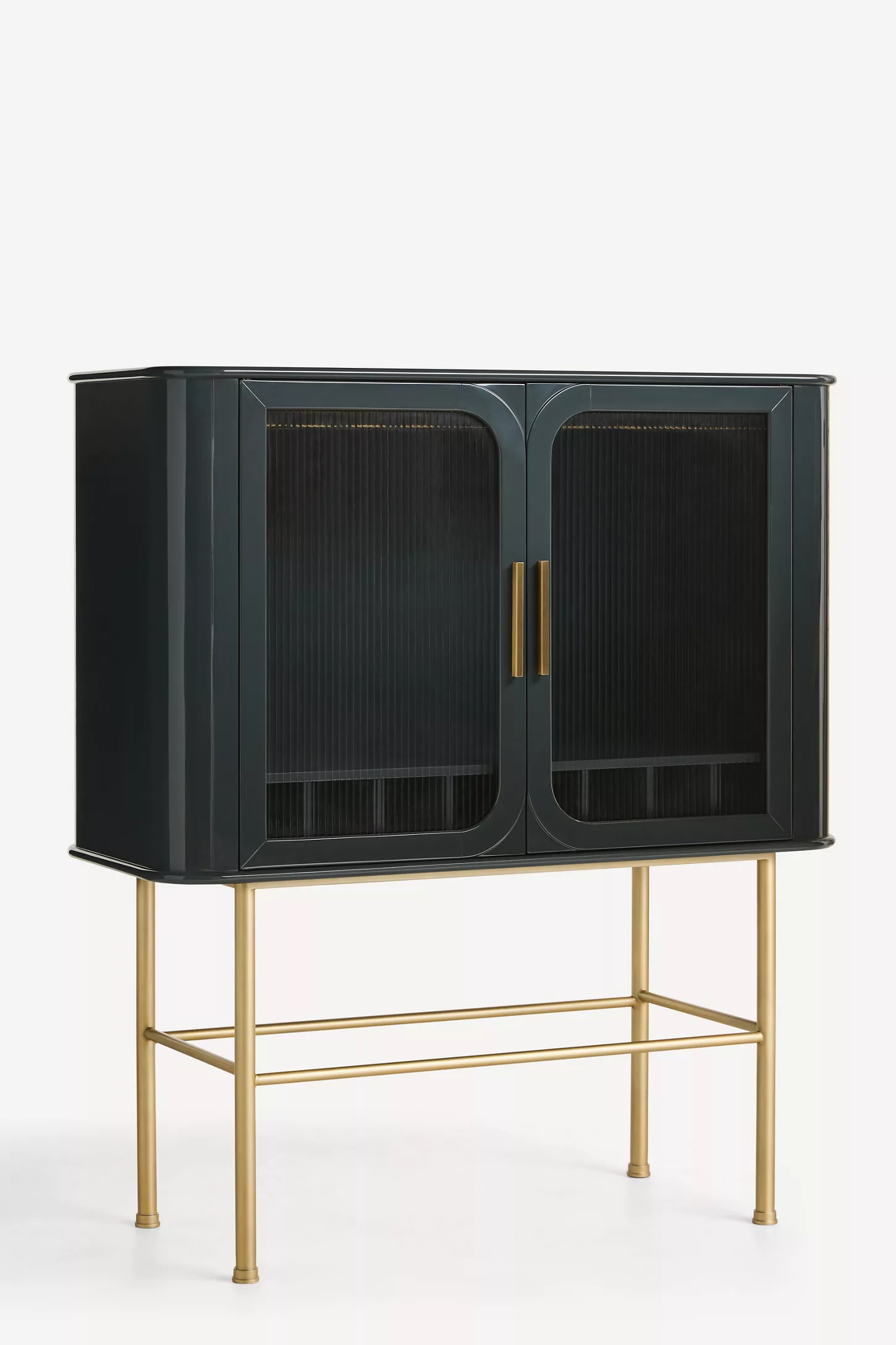 Fluted glass doors soften the glow within, a delicate veil over the treasures she holds.