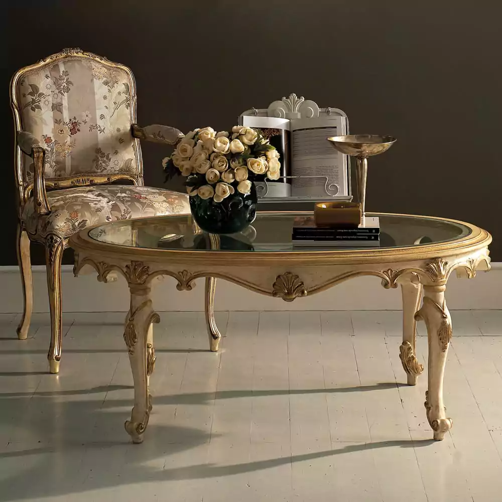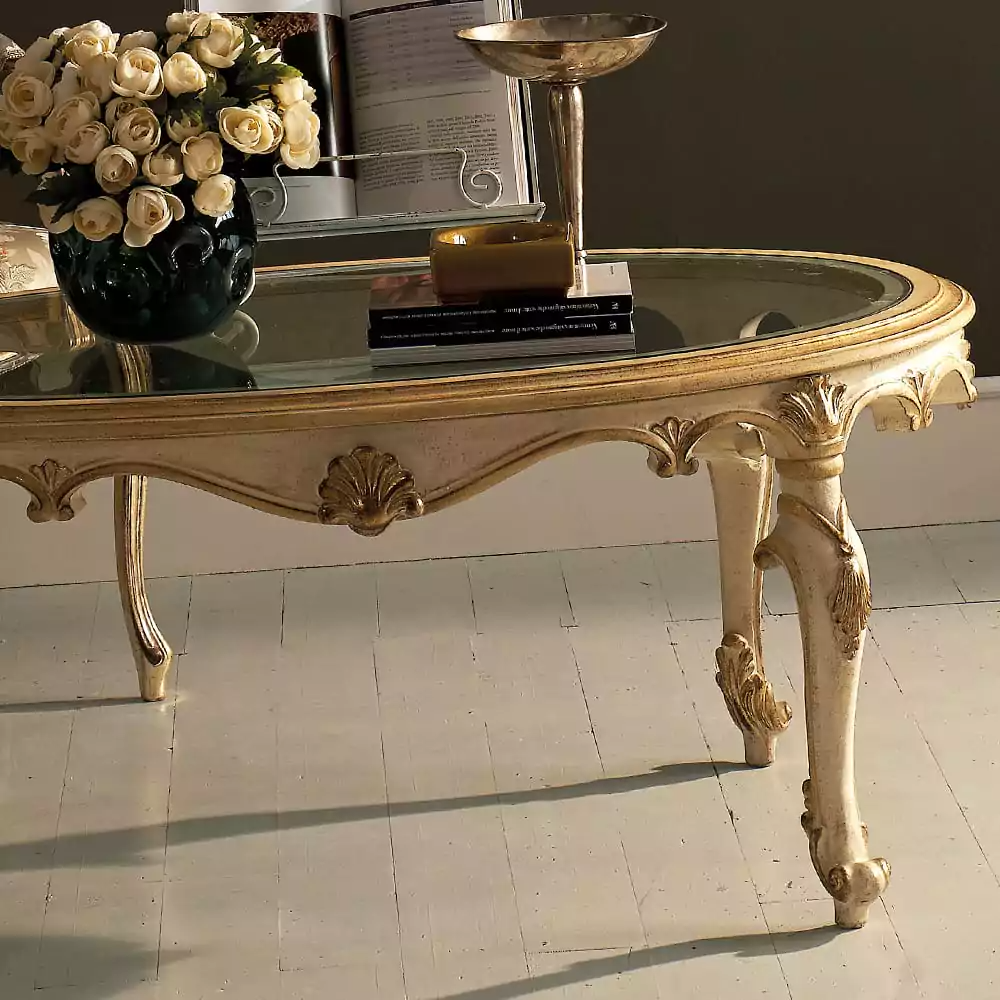 Élanthéa curves like a dream drawn in gold—her oval glass top reflecting the room in whispers, her carved body wrapped in a creamy sand-rich finish brushed ever so gently with gilded breath.