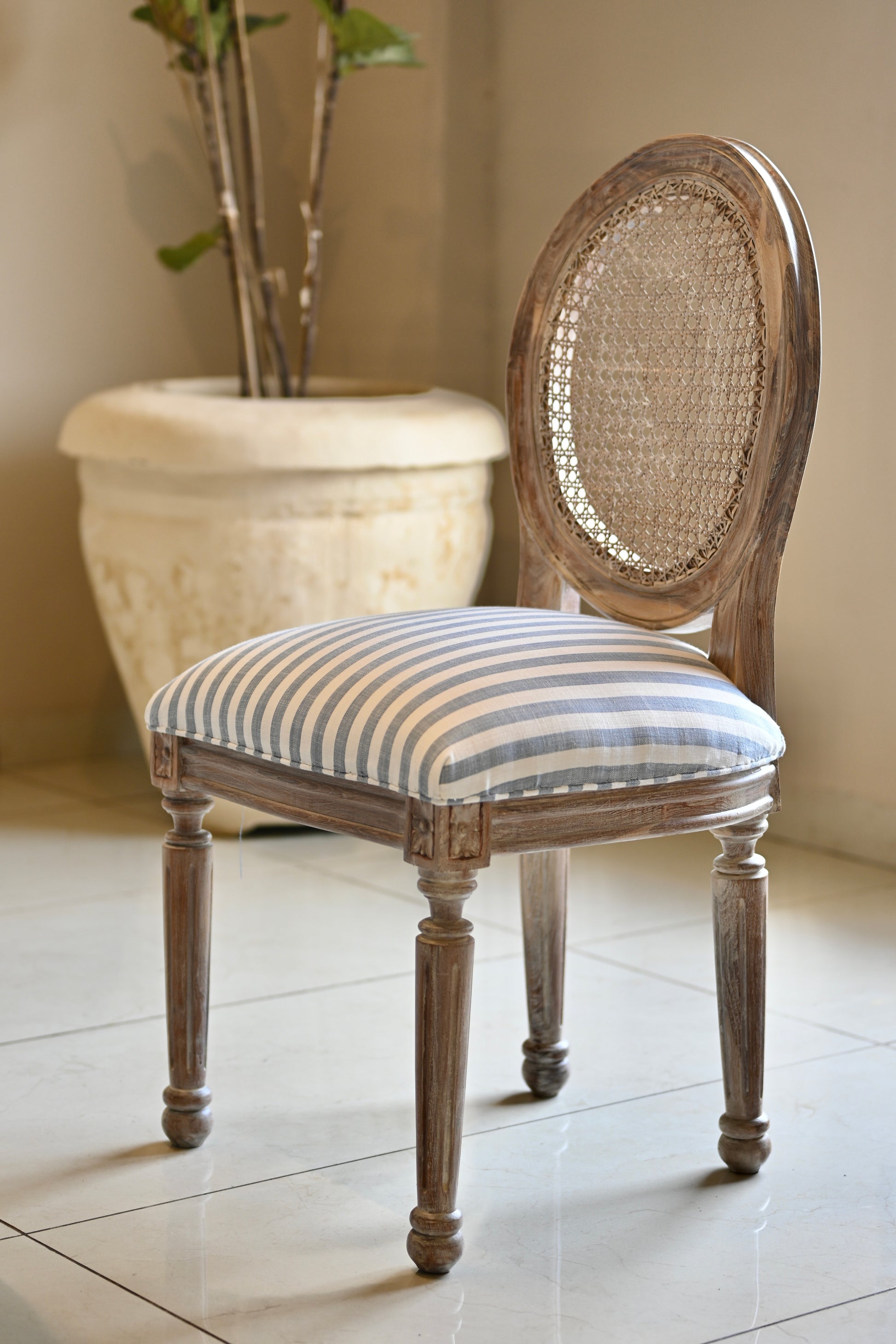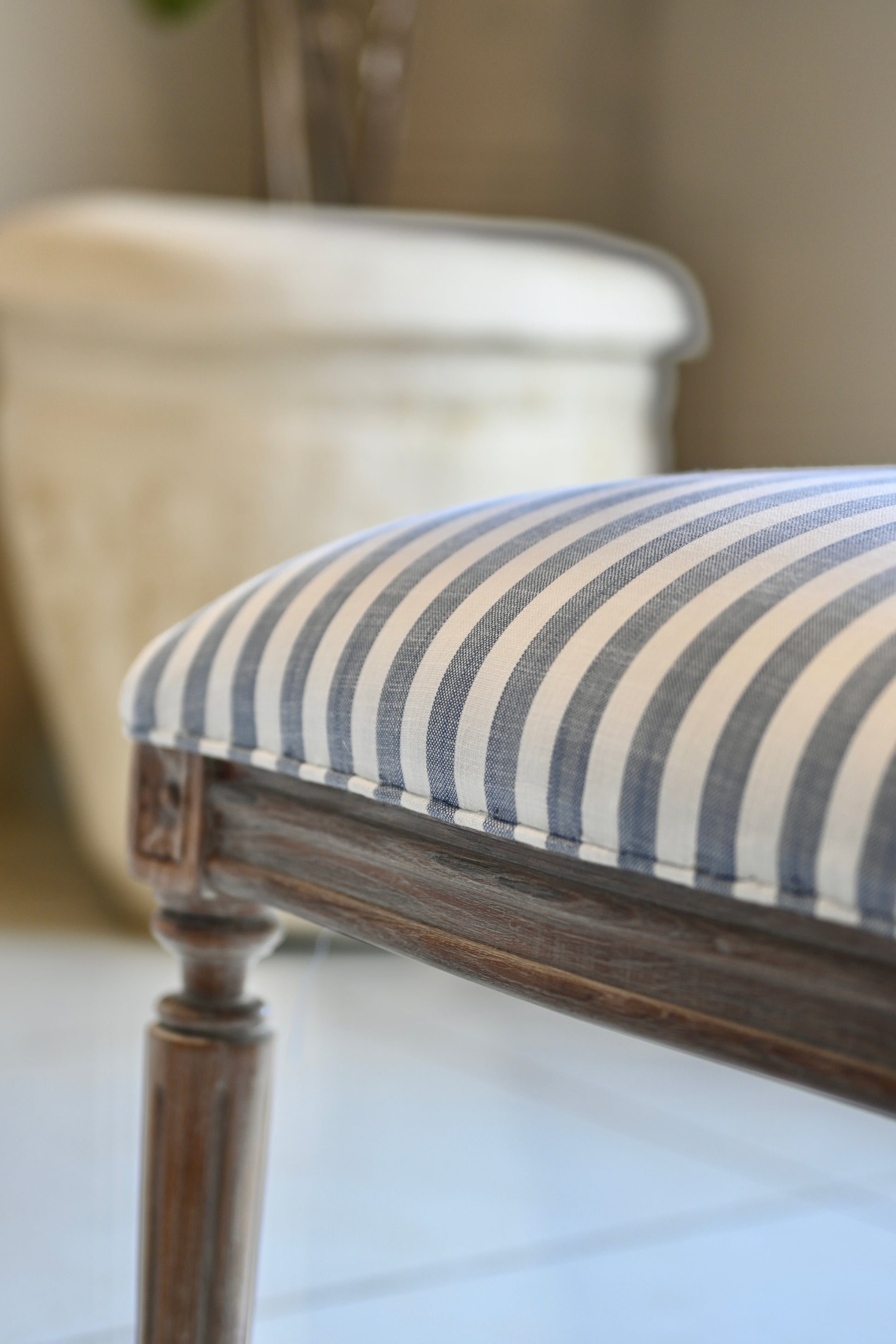 Stripes of blue and white wrap her seat in ease—casual, yet impossibly composed. The turned legs nod to neoclassical form, but she wears her heritage with a lived-in grace, never trying too hard, never out of place.