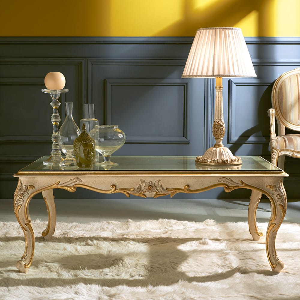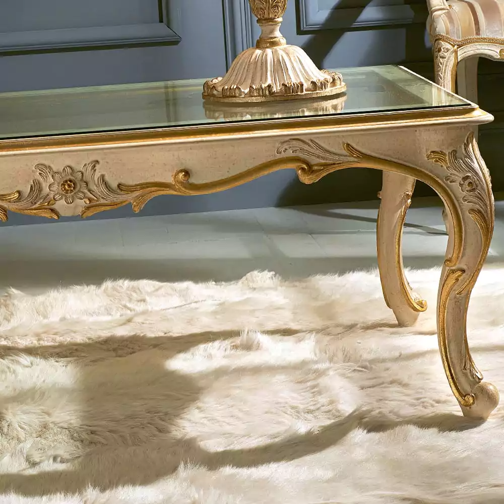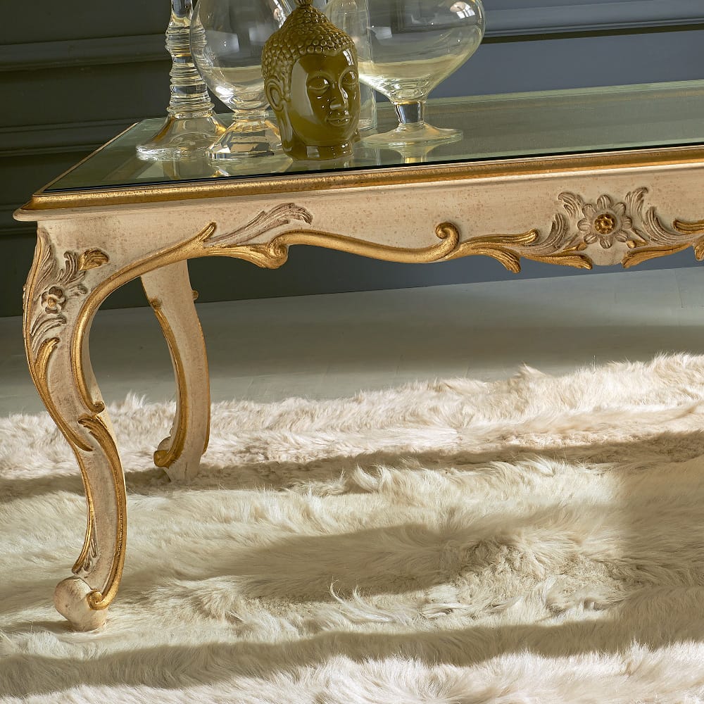 Elorienne glows with glass top revealing the sculpted dance beneath, where gold-brushed carvings drift like whispers along a sand-toned frame.