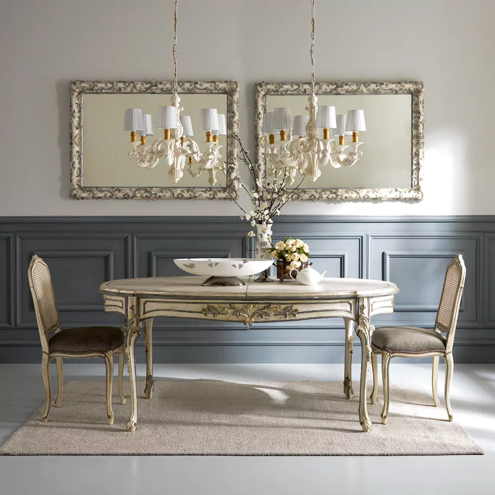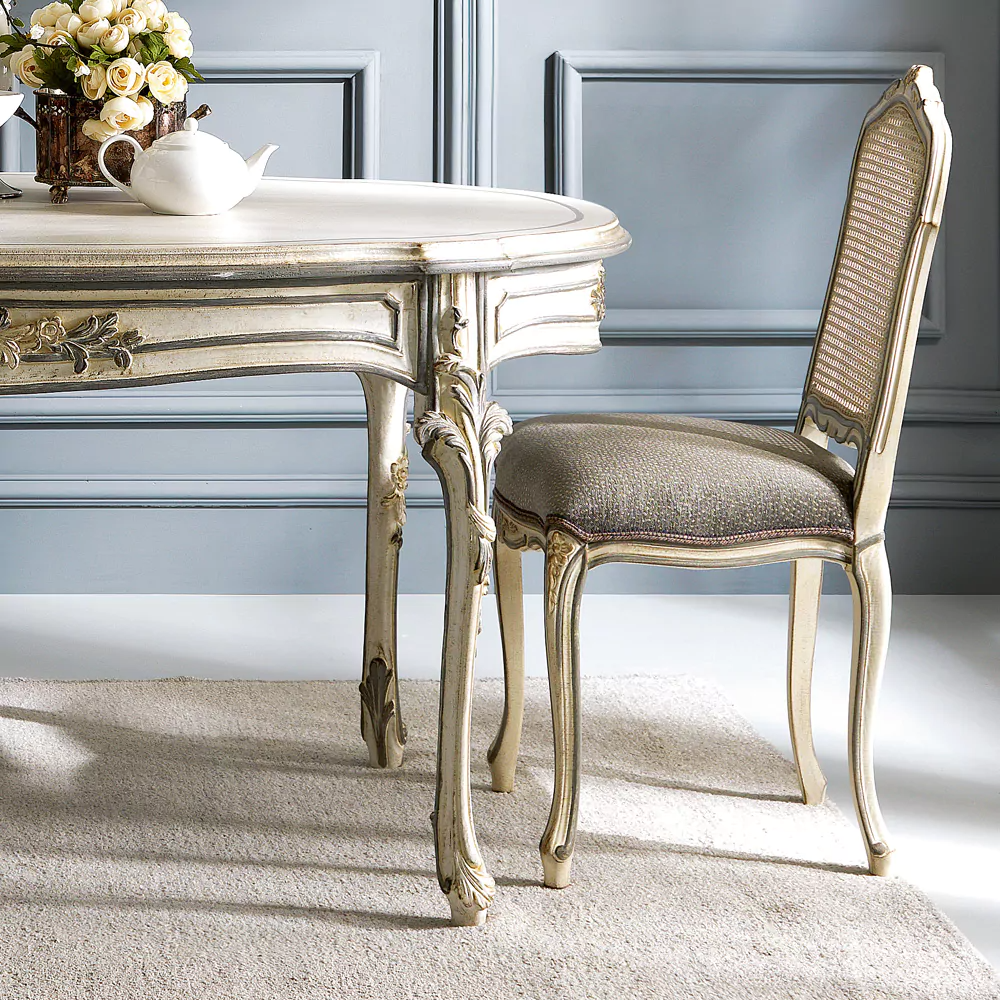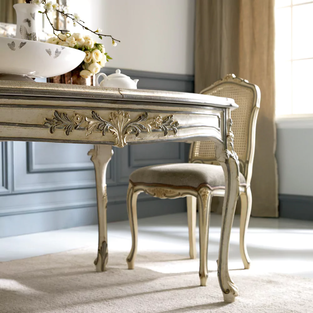 Chairs with cane backs echo the table’s tone, their seats a muted grey that deepens the harmony without breaking it.