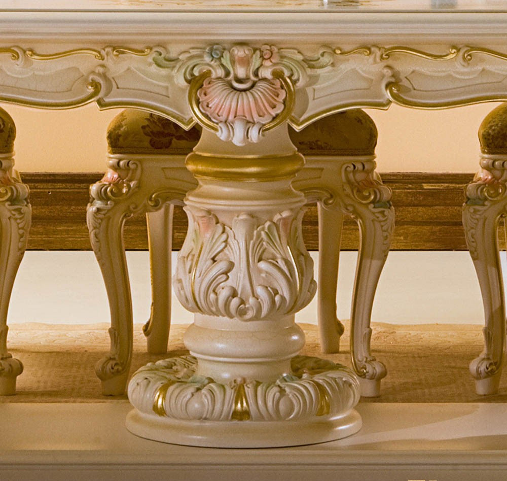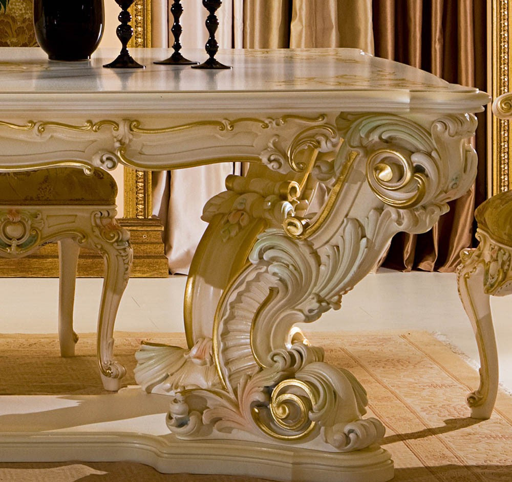 Her form is a canvas for cascades of intricate carving, each detail kissed with gold that blooms against her soft white surface.