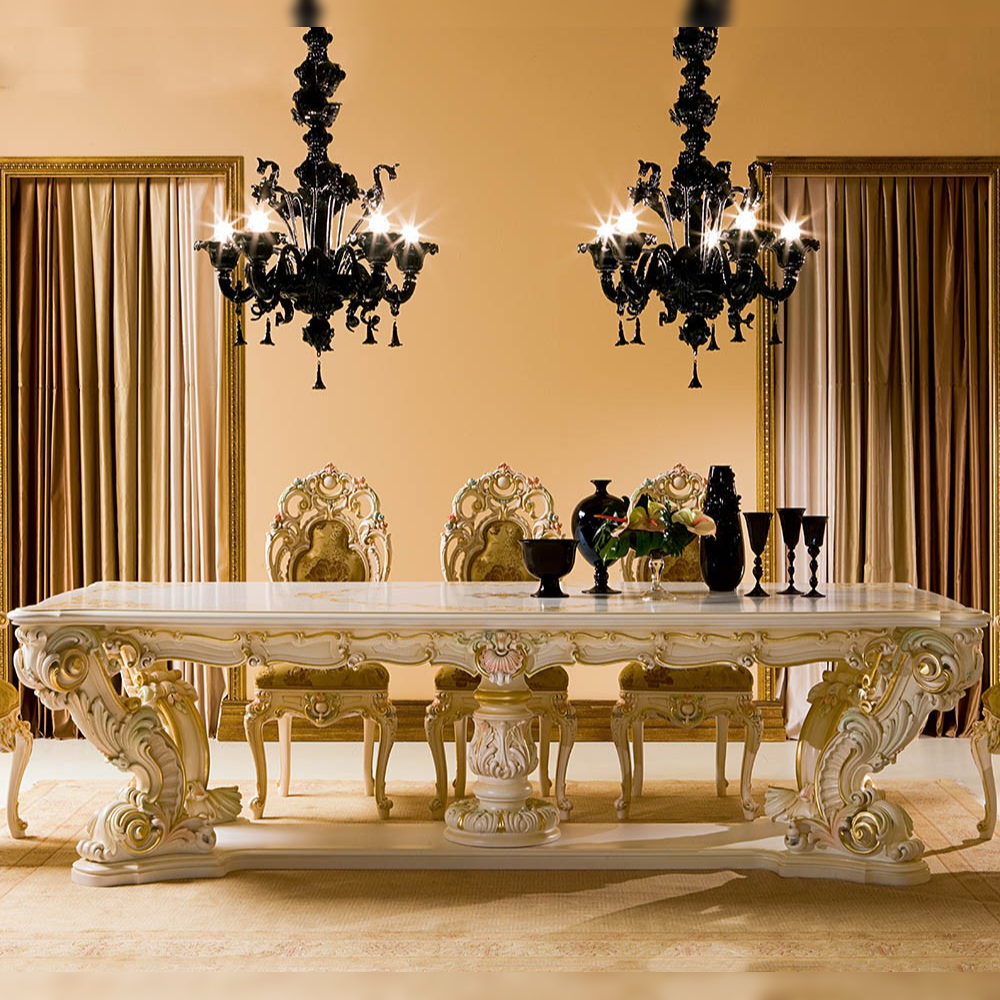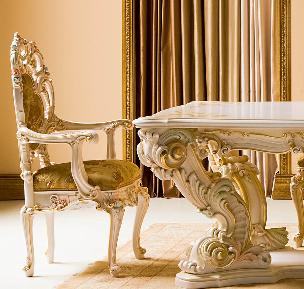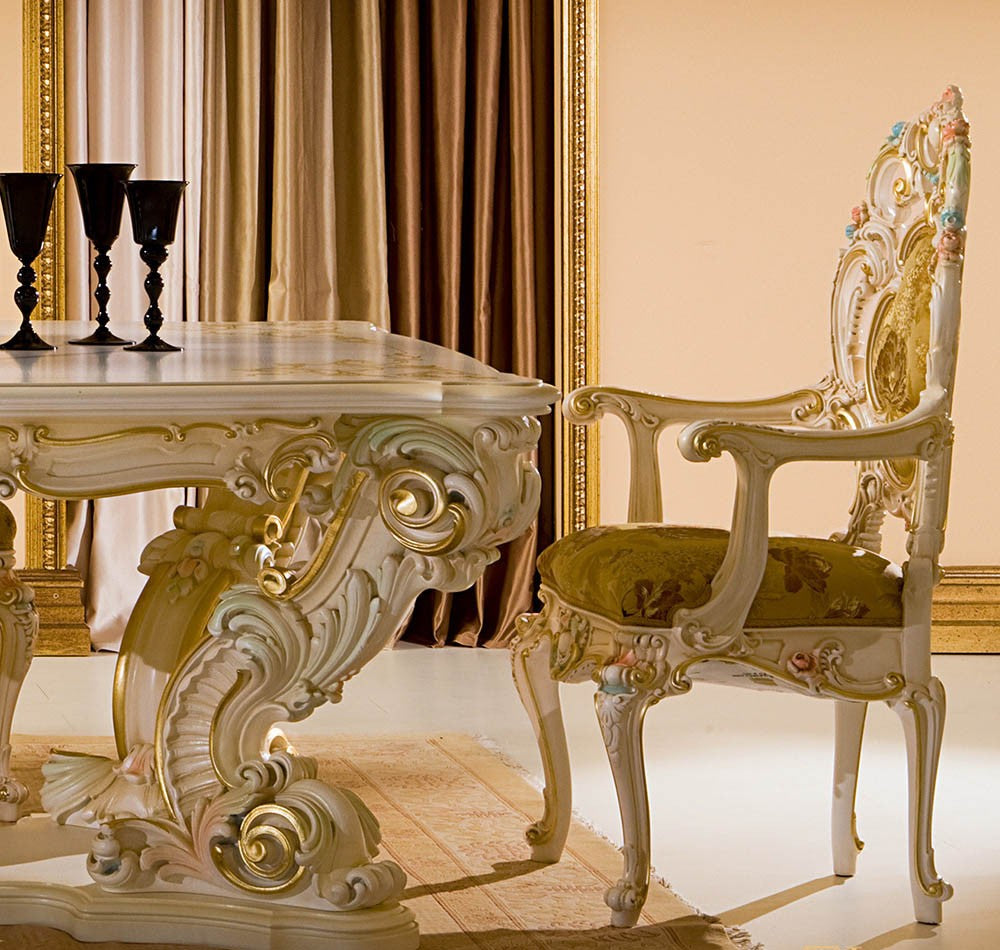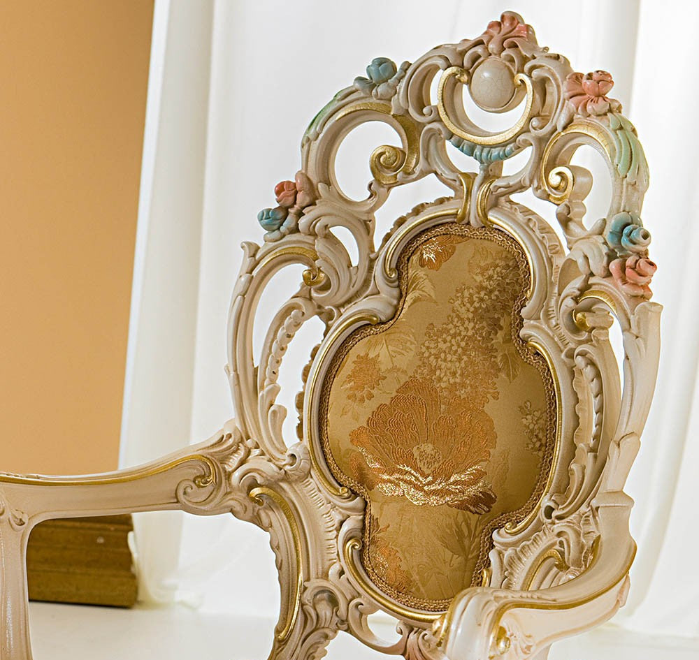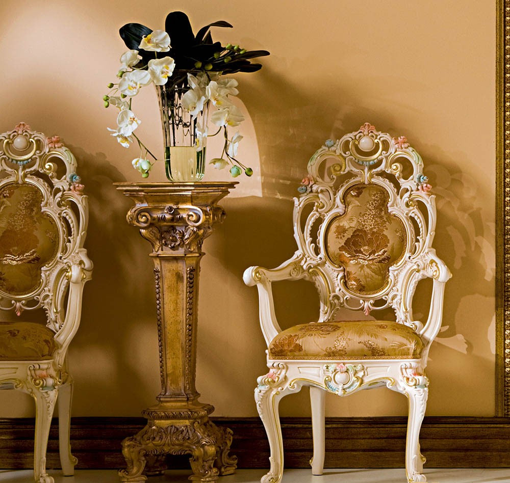 Her chairs, crowned in the same elaborate floral grandeur, gather like loyal attendants at her side.