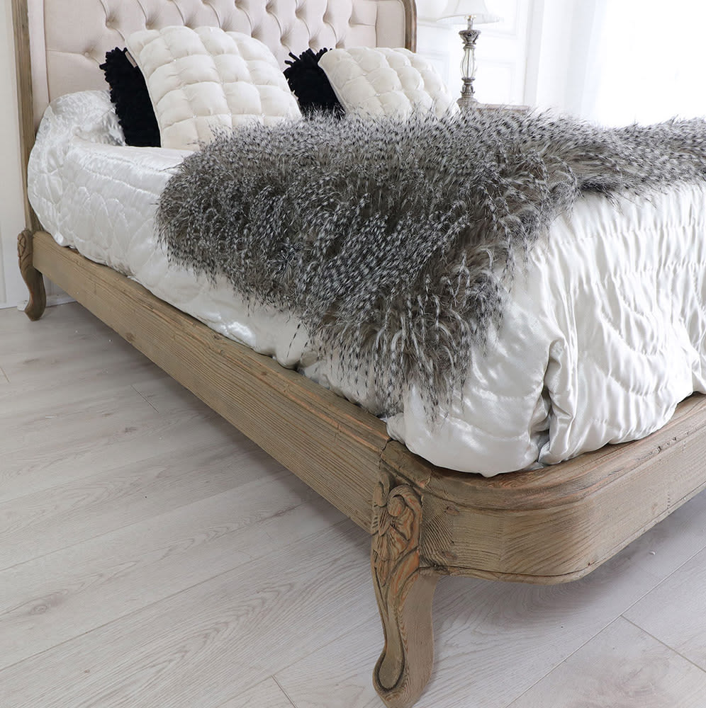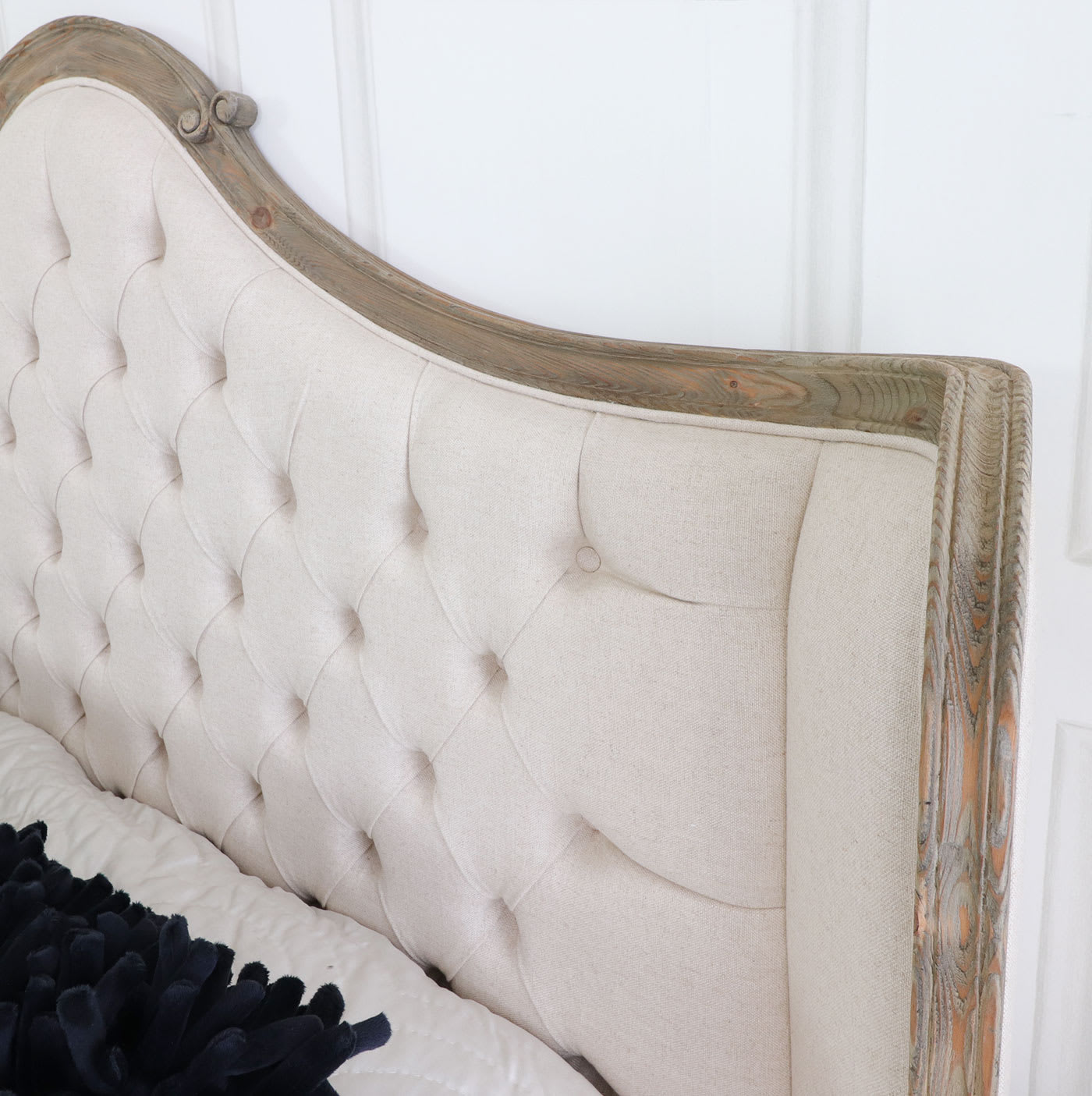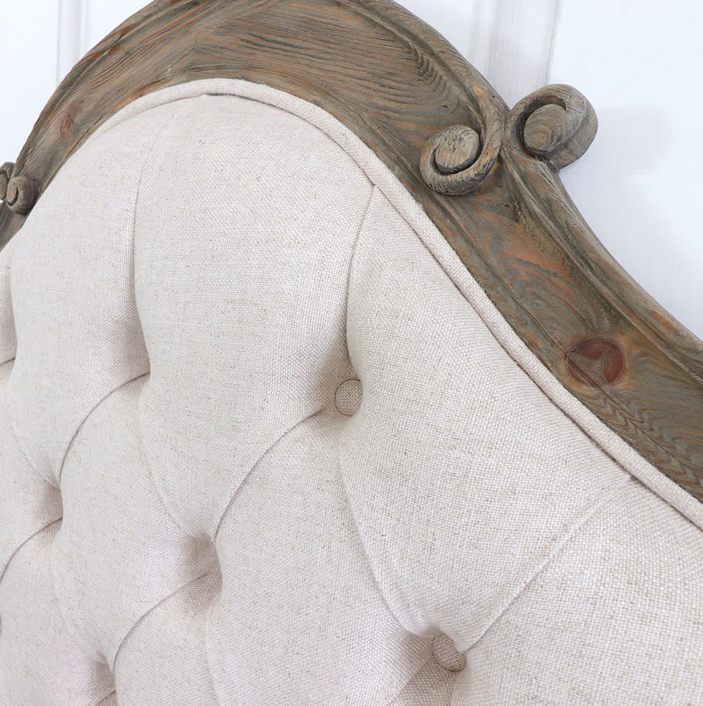A nod to vintage restraint and modern ease. The high, arching headboard is gently tufted like midnight’s own memory, while the legs curve with a quiet kind of confidence.