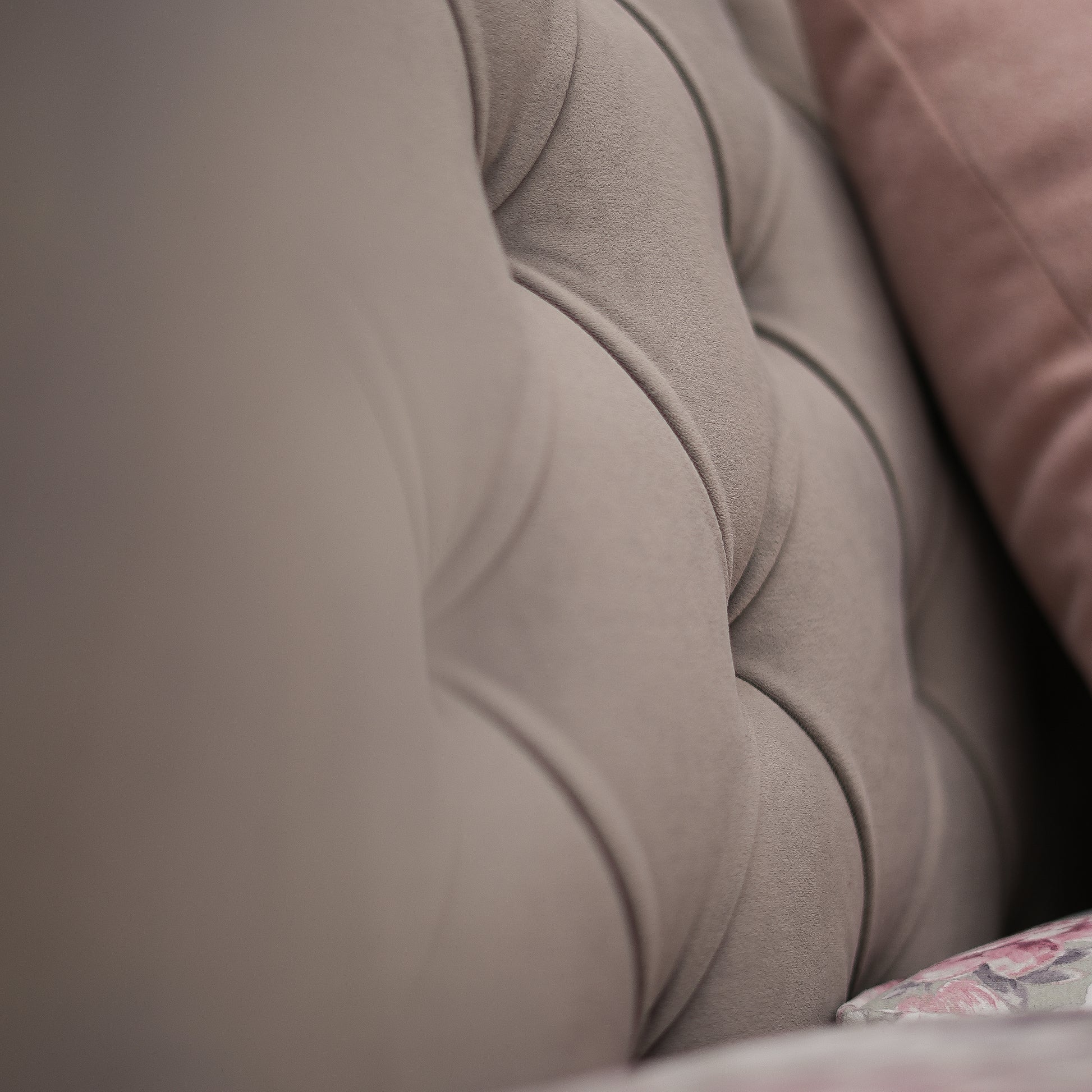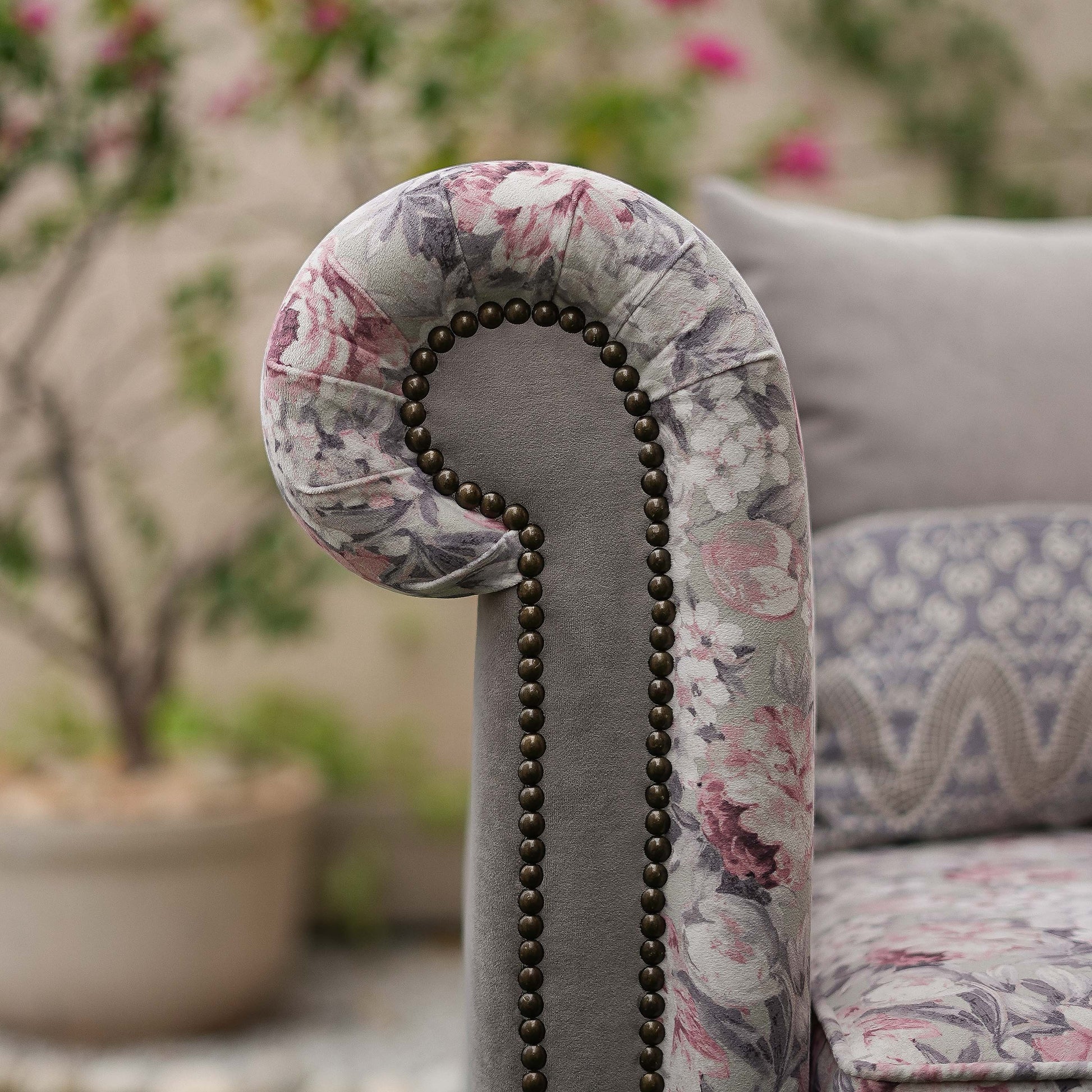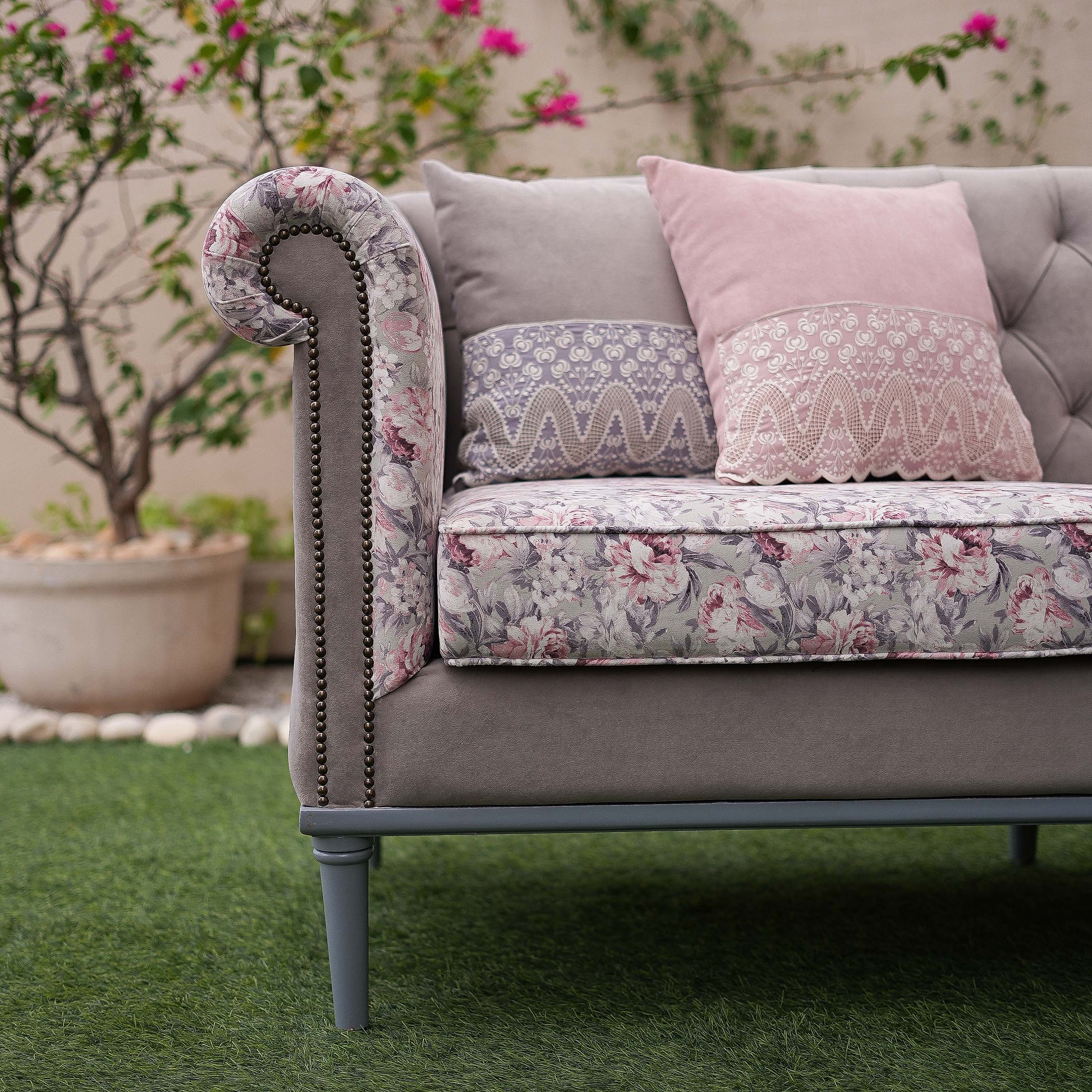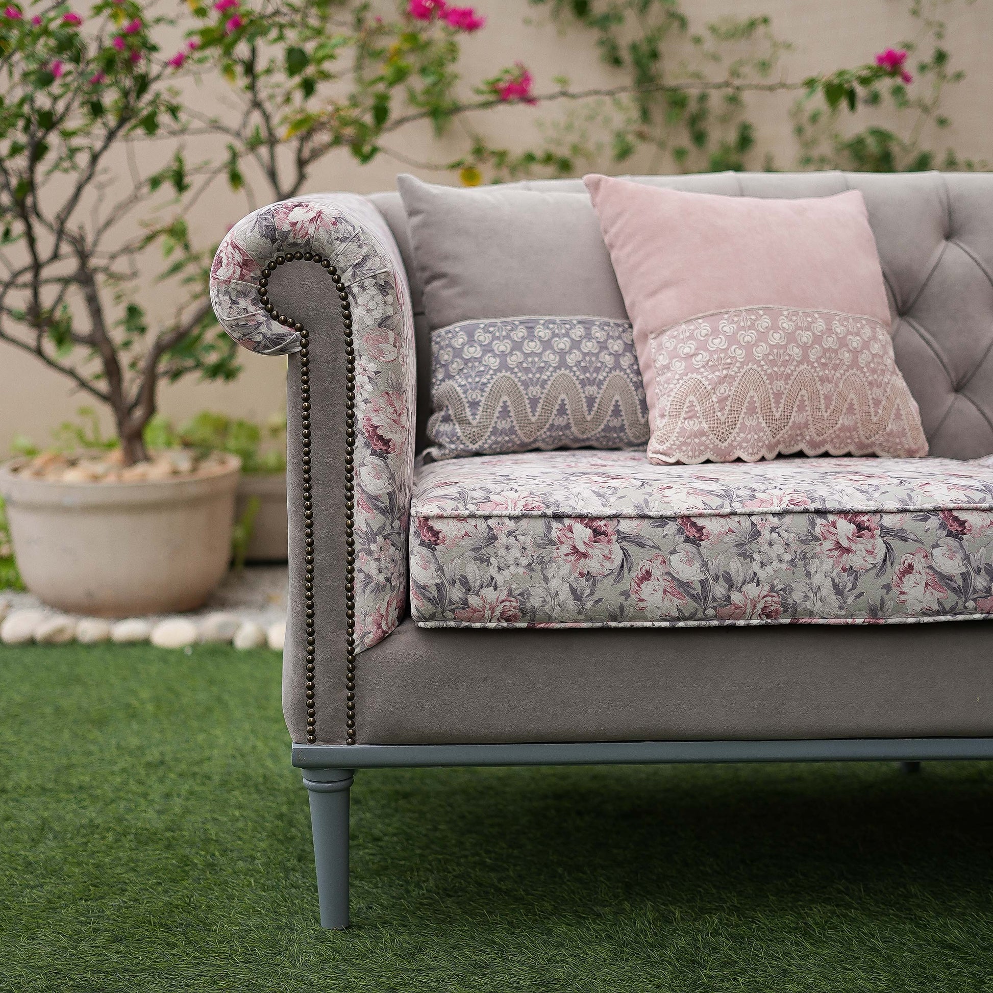 Petals live in the seat; Faded blooms scattered across linen, wrapped in quiet stories and stitched with restraint. Grey Suede runs below like shade in a walled garden, anchoring the florals in dusk.