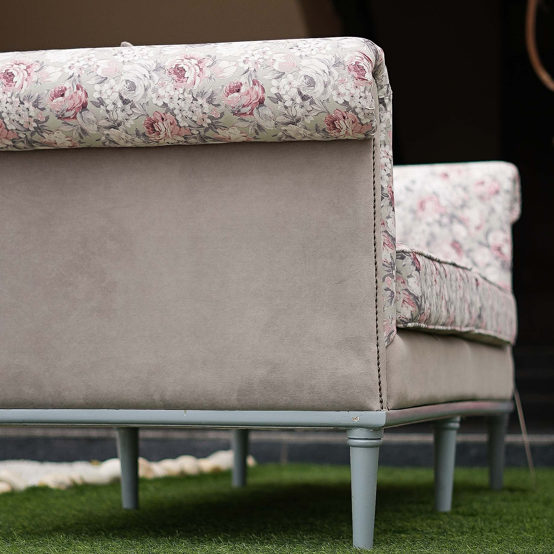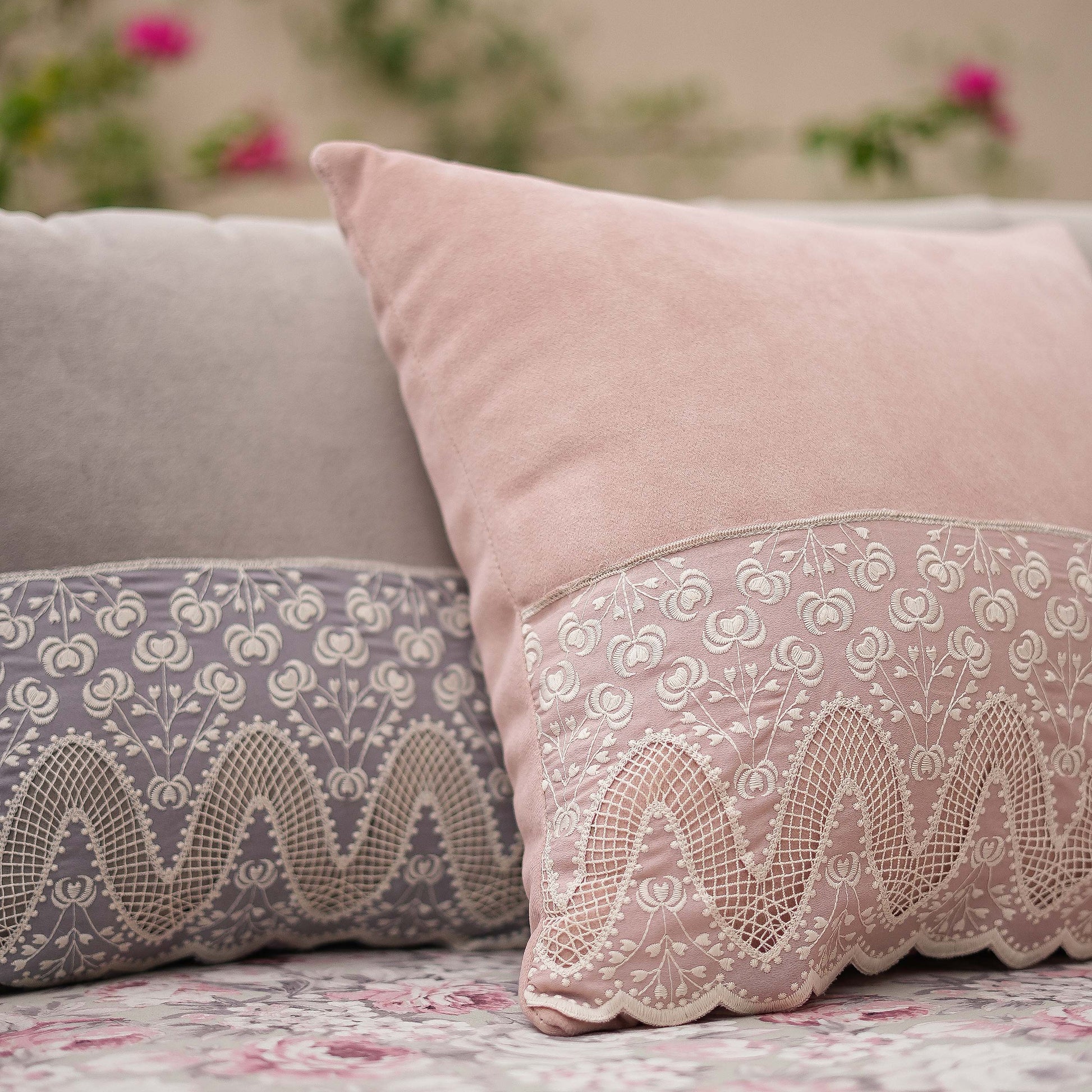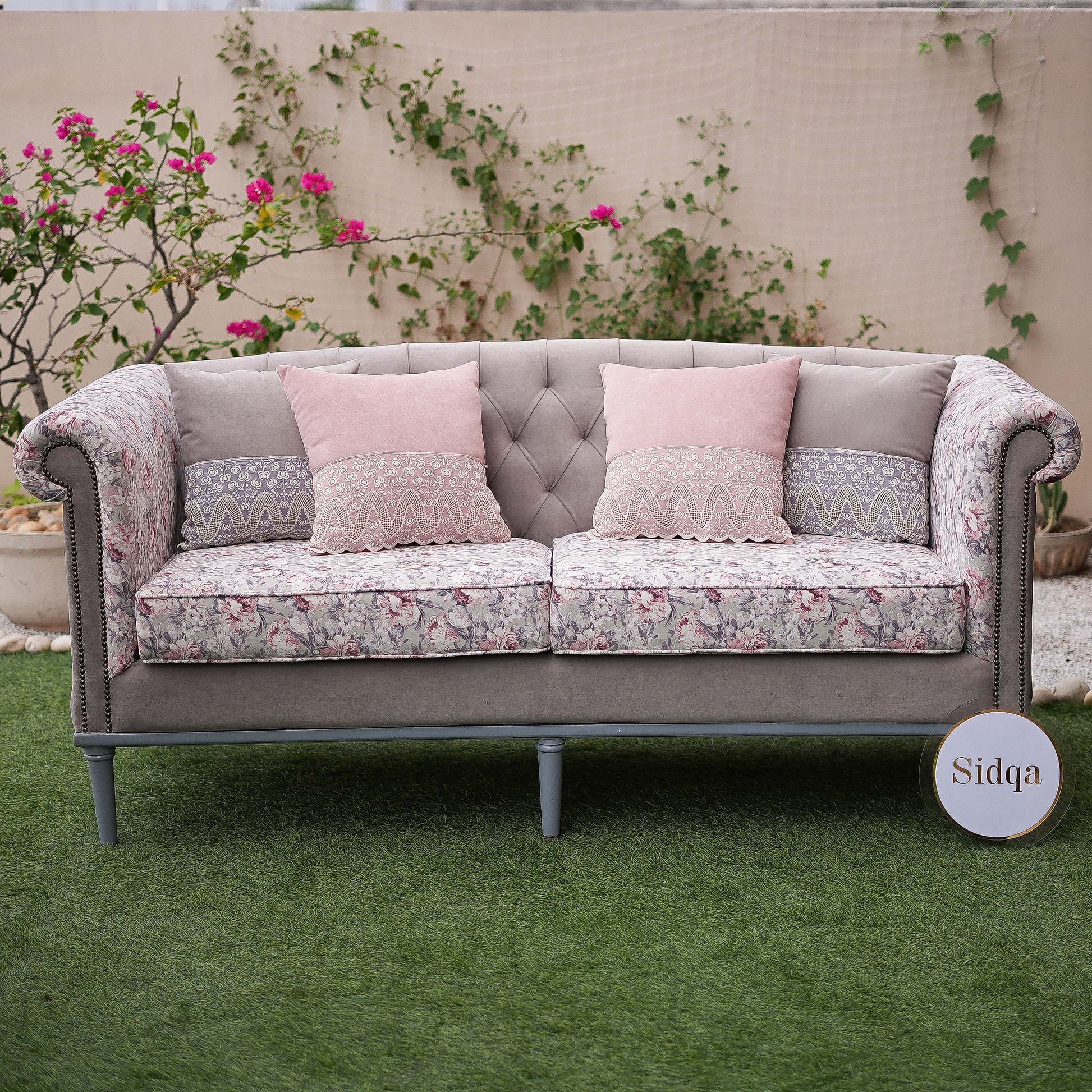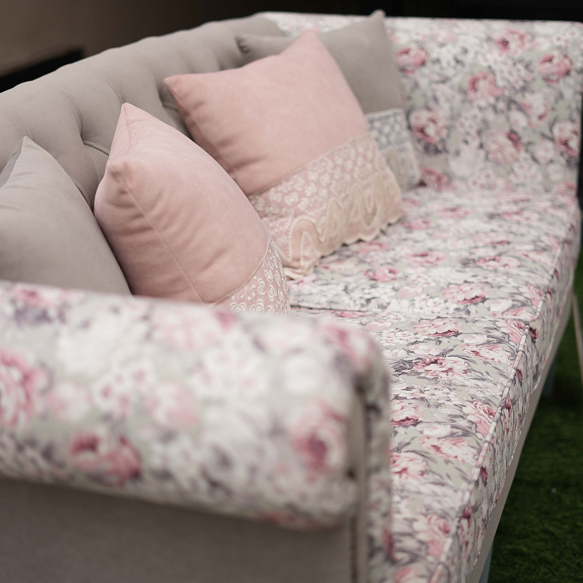 Petals live in the seat; Faded blooms scattered across linen, wrapped in quiet stories and stitched with restraint. Grey Suede runs below like shade in a walled garden, anchoring the florals in dusk.