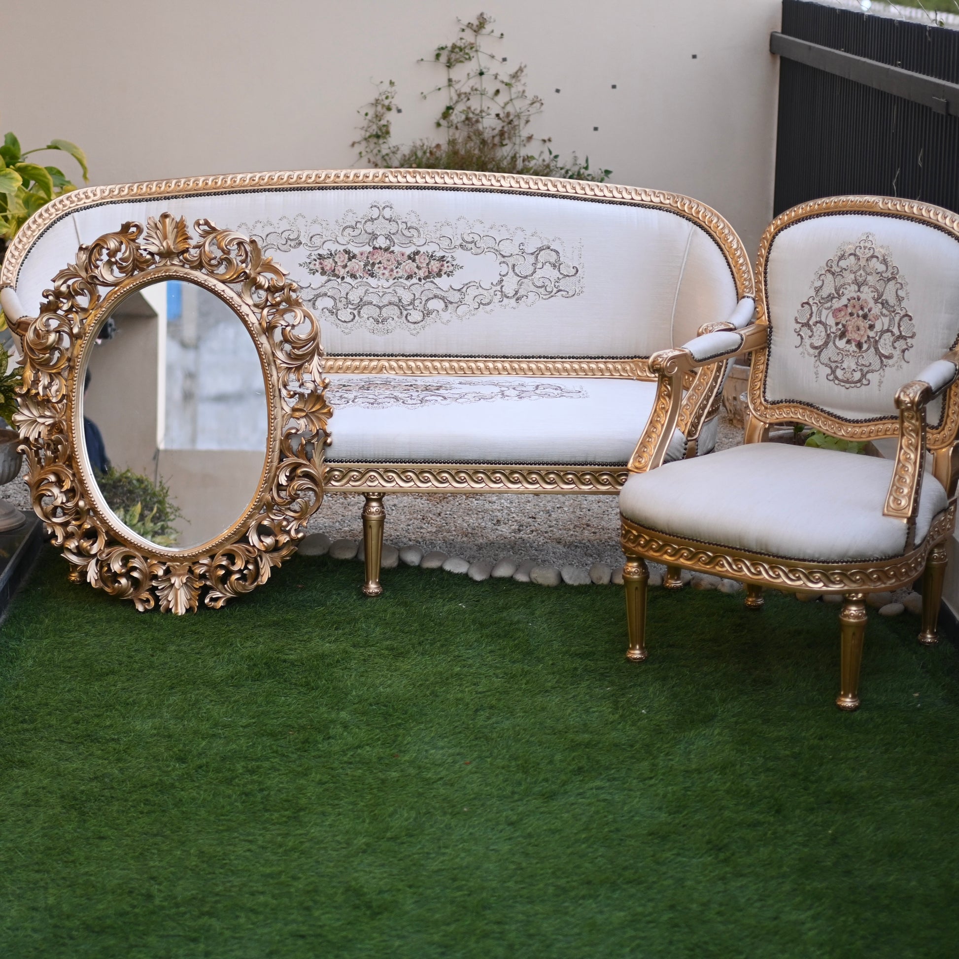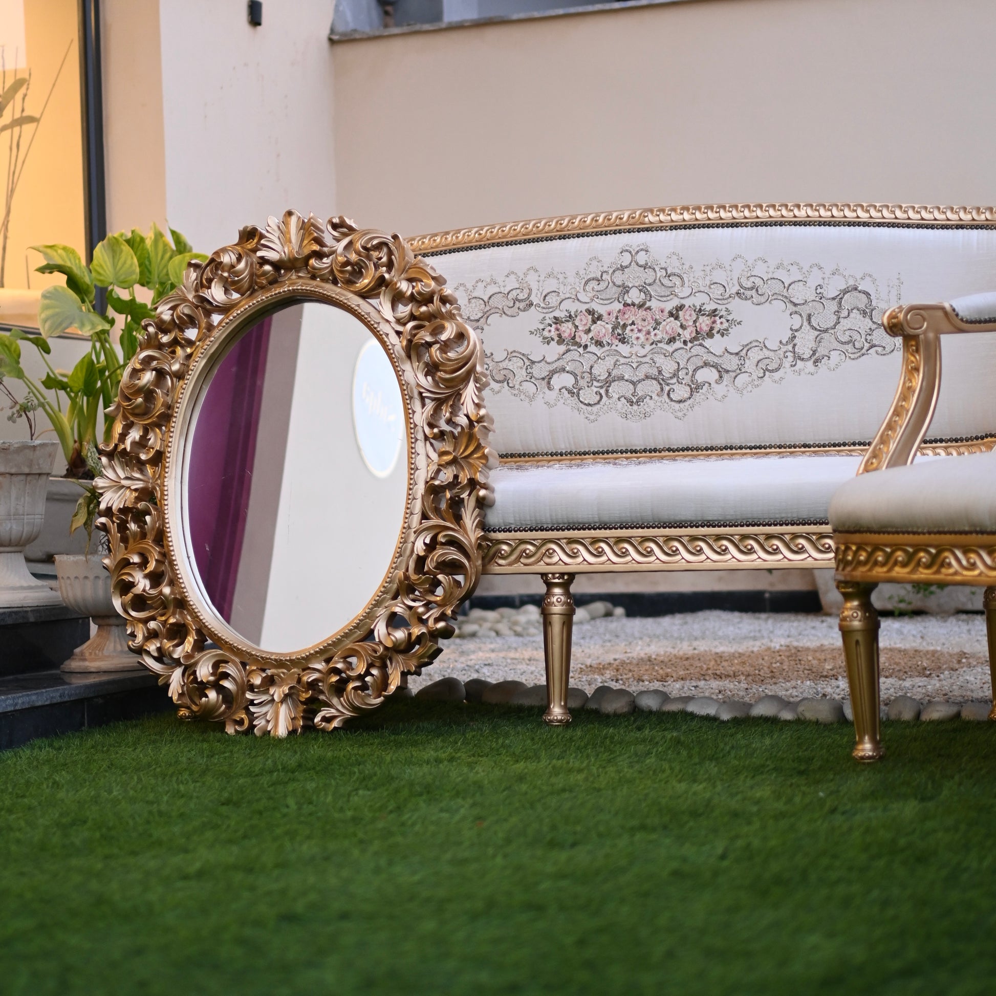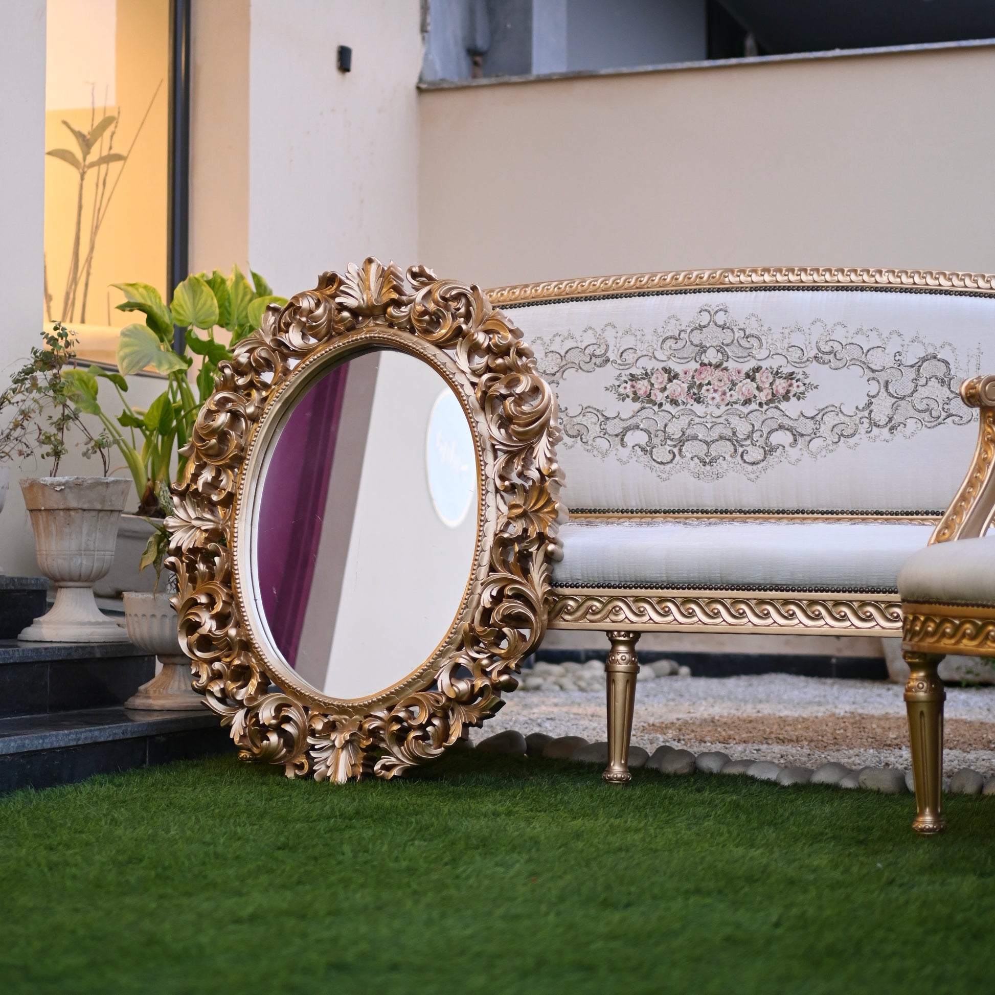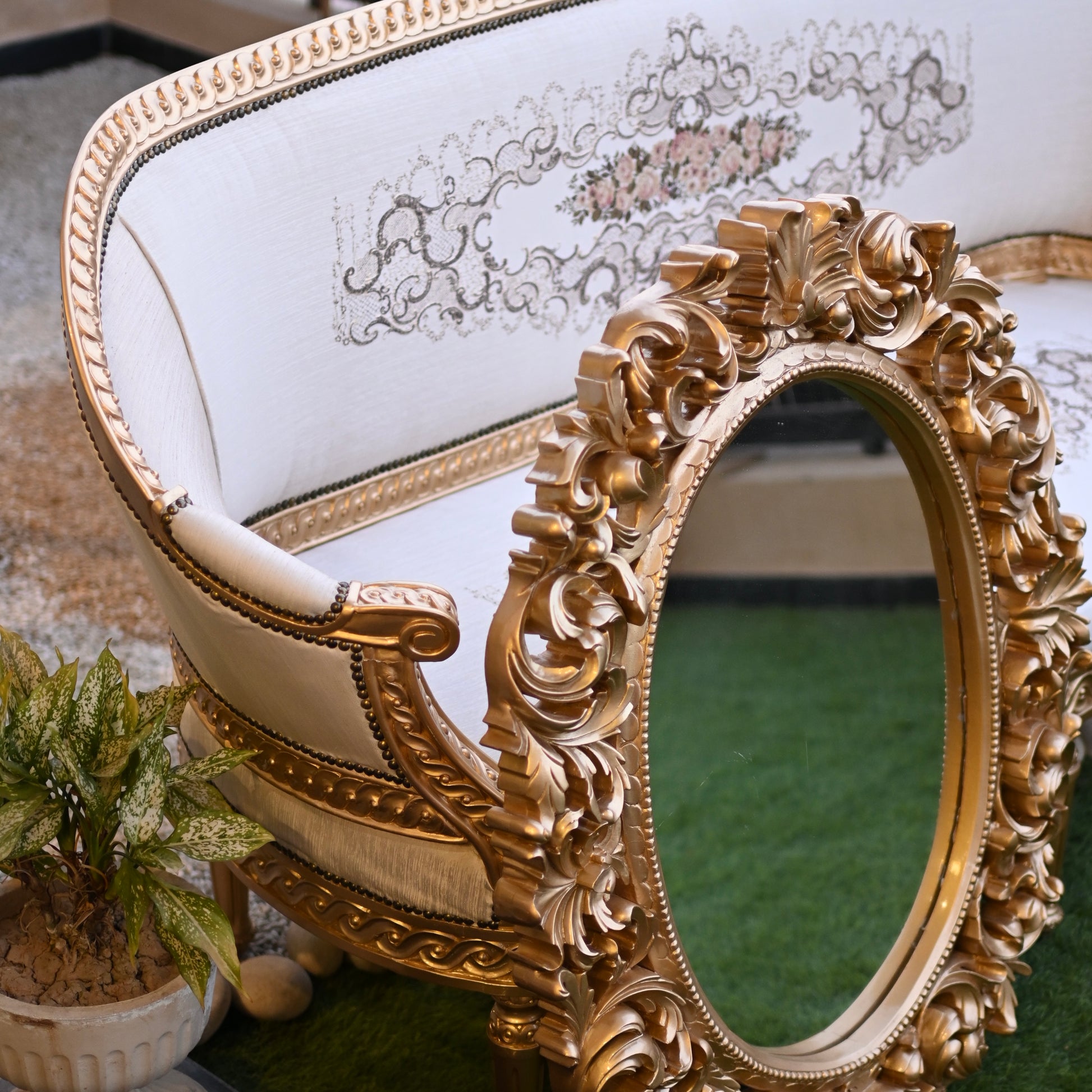 She frames more than faces — she holds fragments of time. Wrapped in intricate goldwork, every curve glimmers like candlelight on still water.