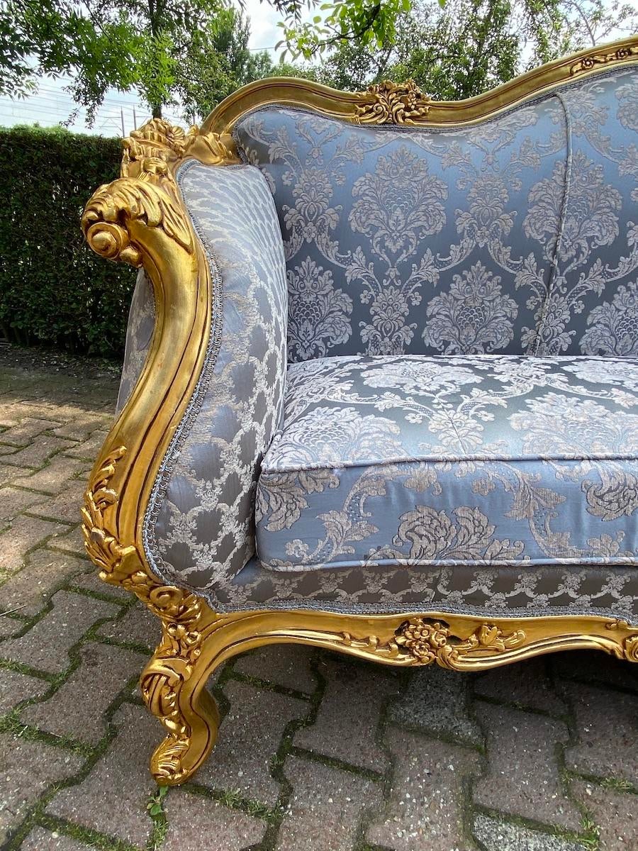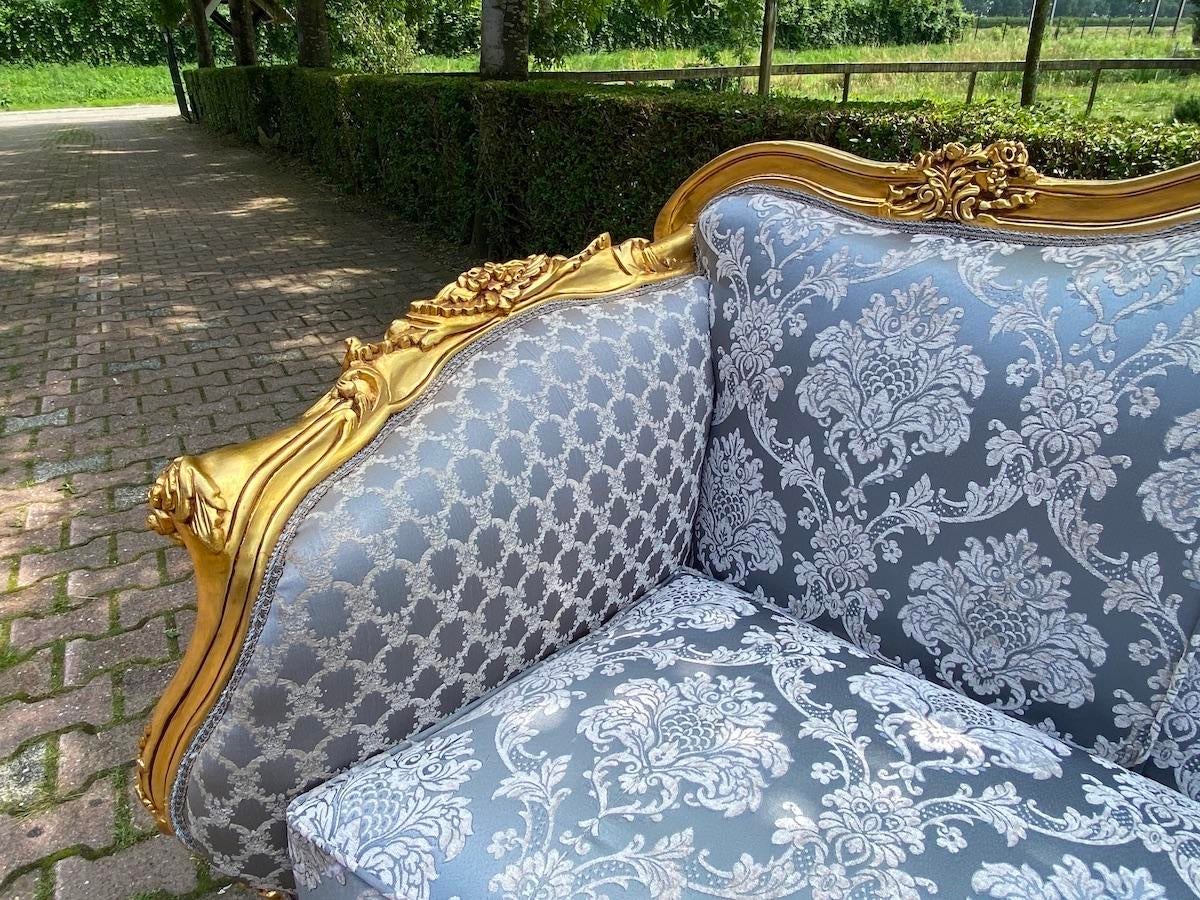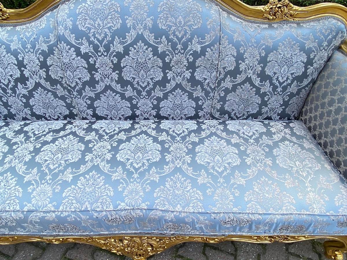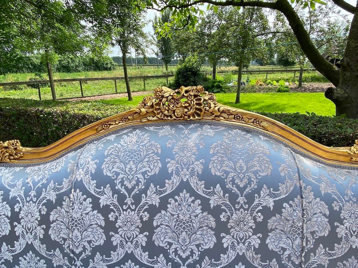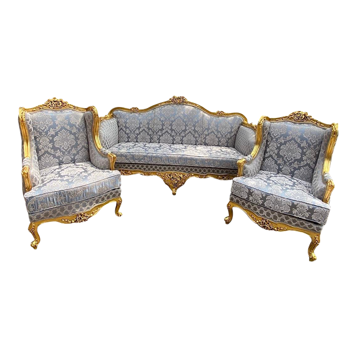 Crafted in heirloom tradition, each scroll and flourish of the carved frame gleams with hand-applied gold leaf, offset by the quiet richness of the damask. The fabric shimmers with a silvery-blue hue, catching light and history in the same breath.