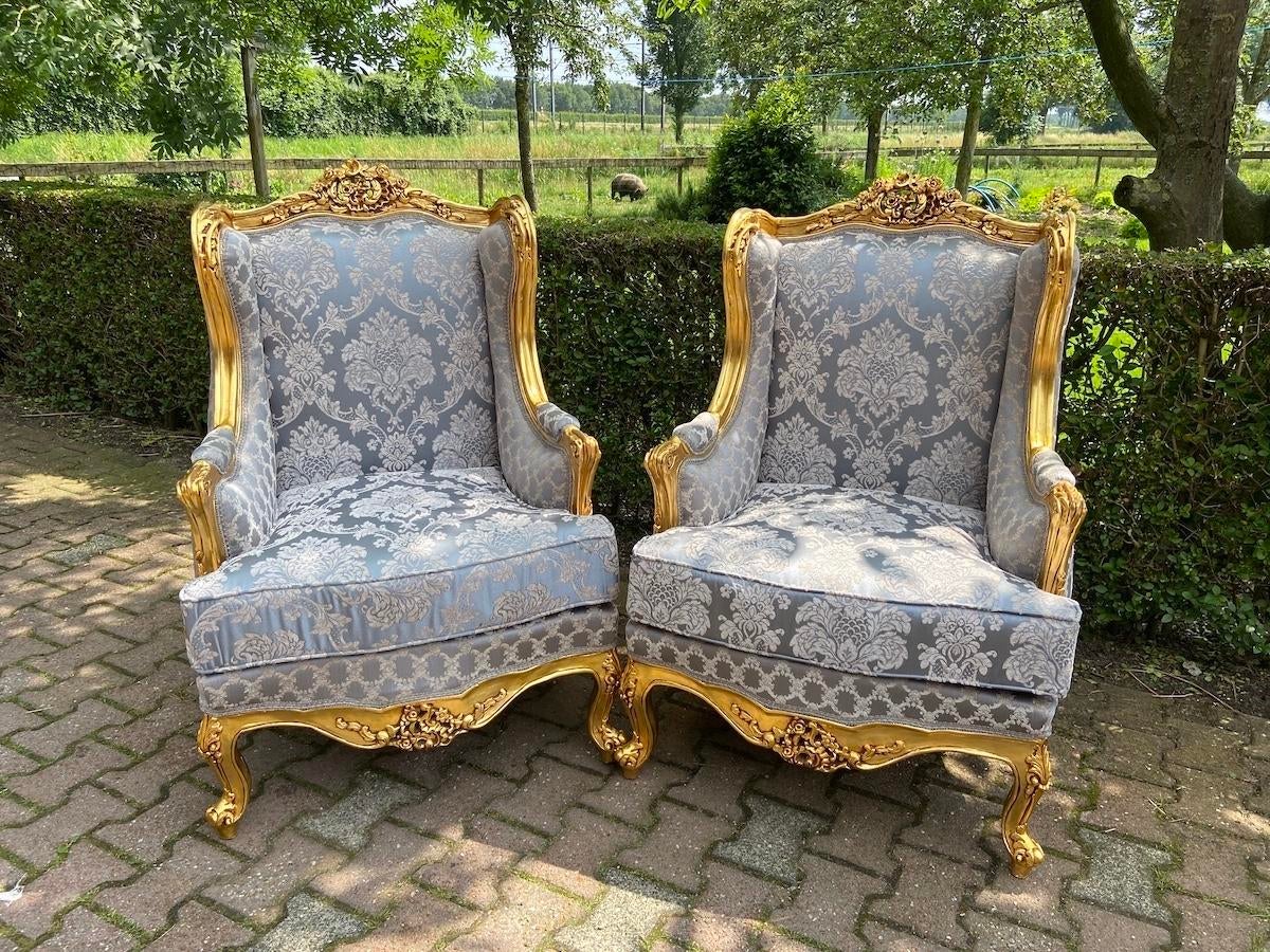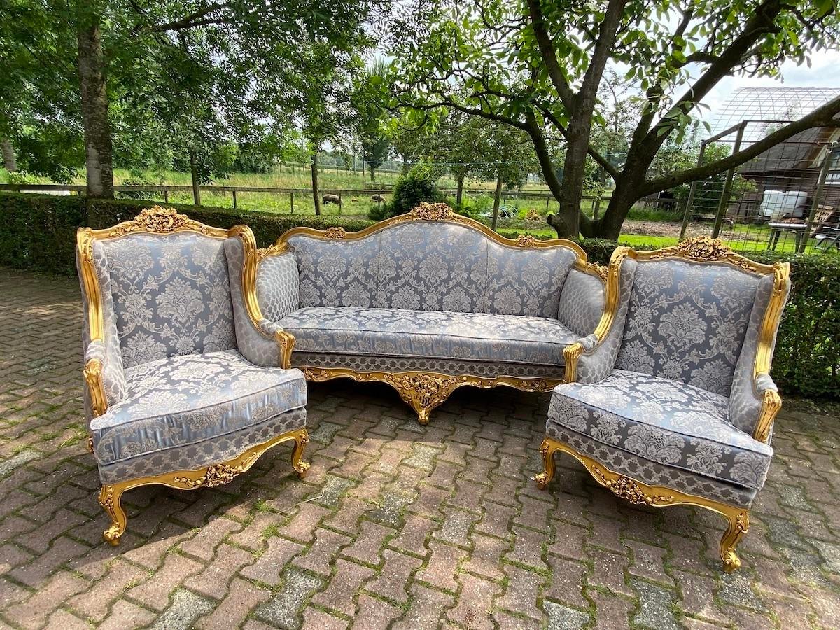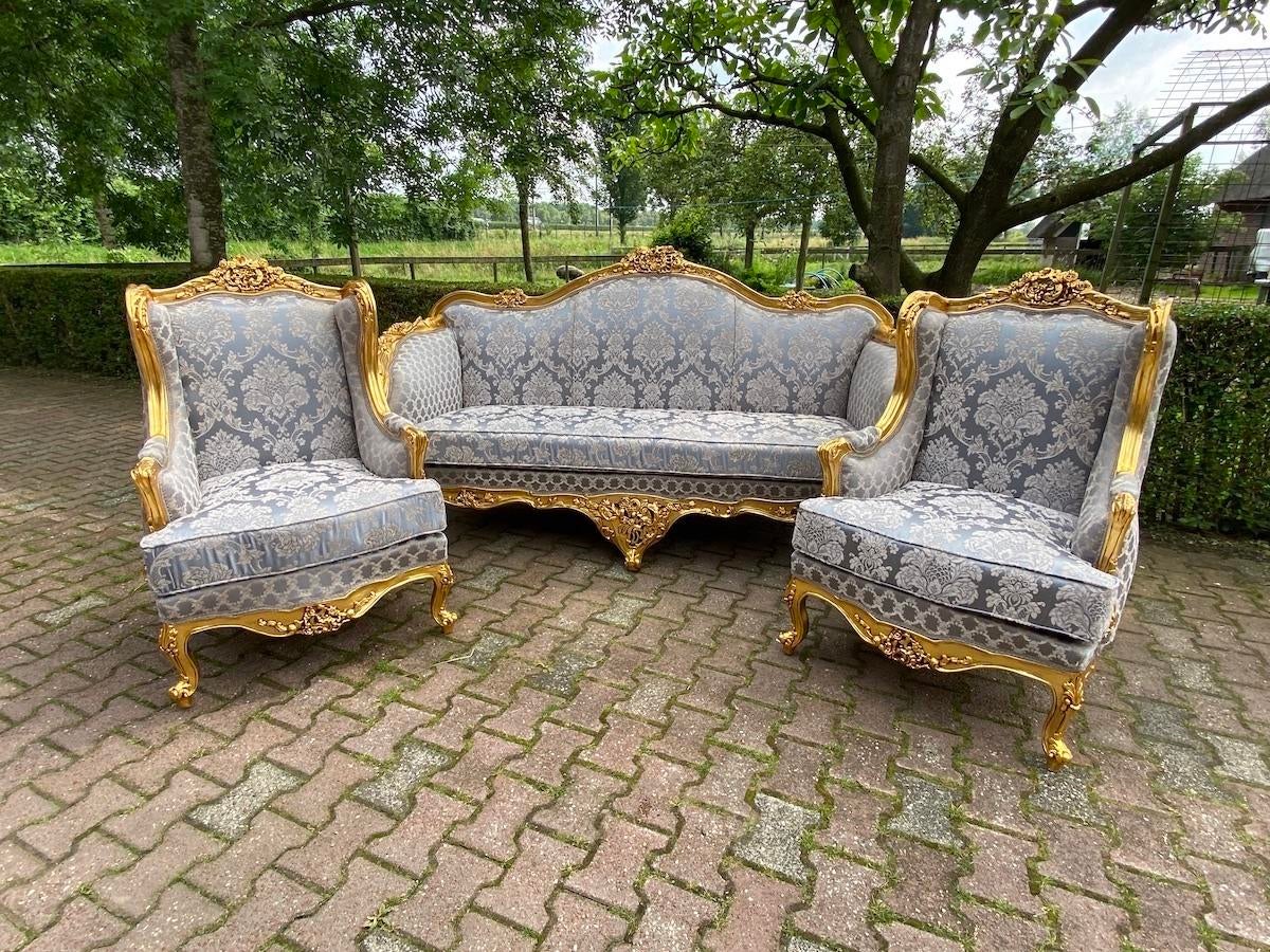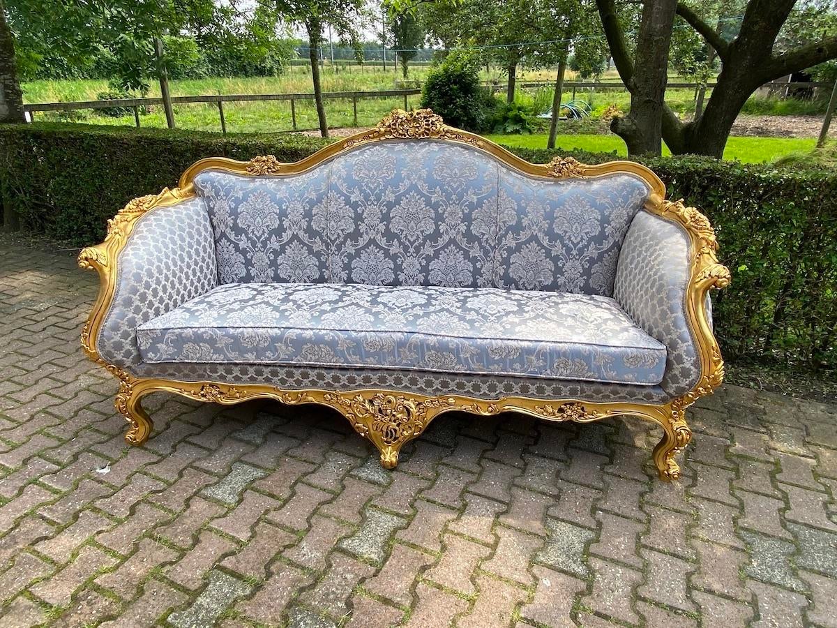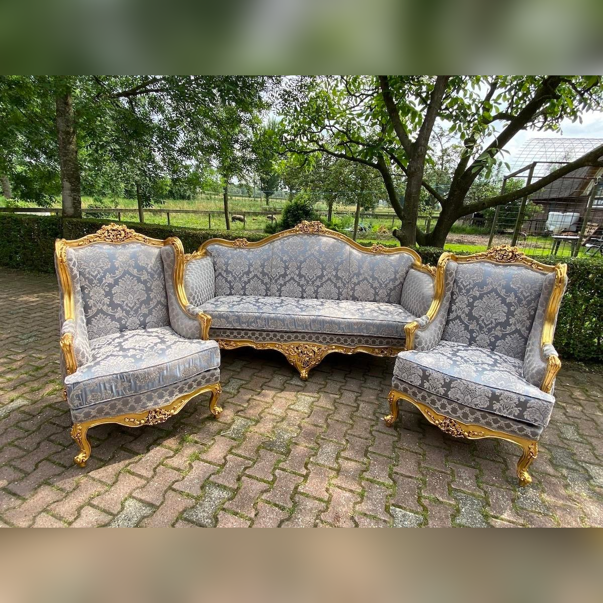 Crafted in heirloom tradition, each scroll and flourish of the carved frame gleams with hand-applied gold leaf, offset by the quiet richness of the damask. The fabric shimmers with a silvery-blue hue, catching light and history in the same breath.