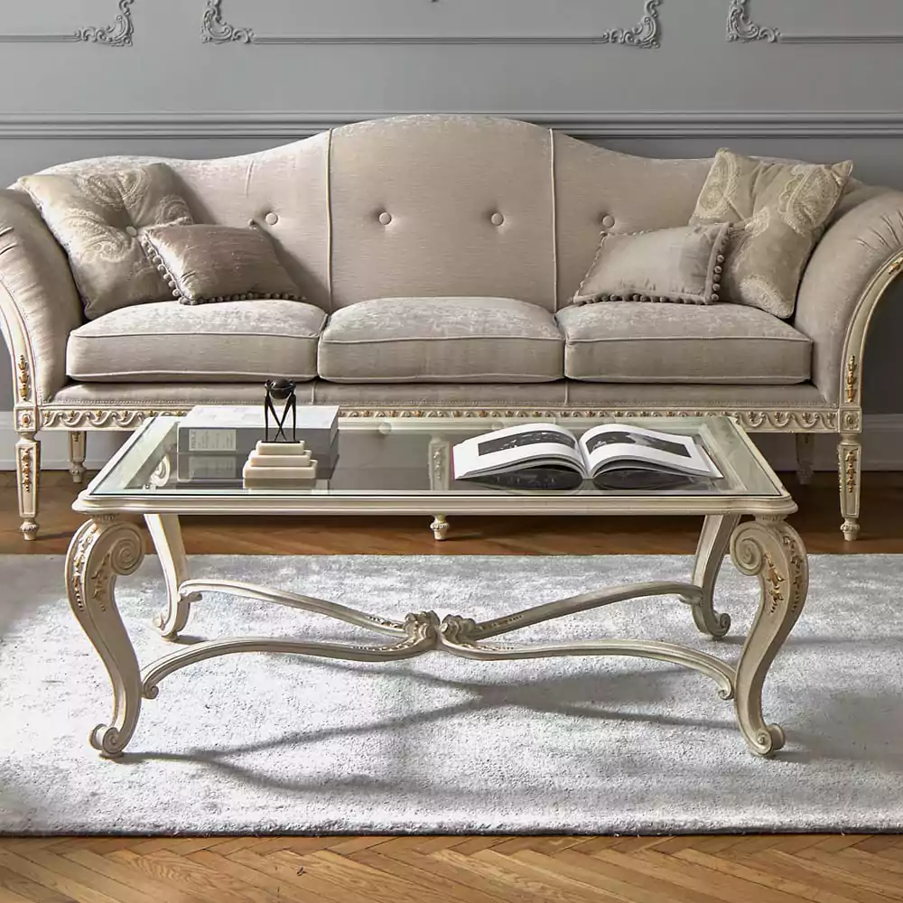 The glass top lays clear and precise, revealing every curve of the ornate underframe—a crisscrossed ballet of slender beams that meet at a single carved bloom.