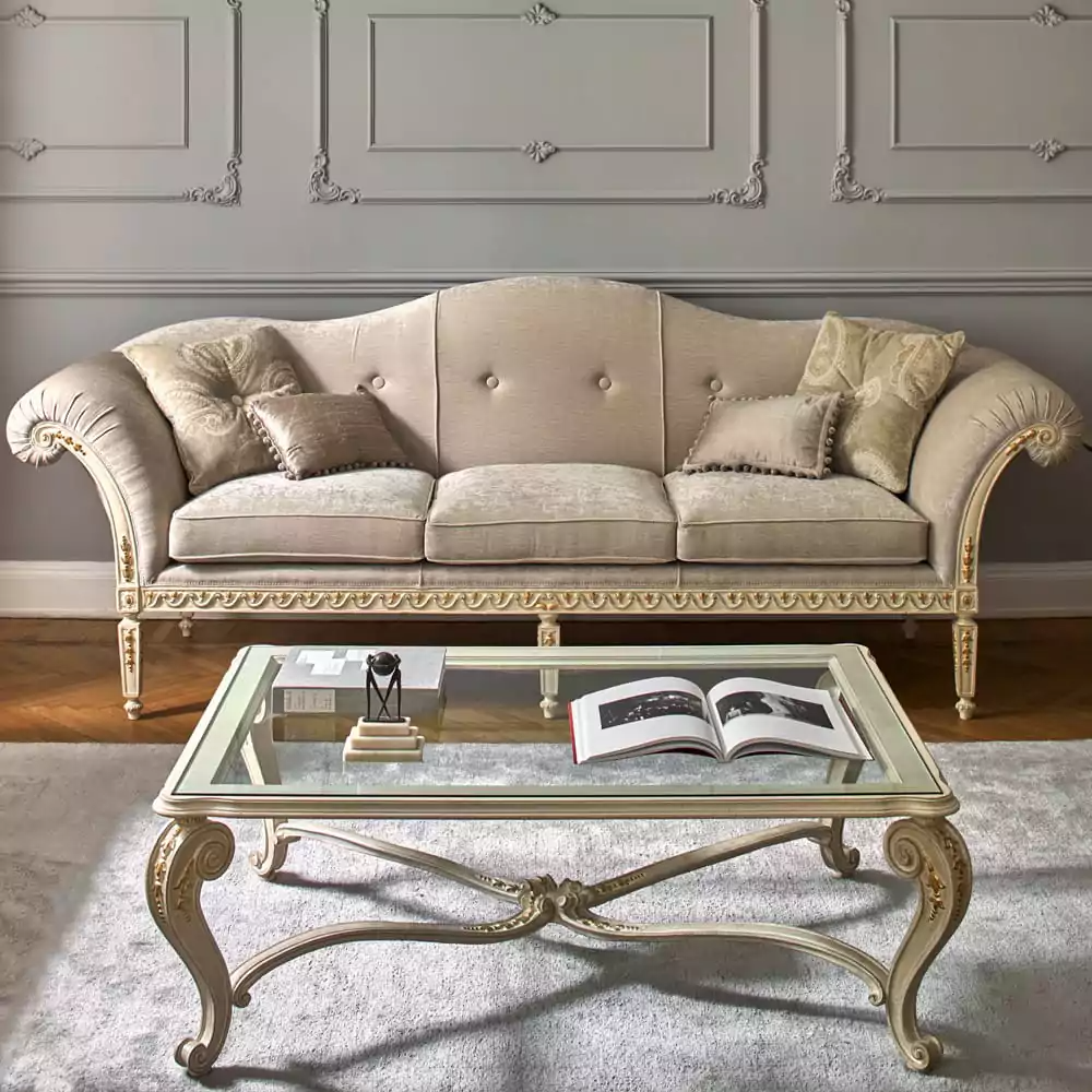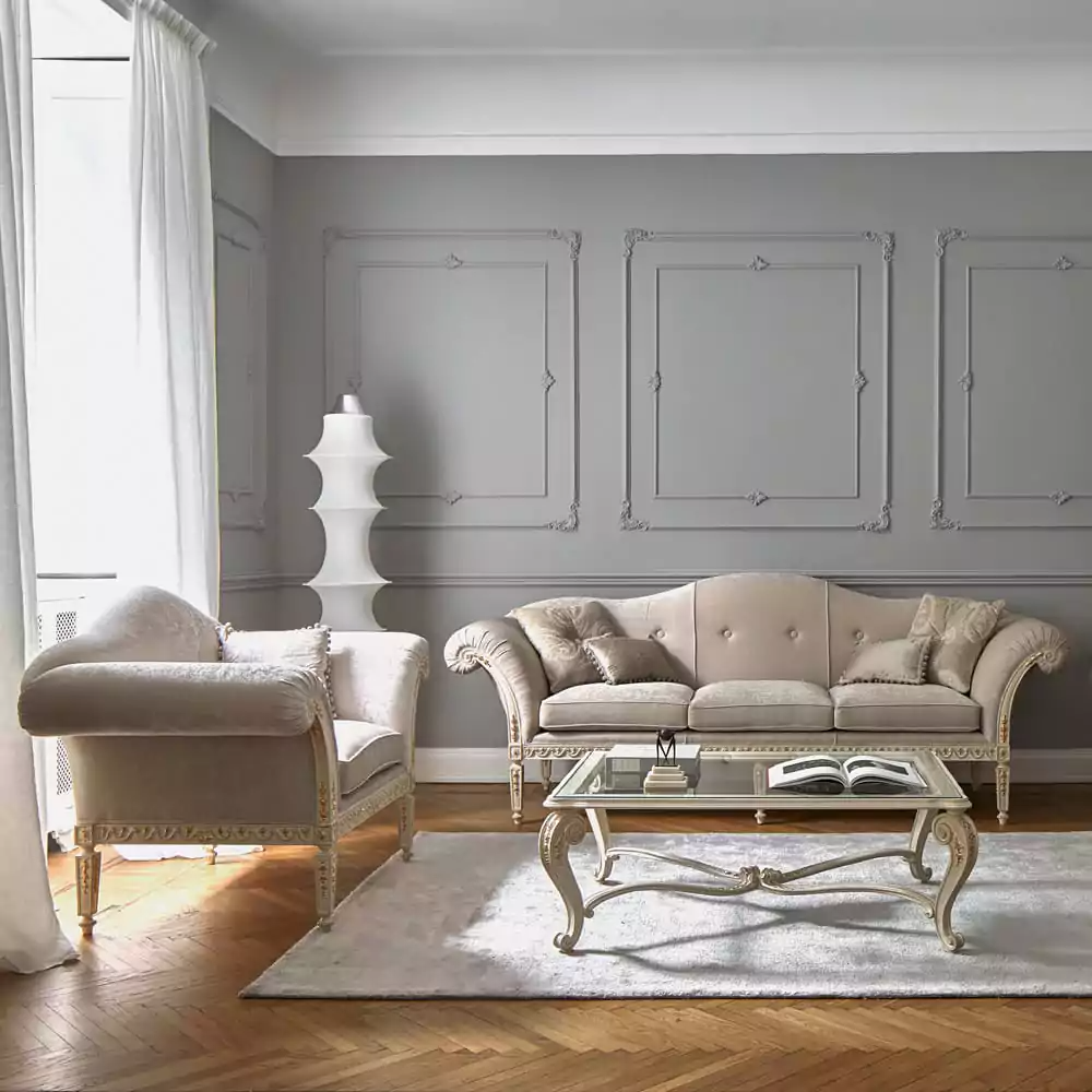 Ivéraude reclines in quiet opulence. The frame, painted in a dreamy ivory white, carries a timeless ease, while gold detailing along her legs and scrollwork murmurs of old-world finesse.