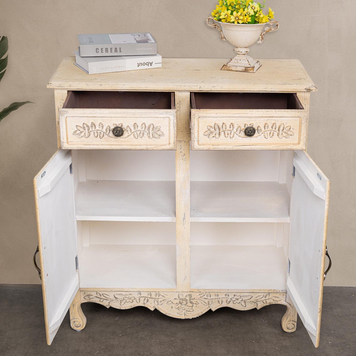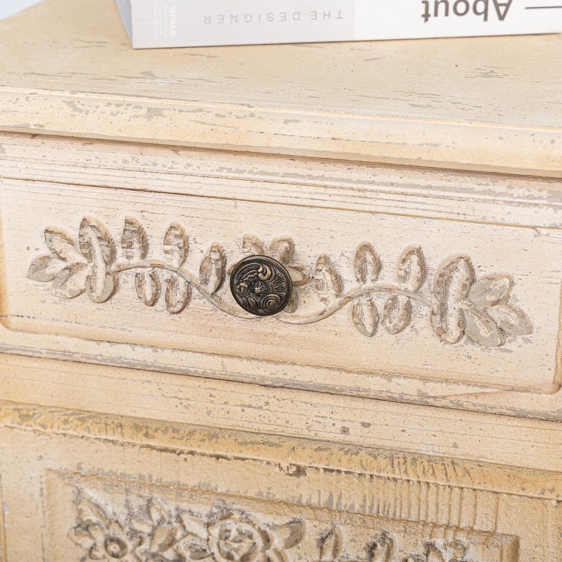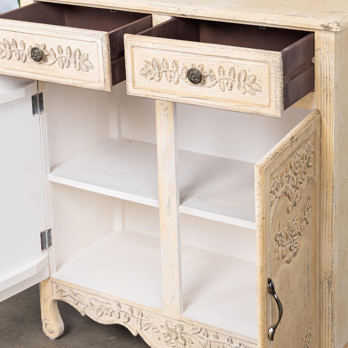 The aged ivory of her frame feels lived in, beloved, touched by memory. Drawers slide open like pages of a keepsake, the air inside faintly scented with stillness.