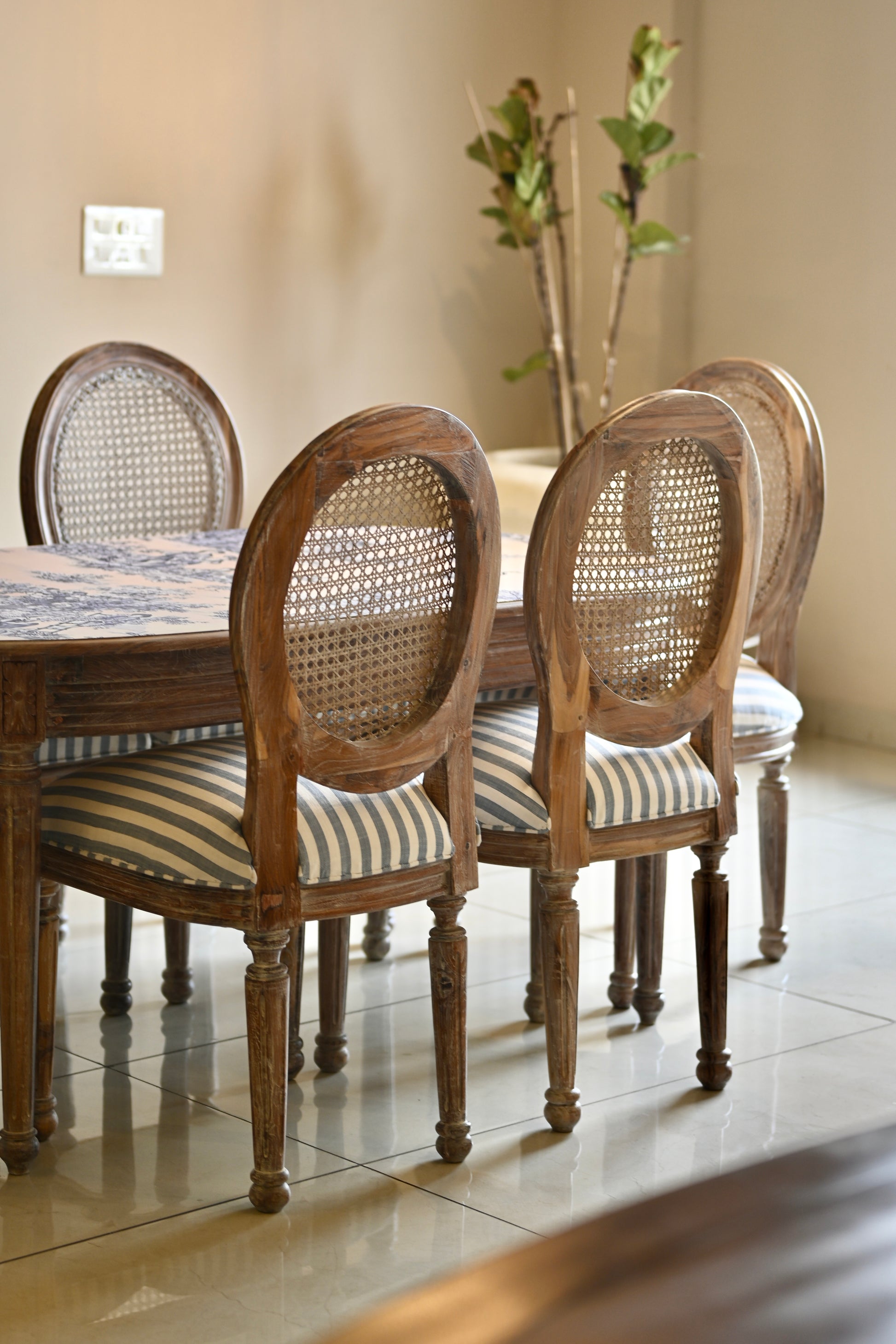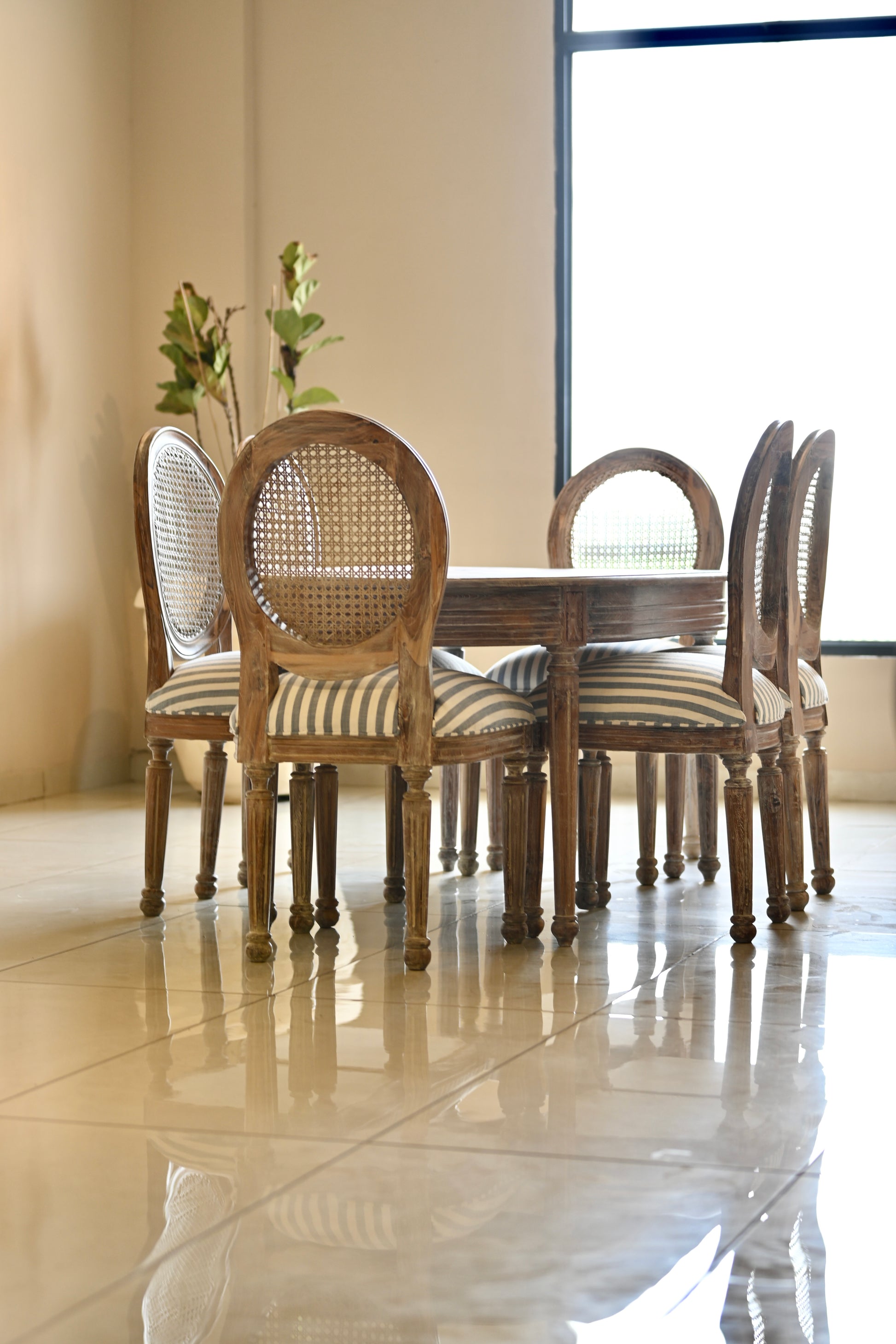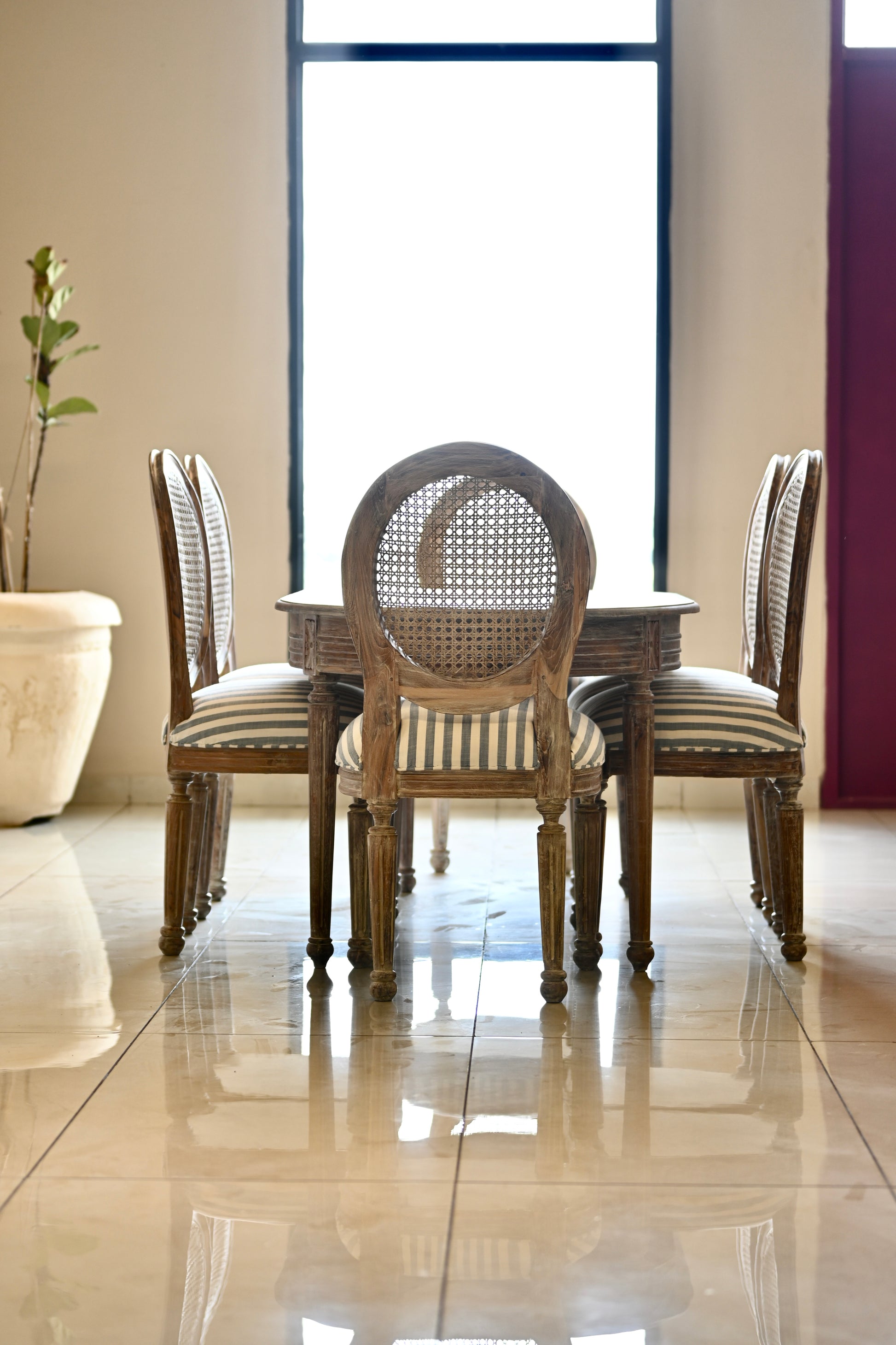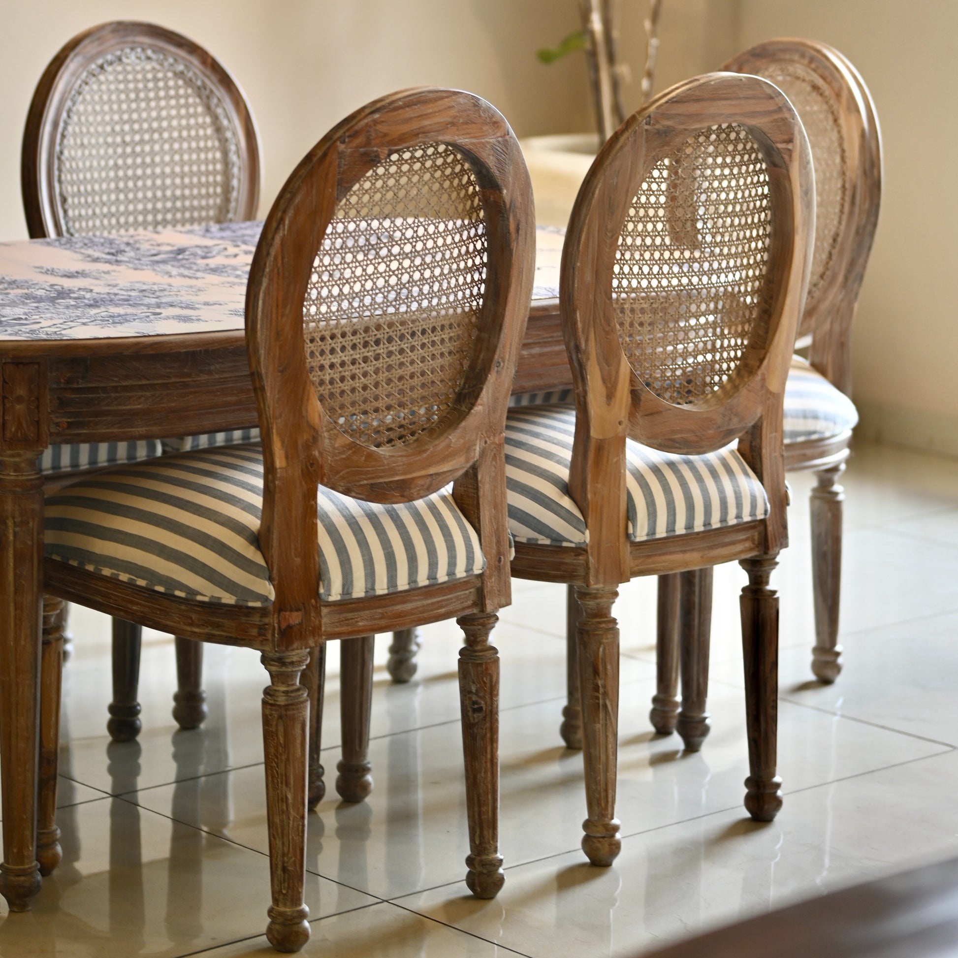 The tabletop, a canvas of reverie. The chairs, cane-kissed thrones in crisp striped couture.
