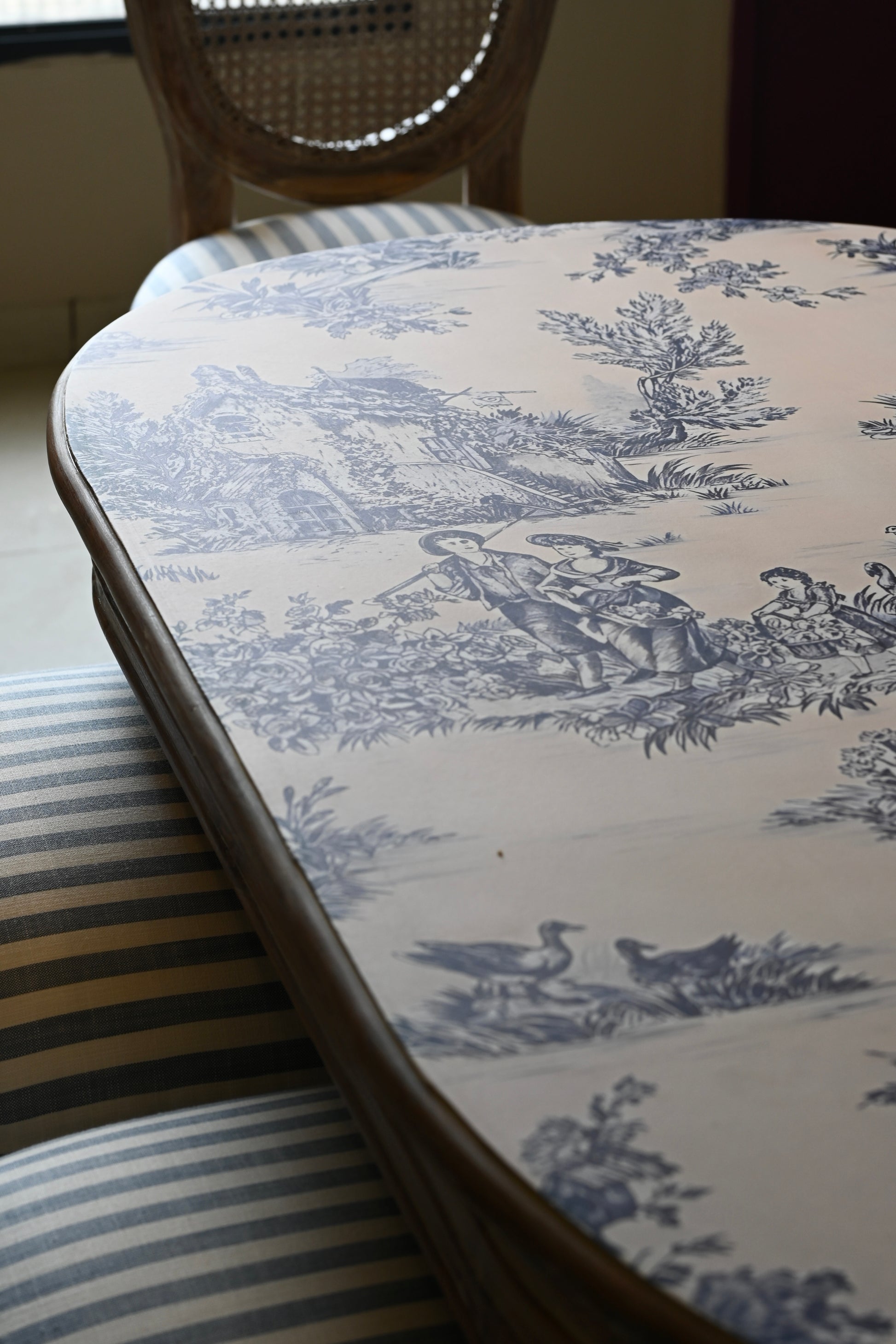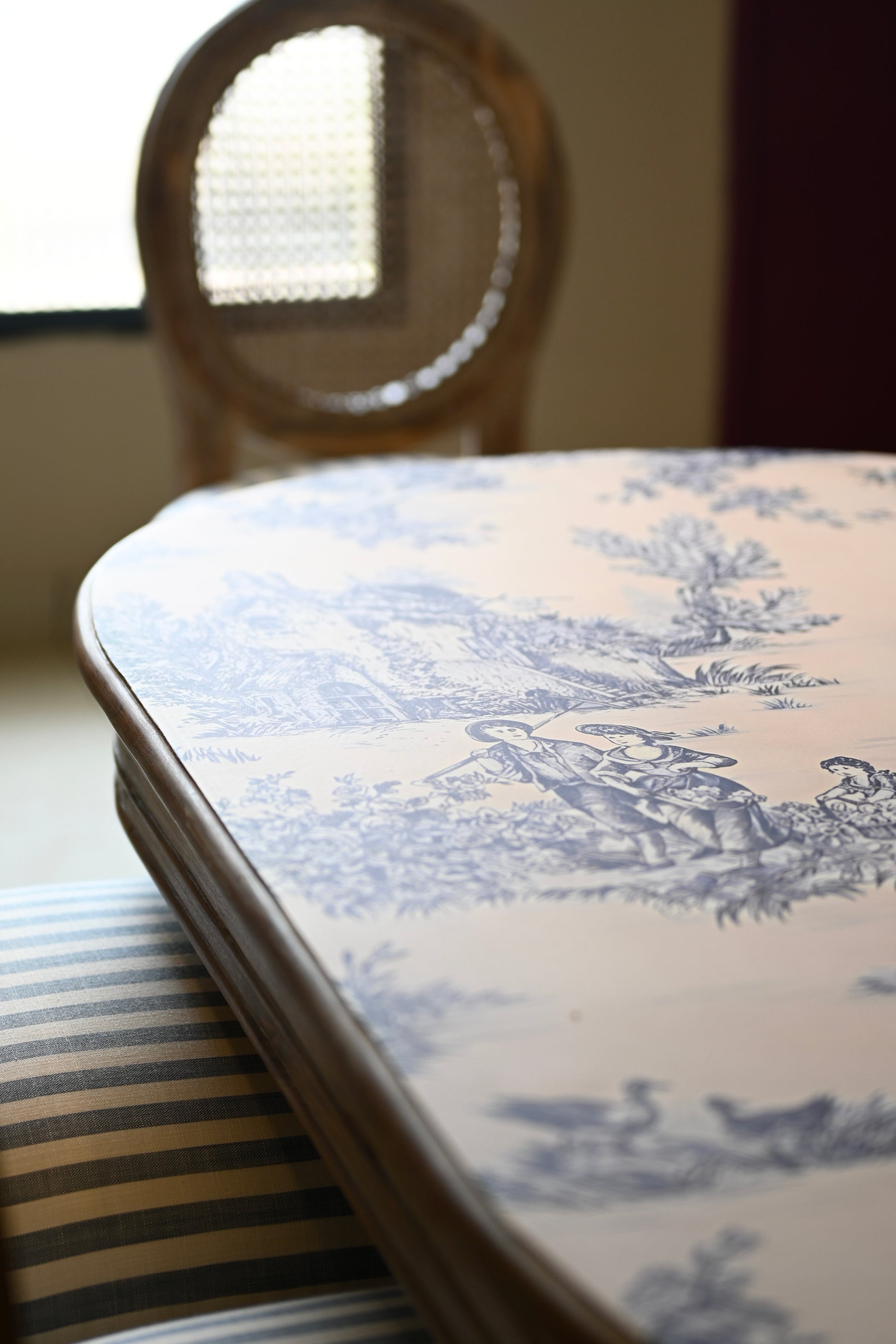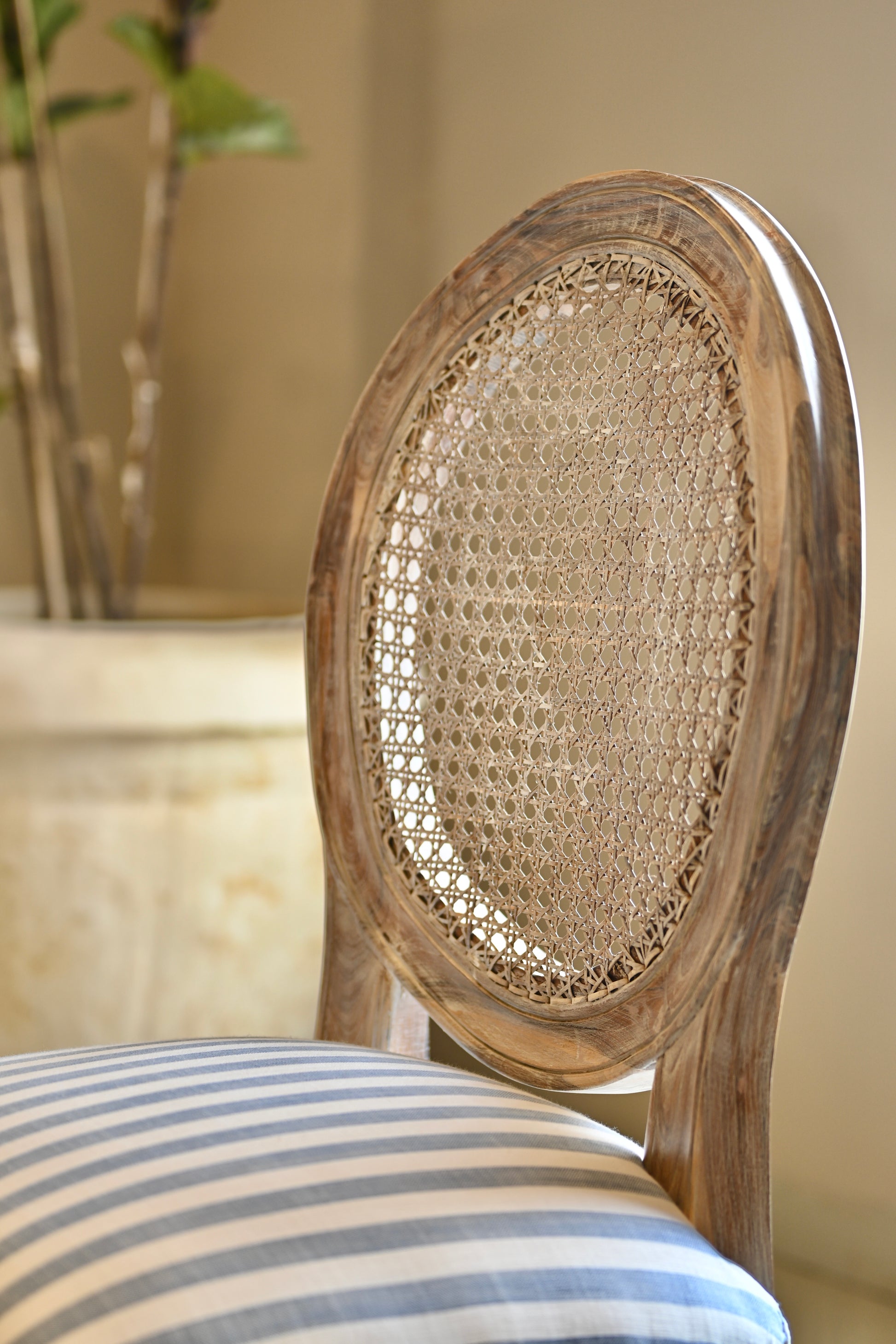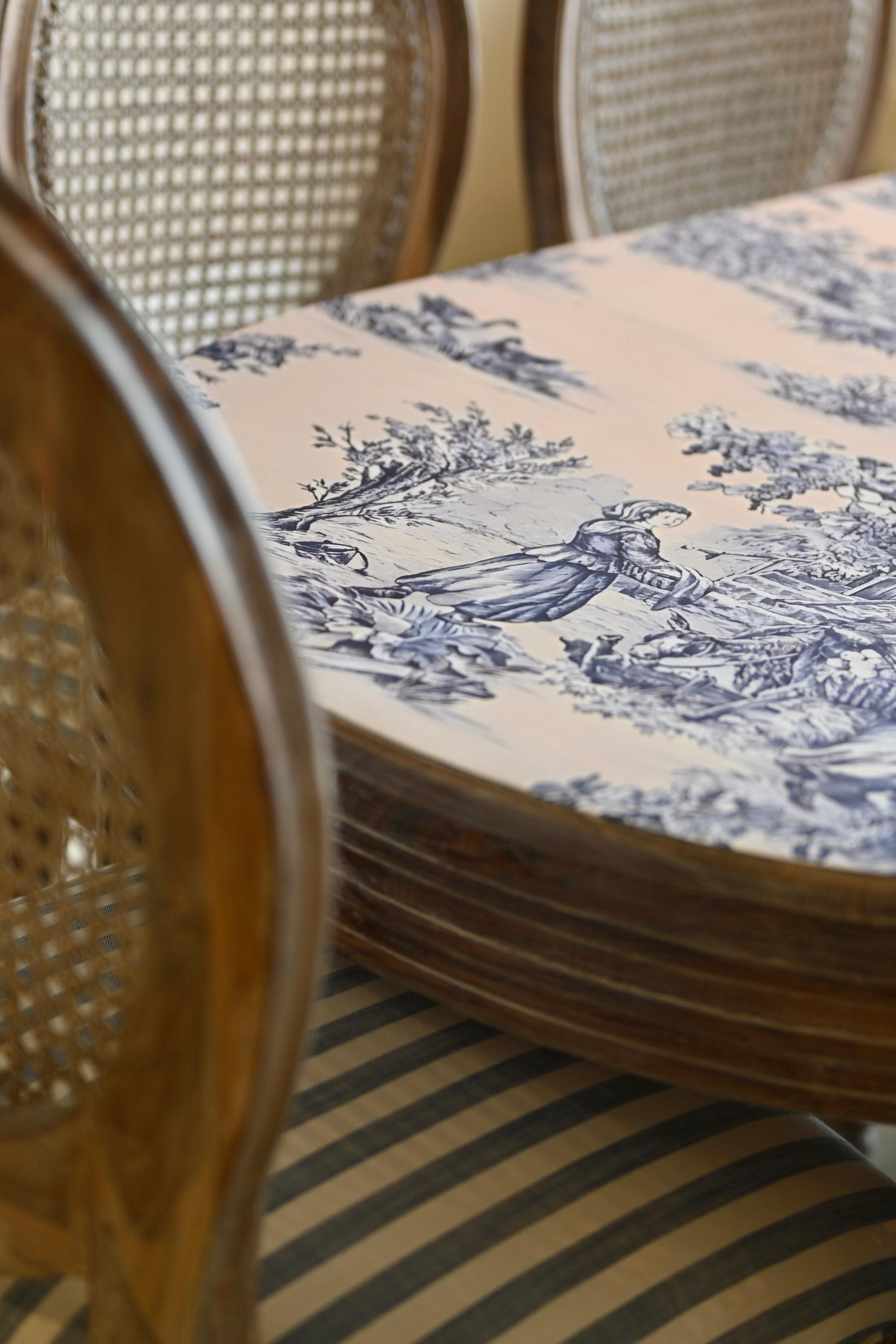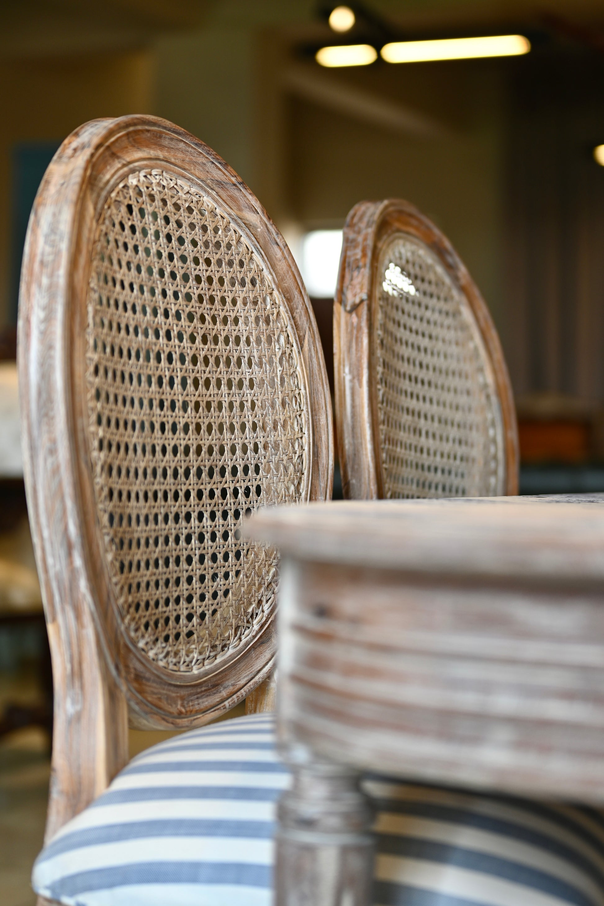 The tabletop, a canvas of reverie. The chairs, cane-kissed thrones in crisp striped couture.