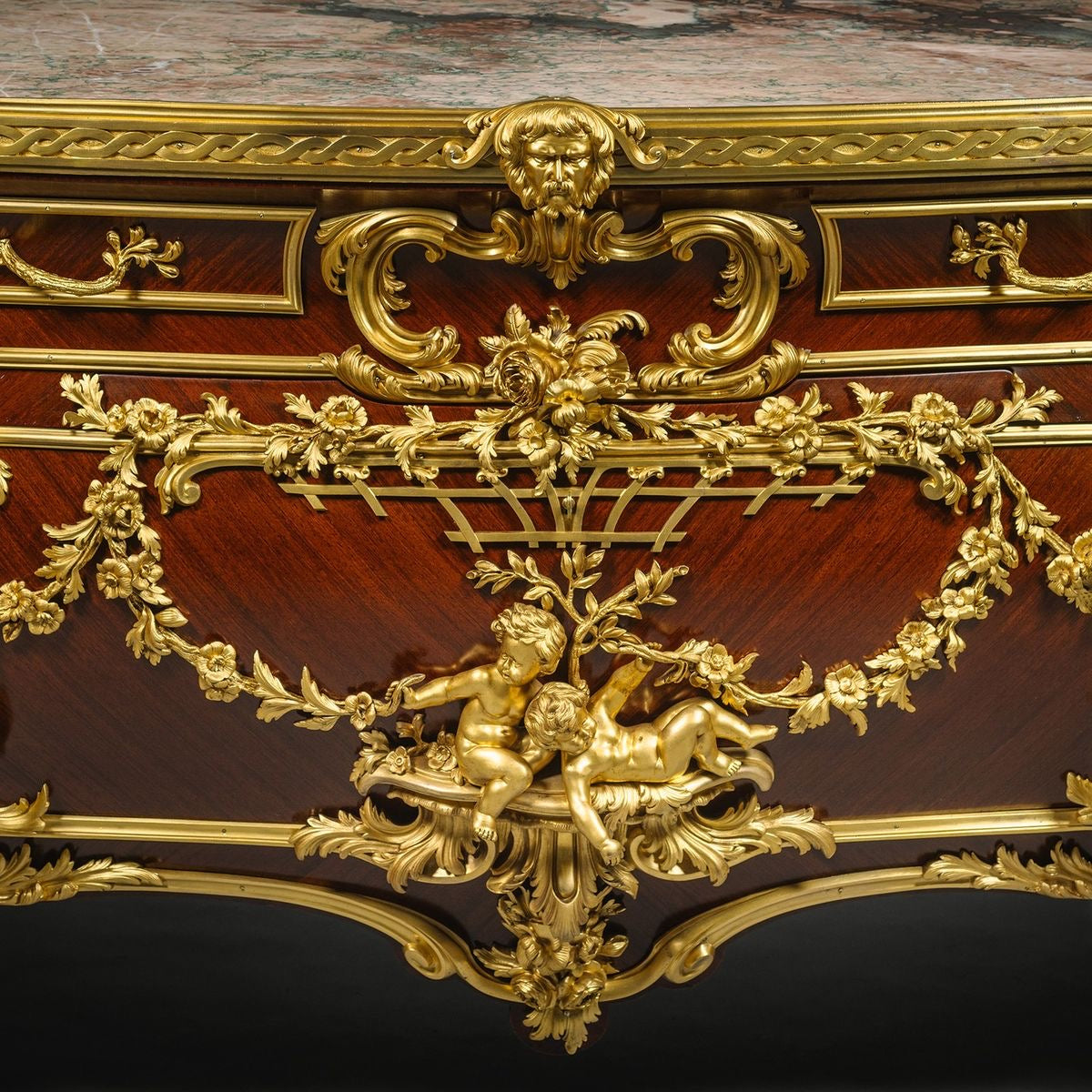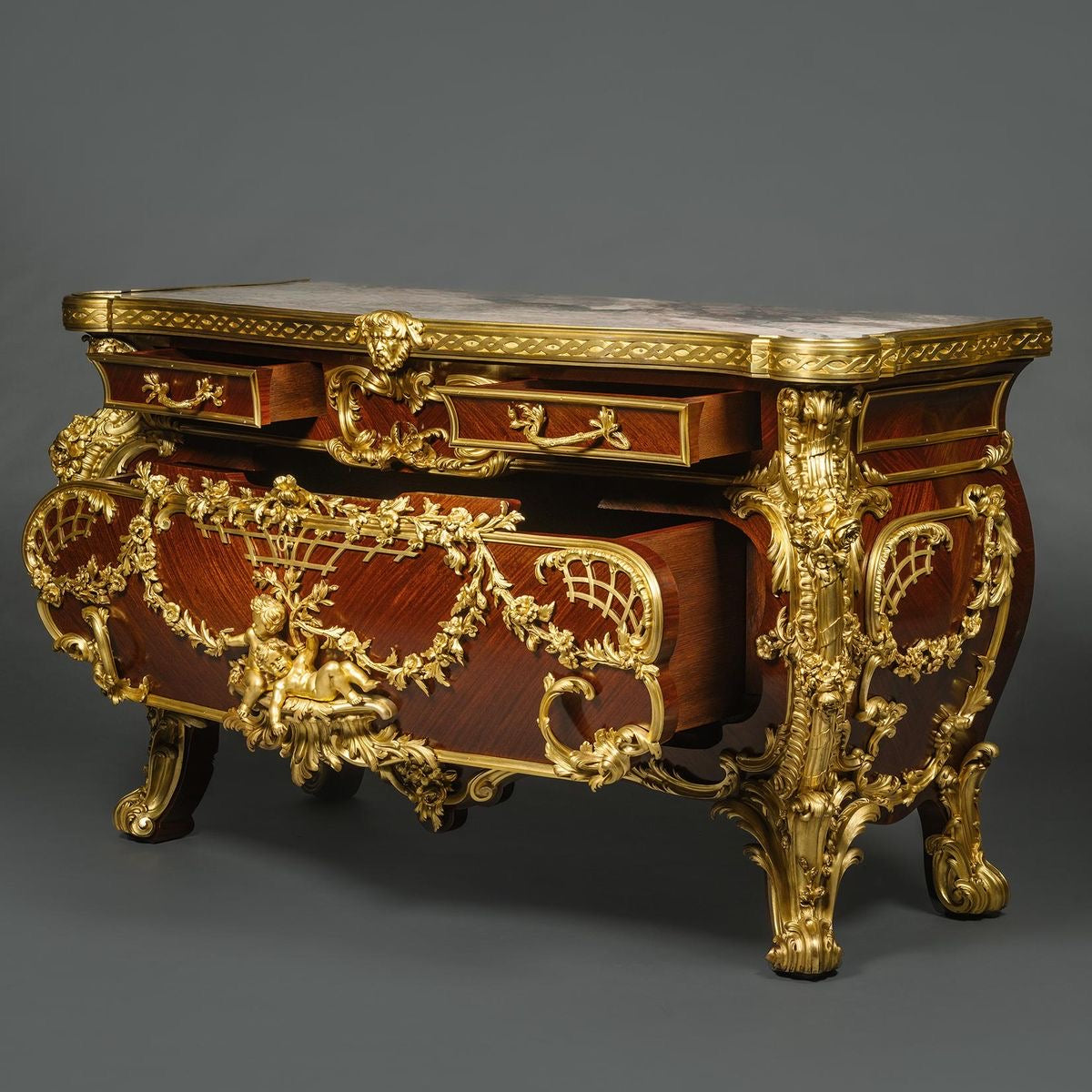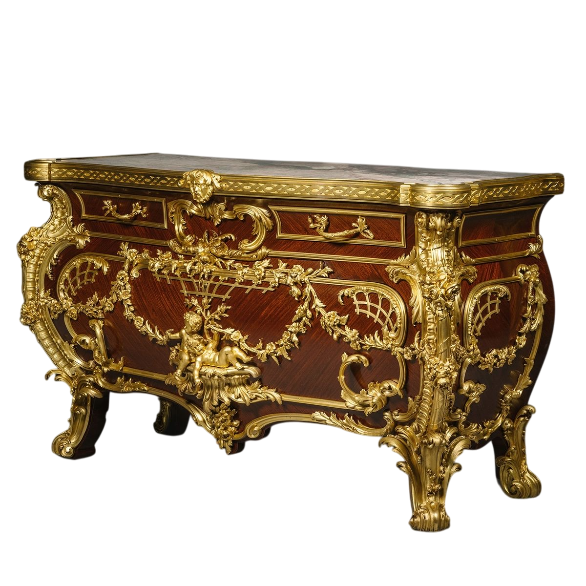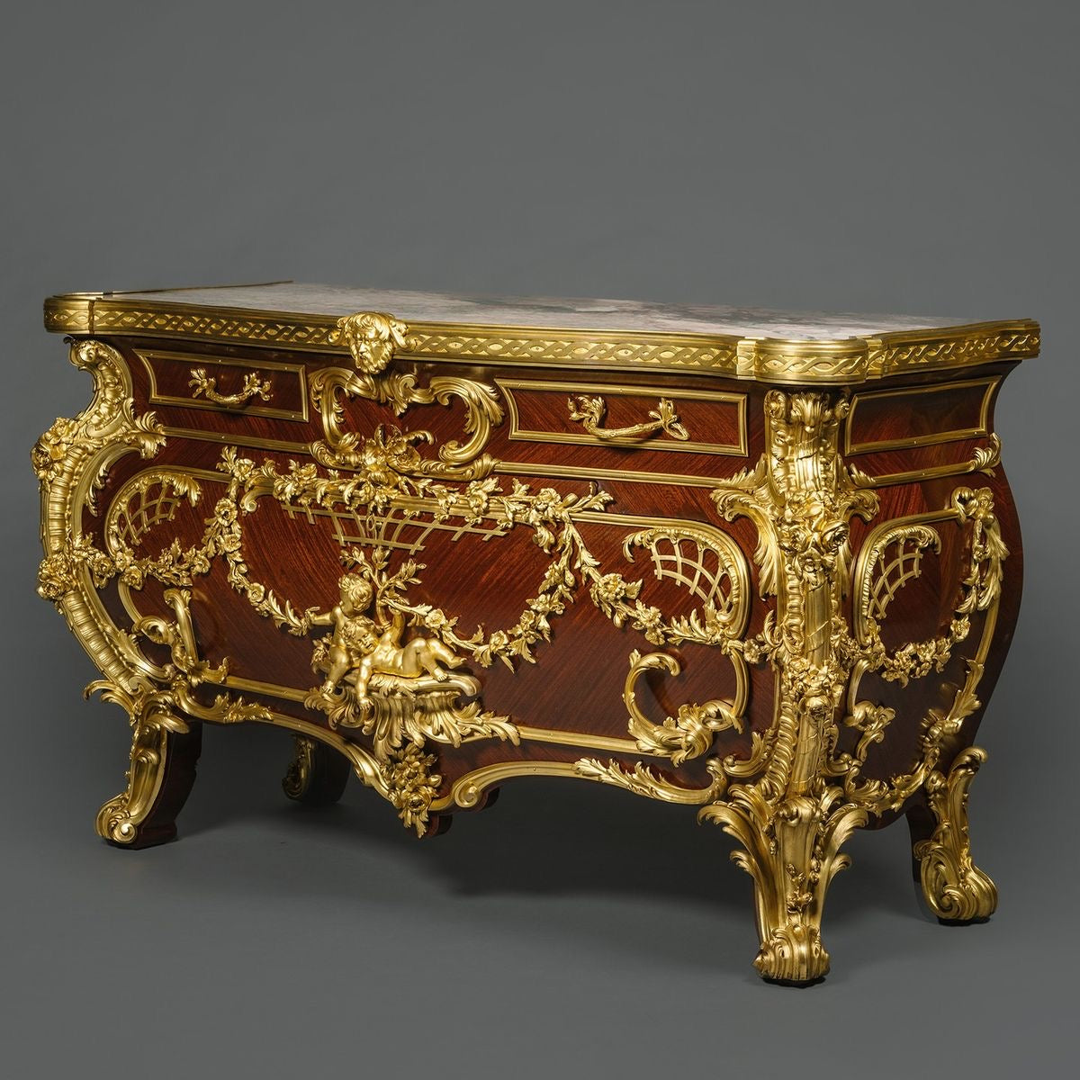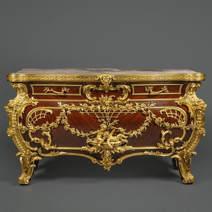 Her silhouette dares to dance: bombe curves swell in defiance, and the gold-leafed bronzework coils like a secret whispered across centuries.