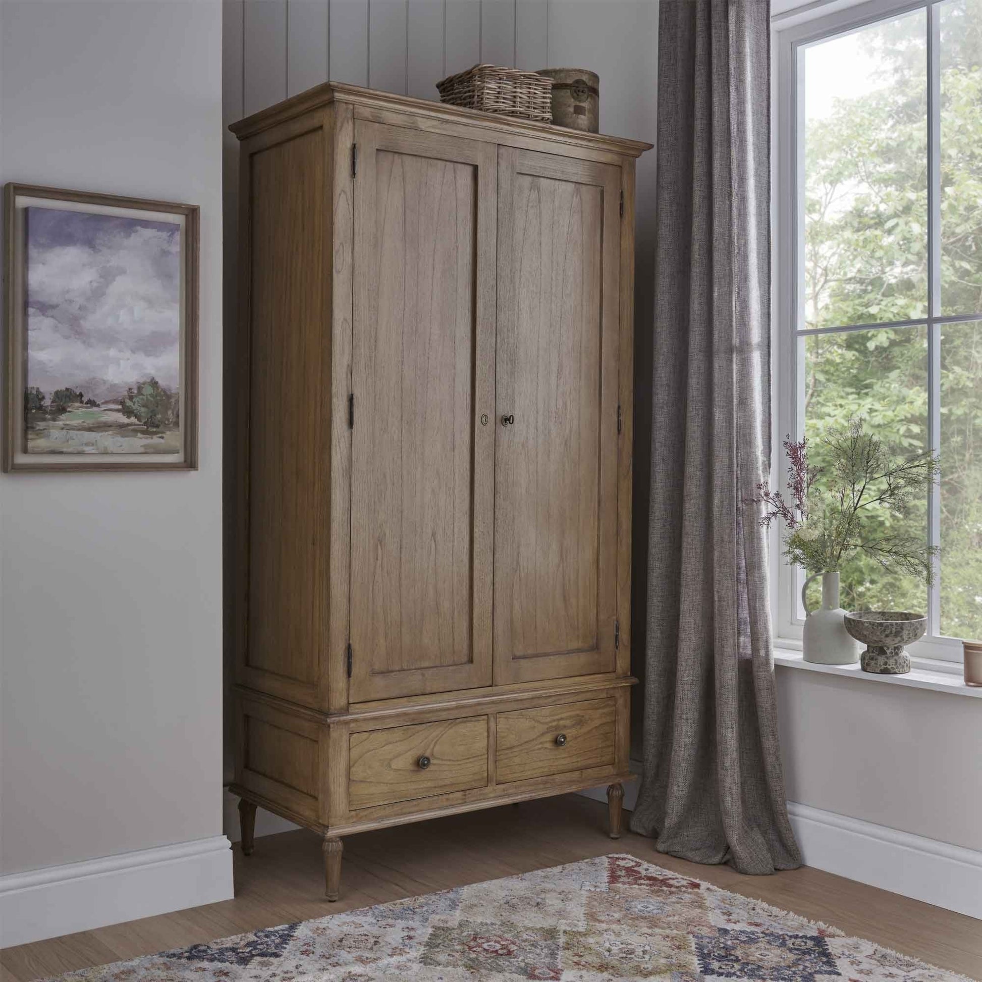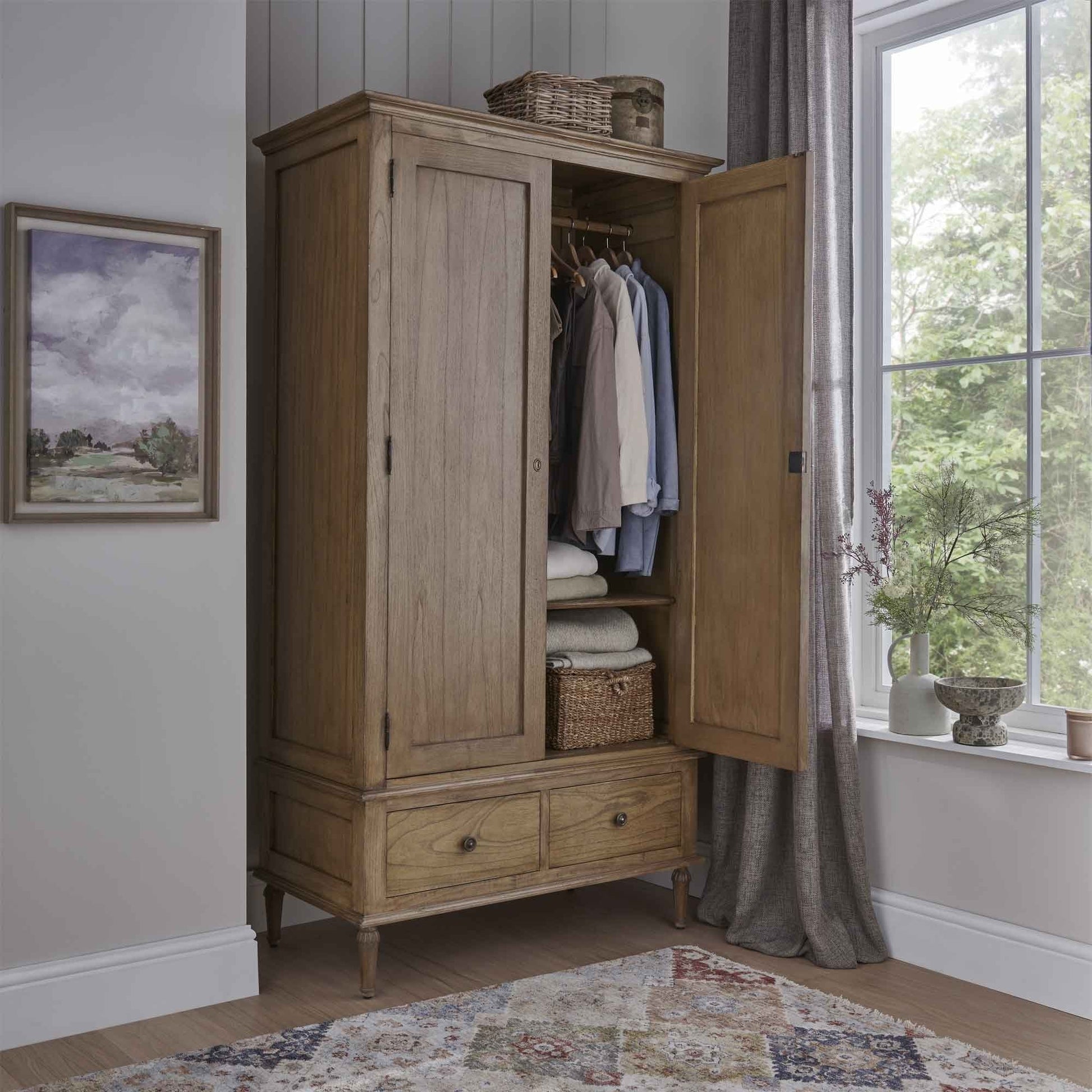 This armoire, noble yet unpretentious, cradles your fineries with an air of cultivated ease. Twin doors stand sentinel over a haven of order, while the deep-set drawers below safeguard life’s ephemeral treasures.