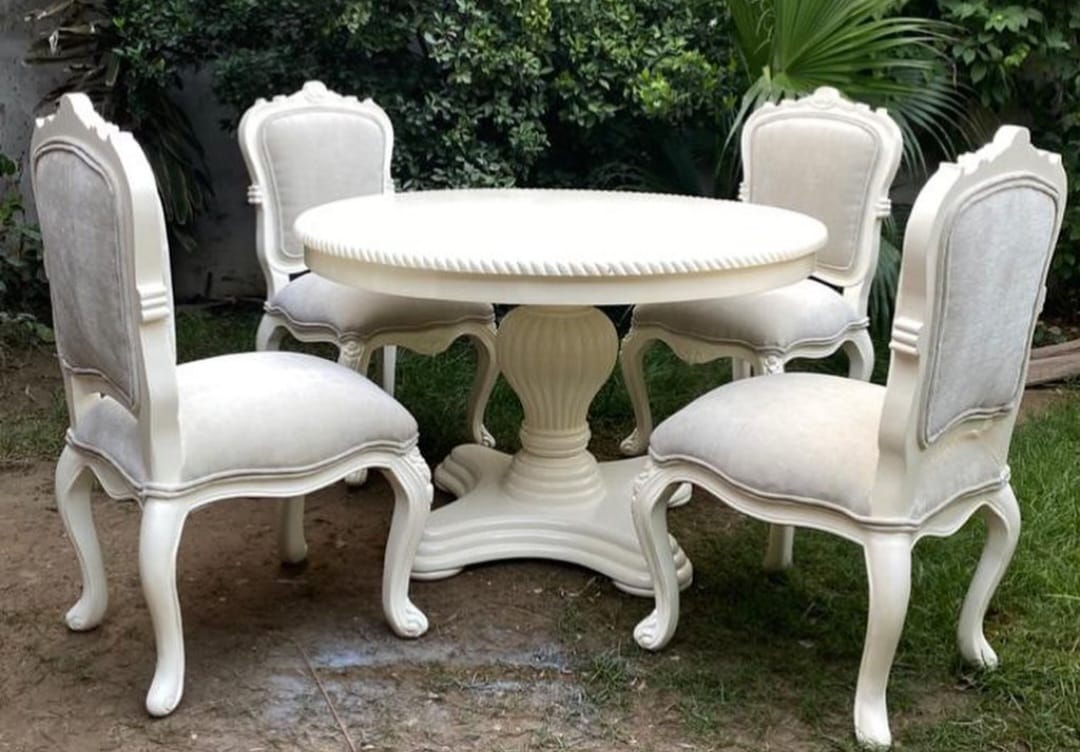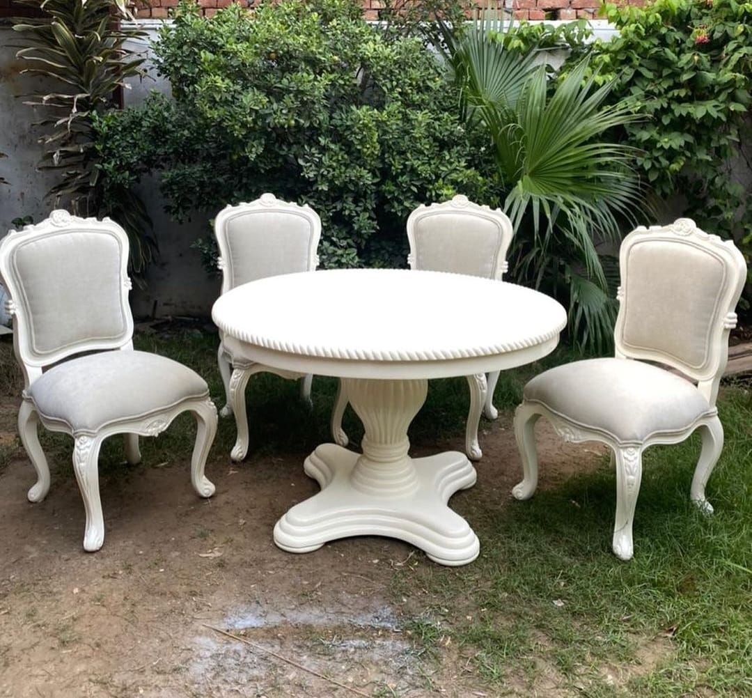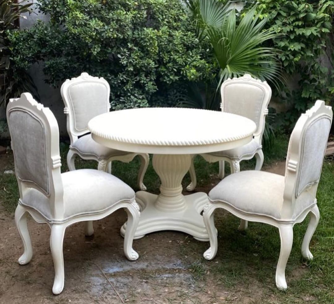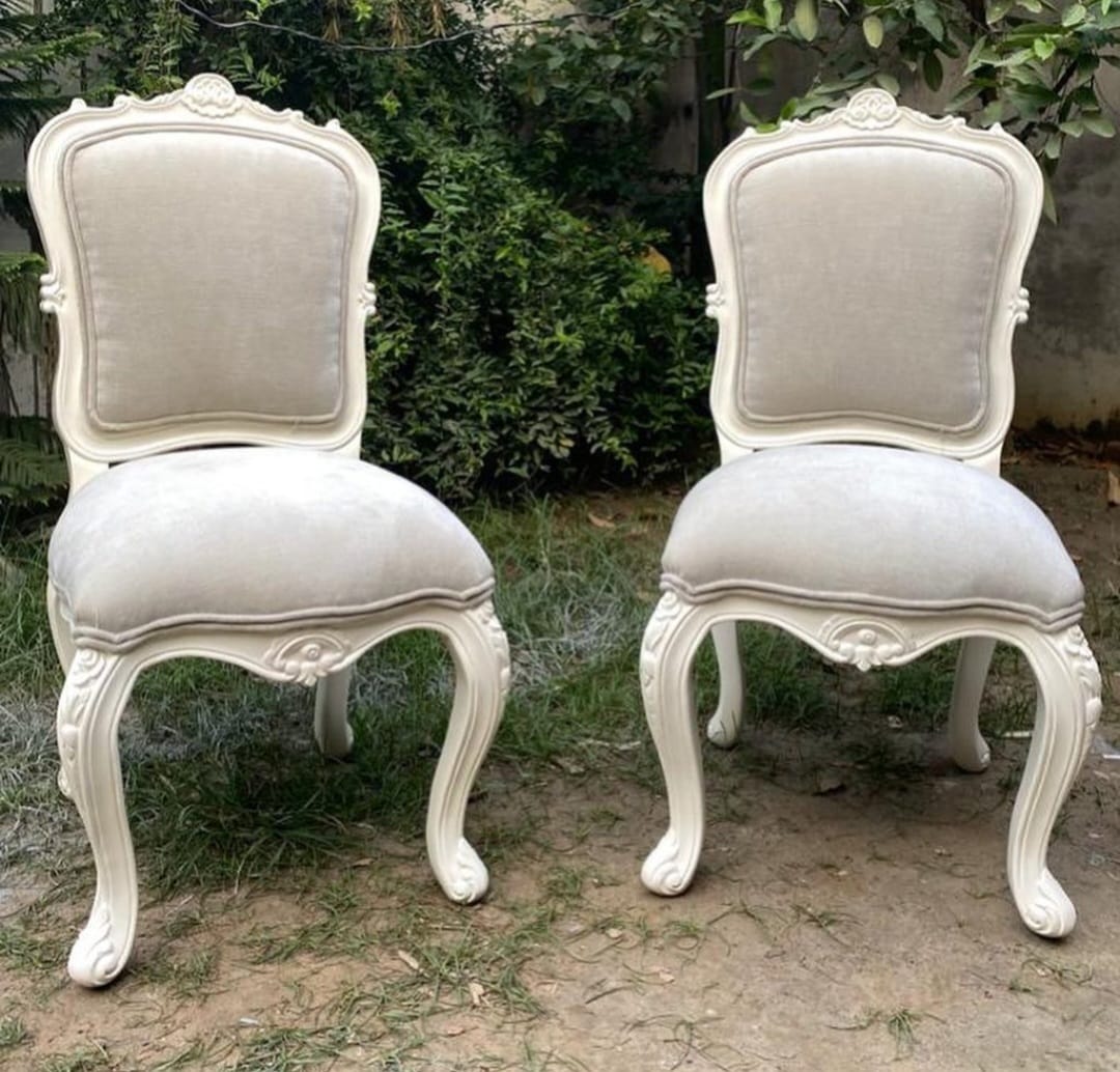Each chair invites—arched, poised, and dressed in clouded velvet. The set gathers like a secret kept in bloom, held in place by craftsmanship that breathes intention.