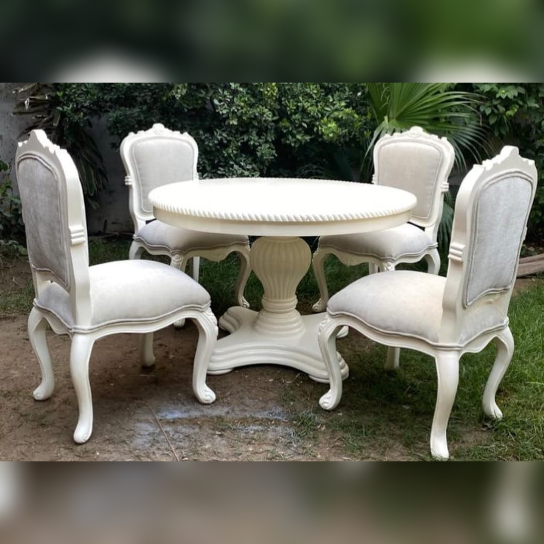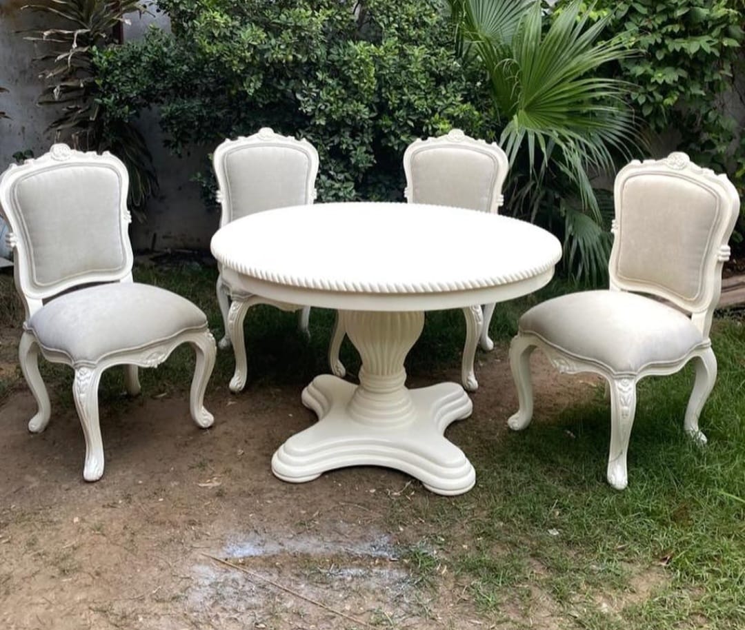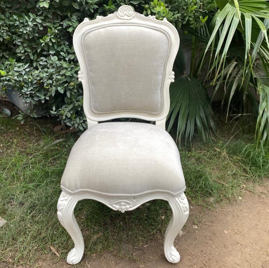 Each chair invites—arched, poised, and dressed in clouded velvet. The set gathers like a secret kept in bloom, held in place by craftsmanship that breathes intention.