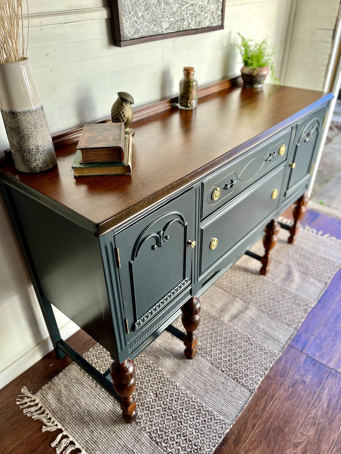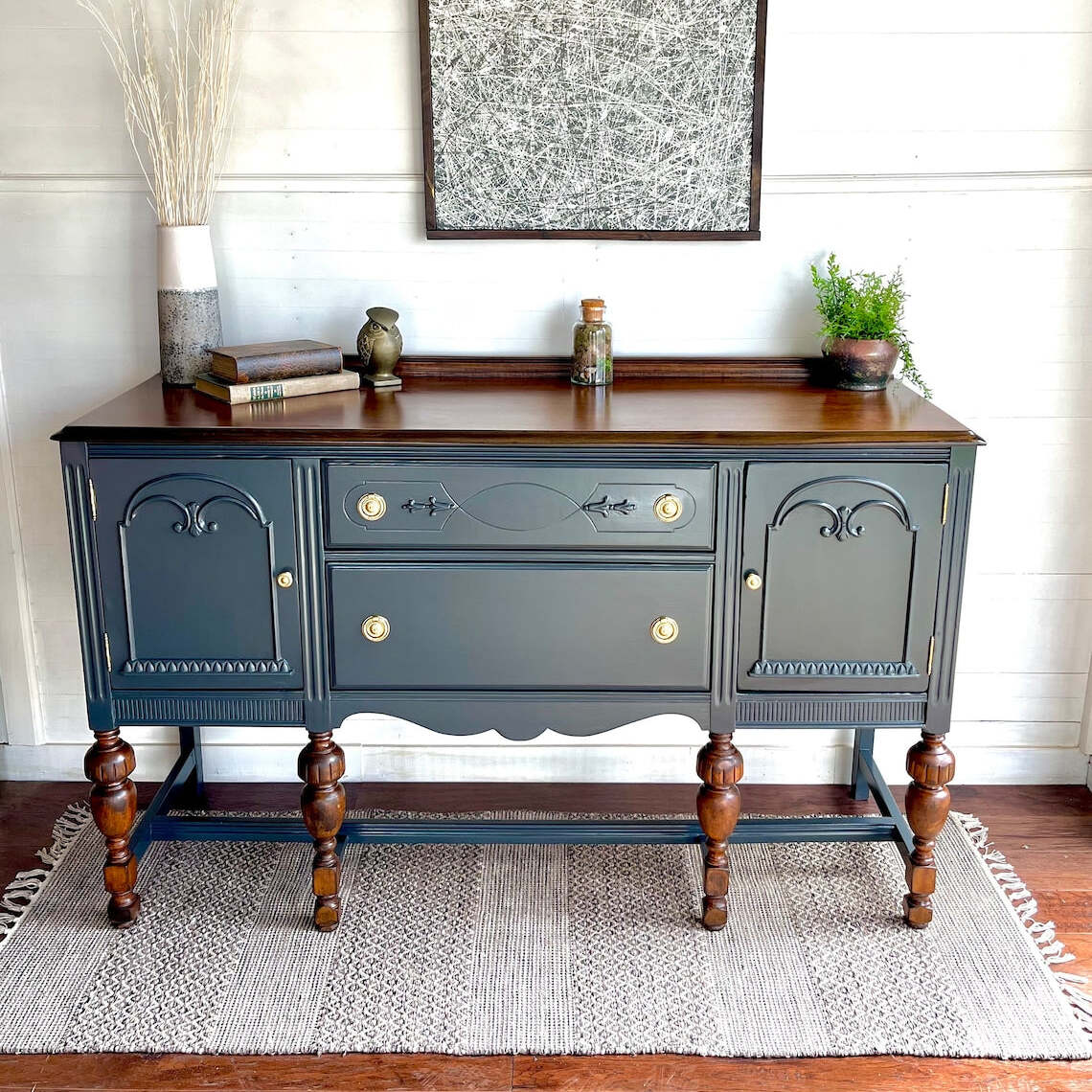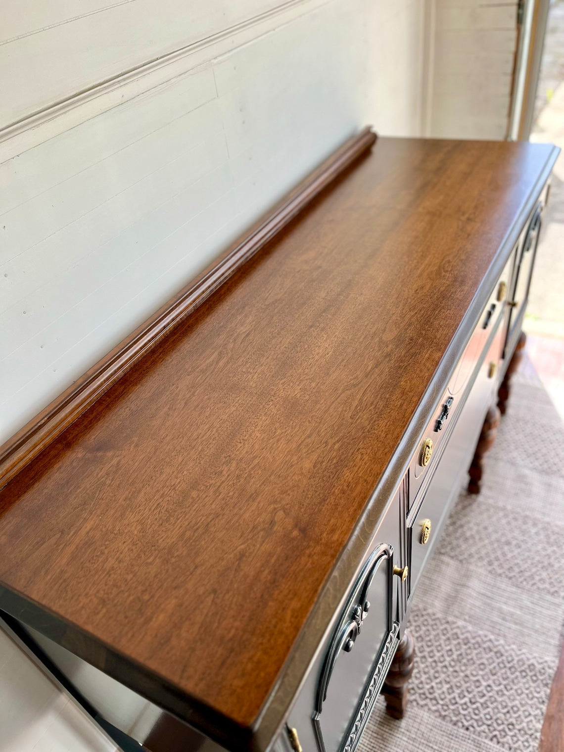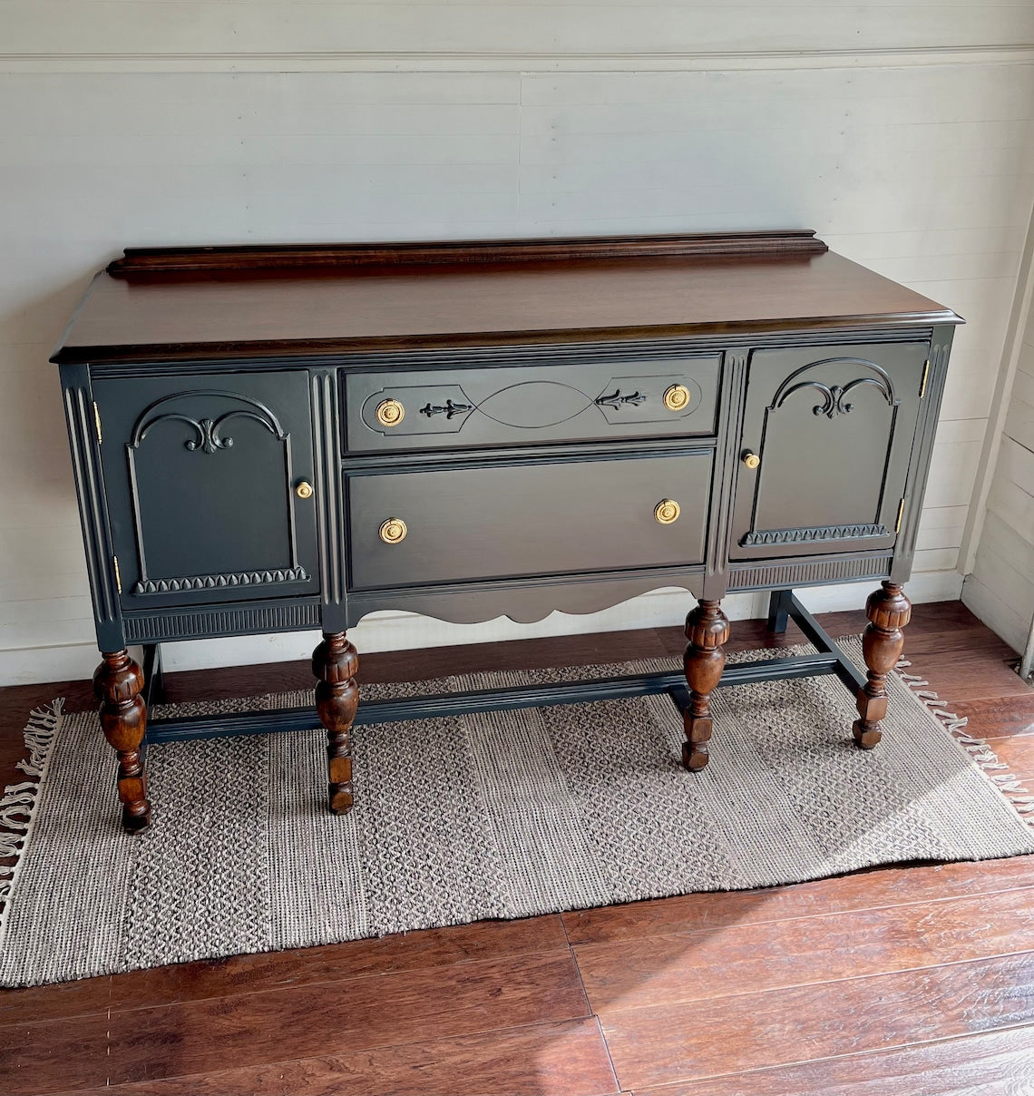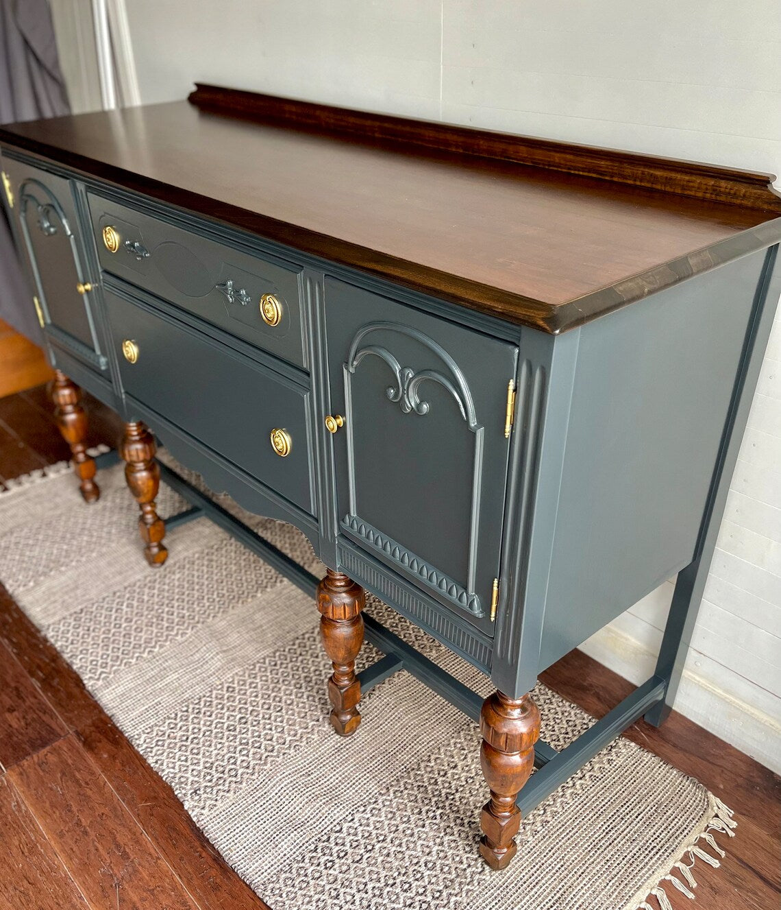 Graceful carvings dance upon its surface, while the warm wood top whispers secrets of Parisian salons and candlelit suppers. Brass knobs, charmingly antique, add just the right sprinkle of je ne sais quoi.