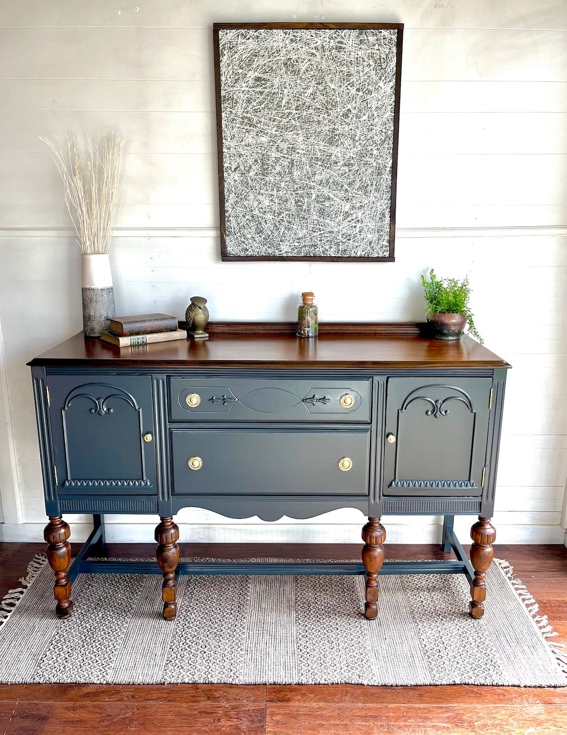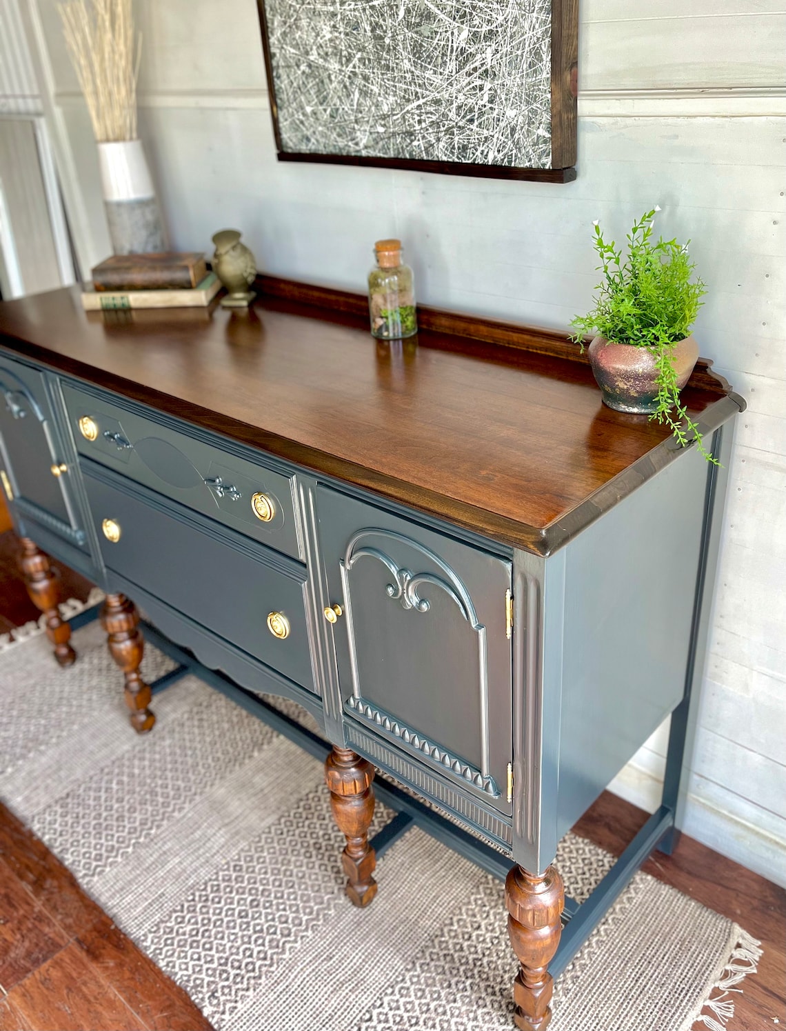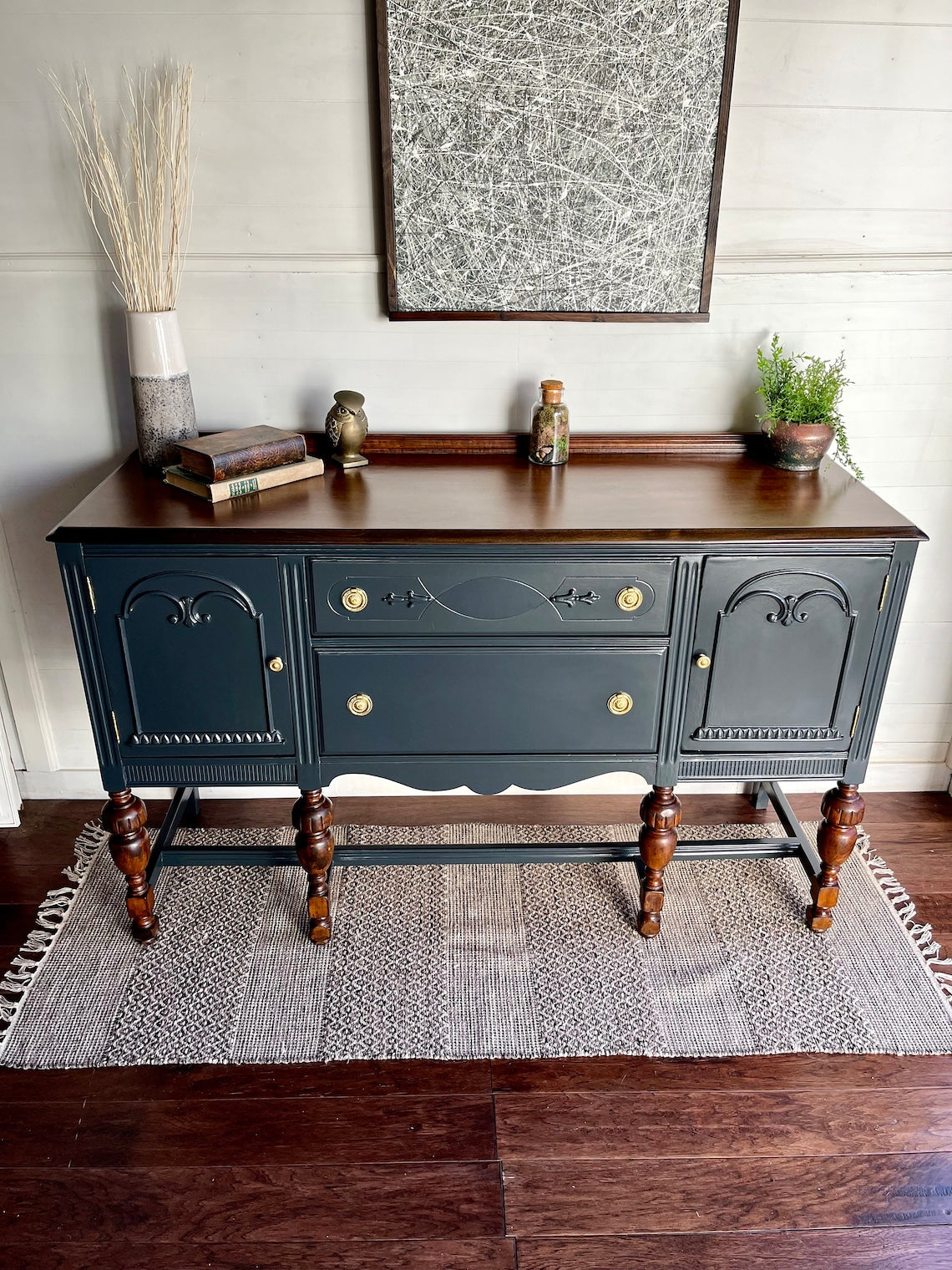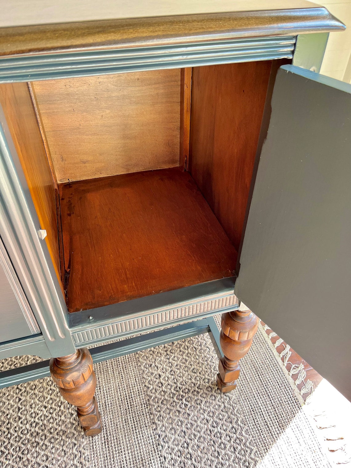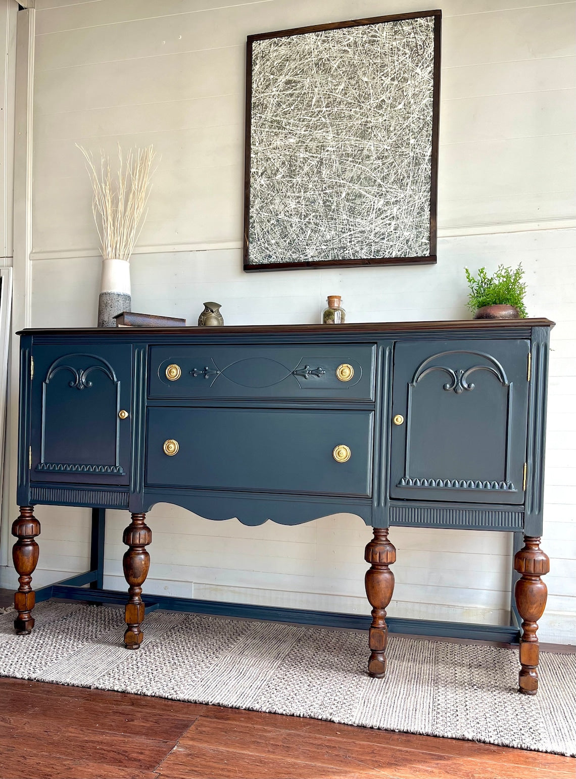 Graceful carvings dance upon its surface, while the warm wood top whispers secrets of Parisian salons and candlelit suppers. Brass knobs, charmingly antique, add just the right sprinkle of je ne sais quoi.