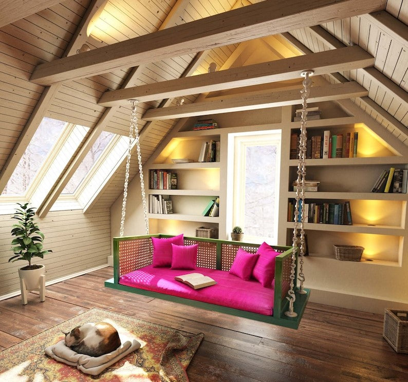 She floats beneath the rafters like a secret in celebration — her green frame grounded in calm, her bright magenta cushions bursting like spring in full bloom.