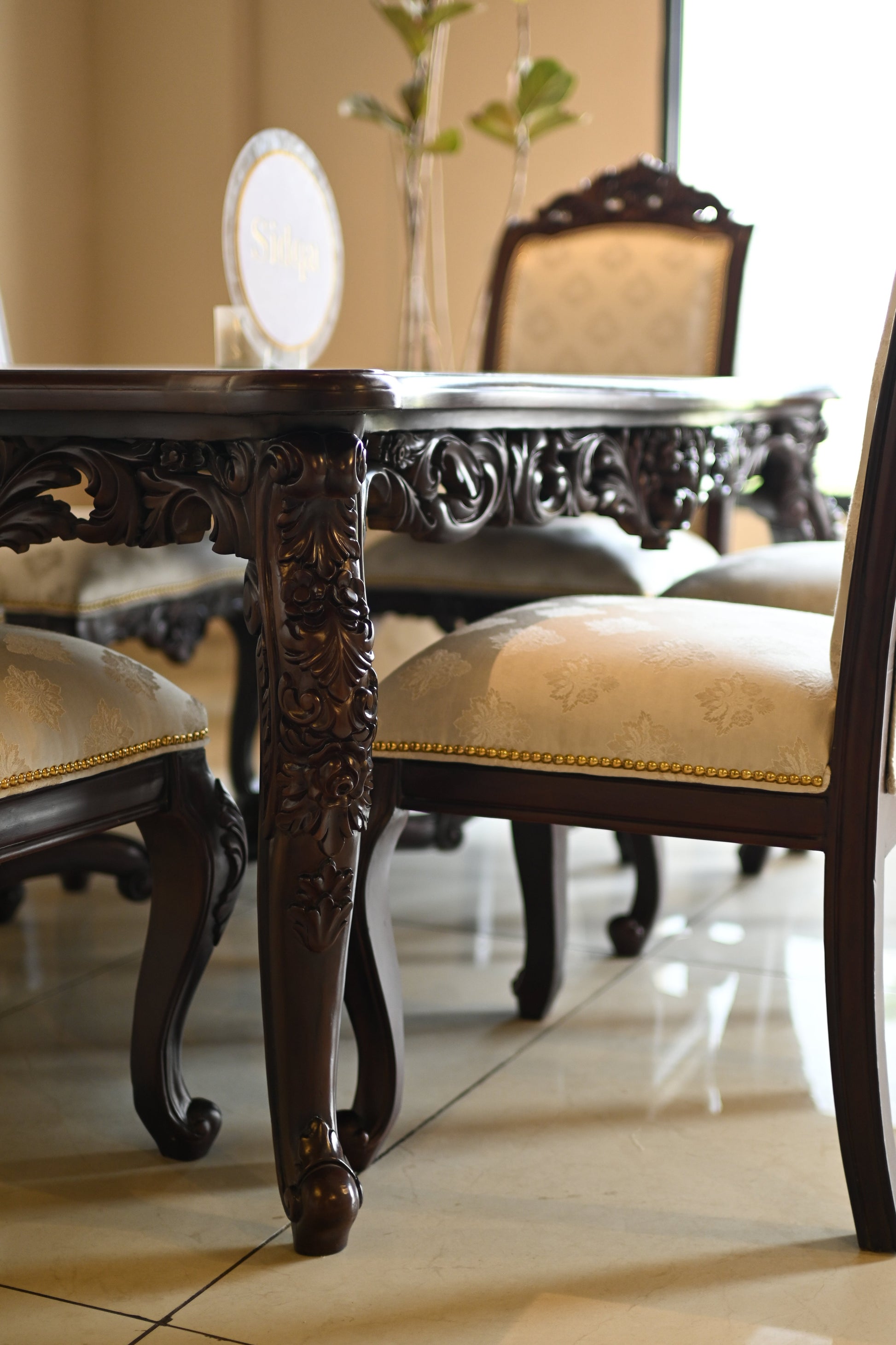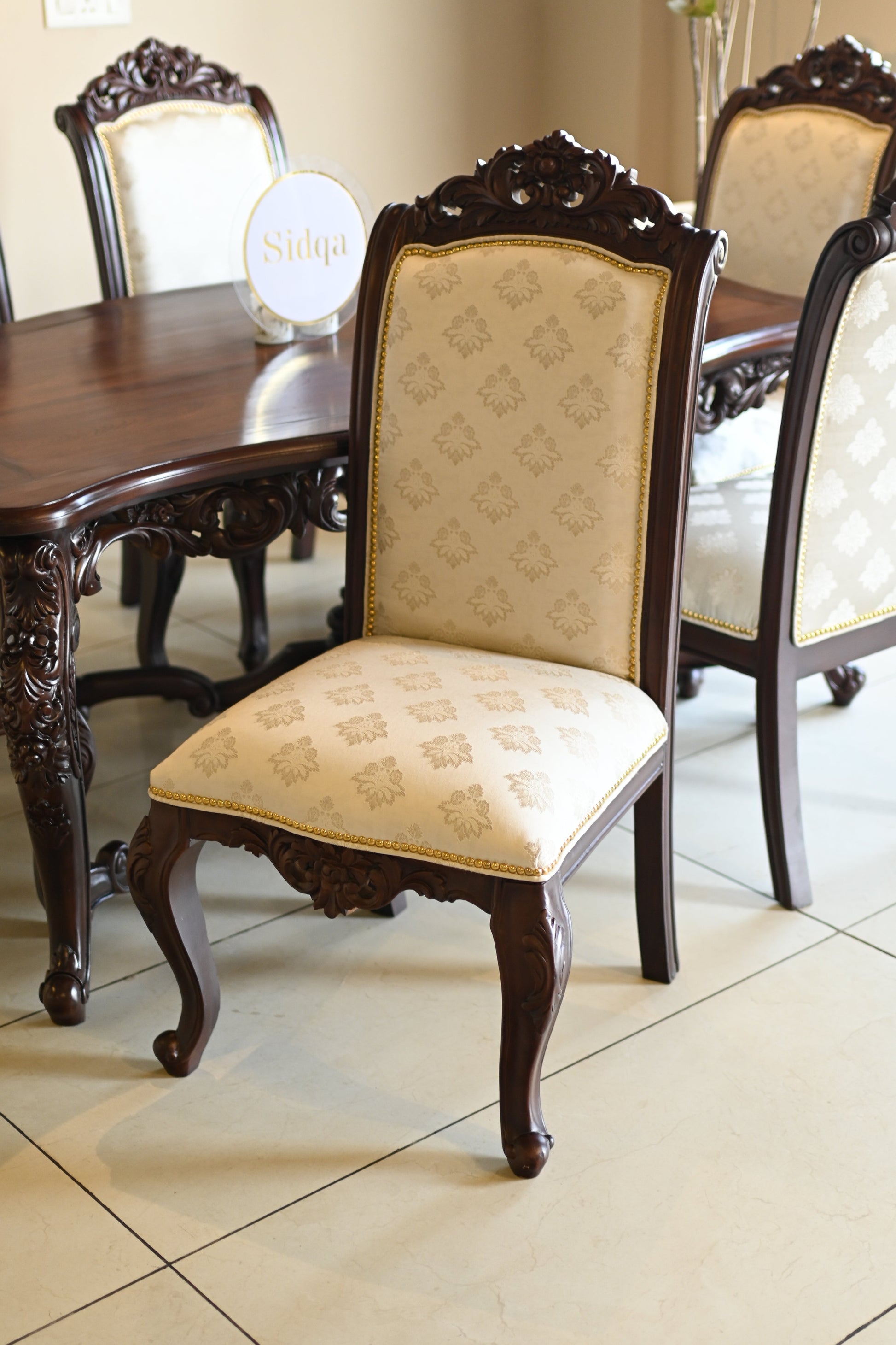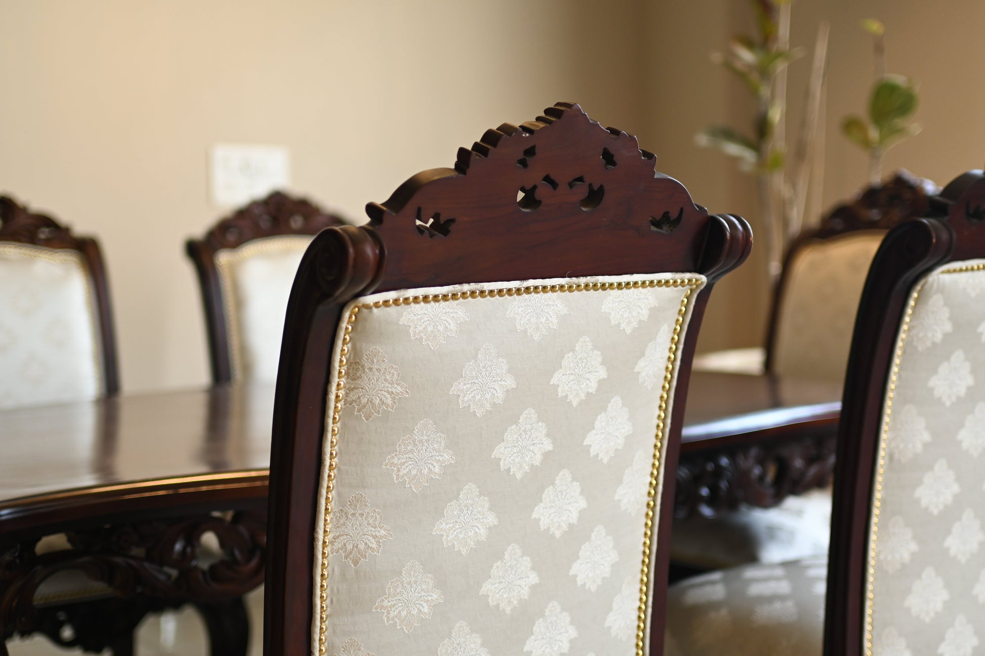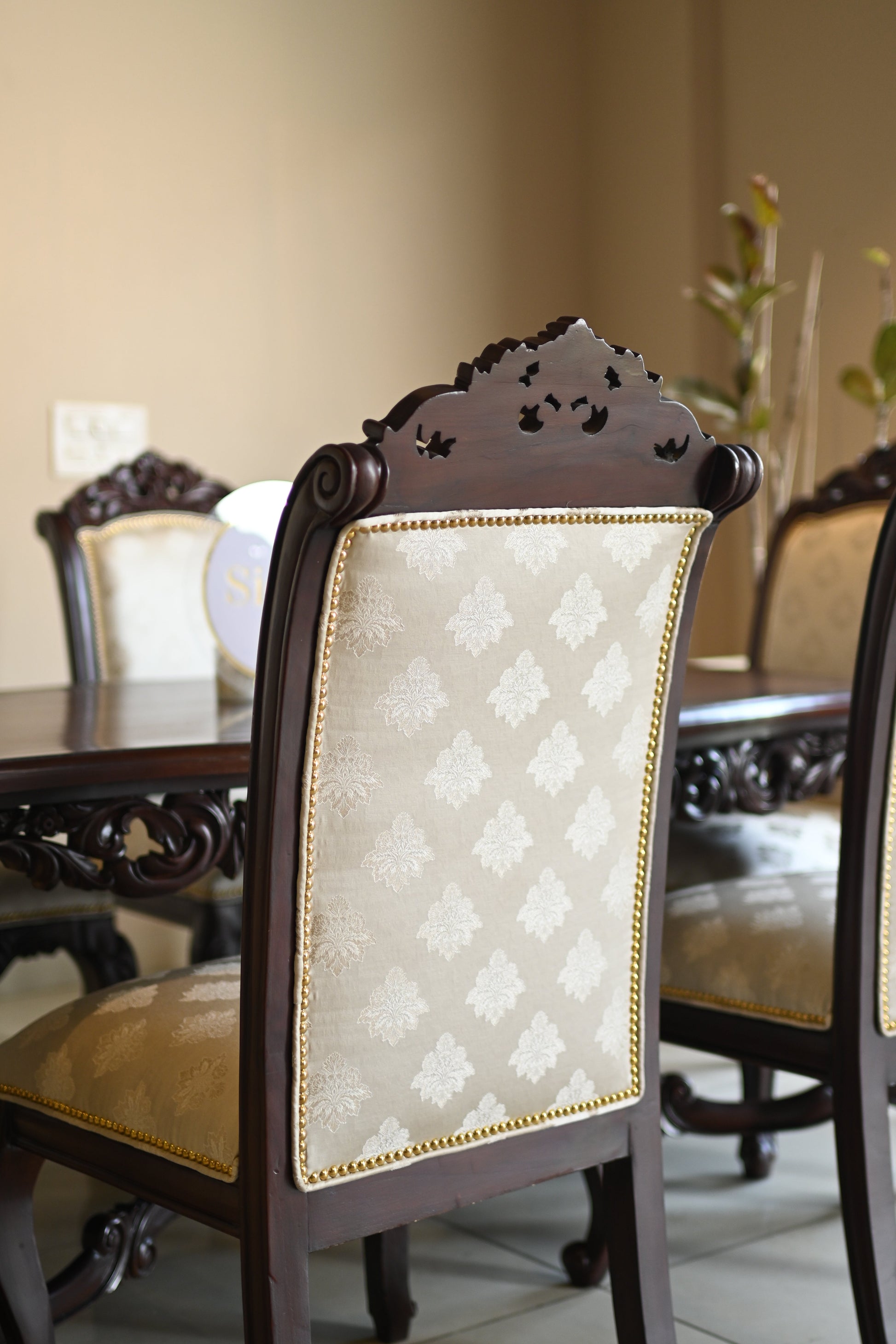 The table rests on elaborately hand-carved legs, exuding the quiet power of legacy, while each chair carries the poise of a throne — detailed with scrollwork, floral crests, and golden studding.