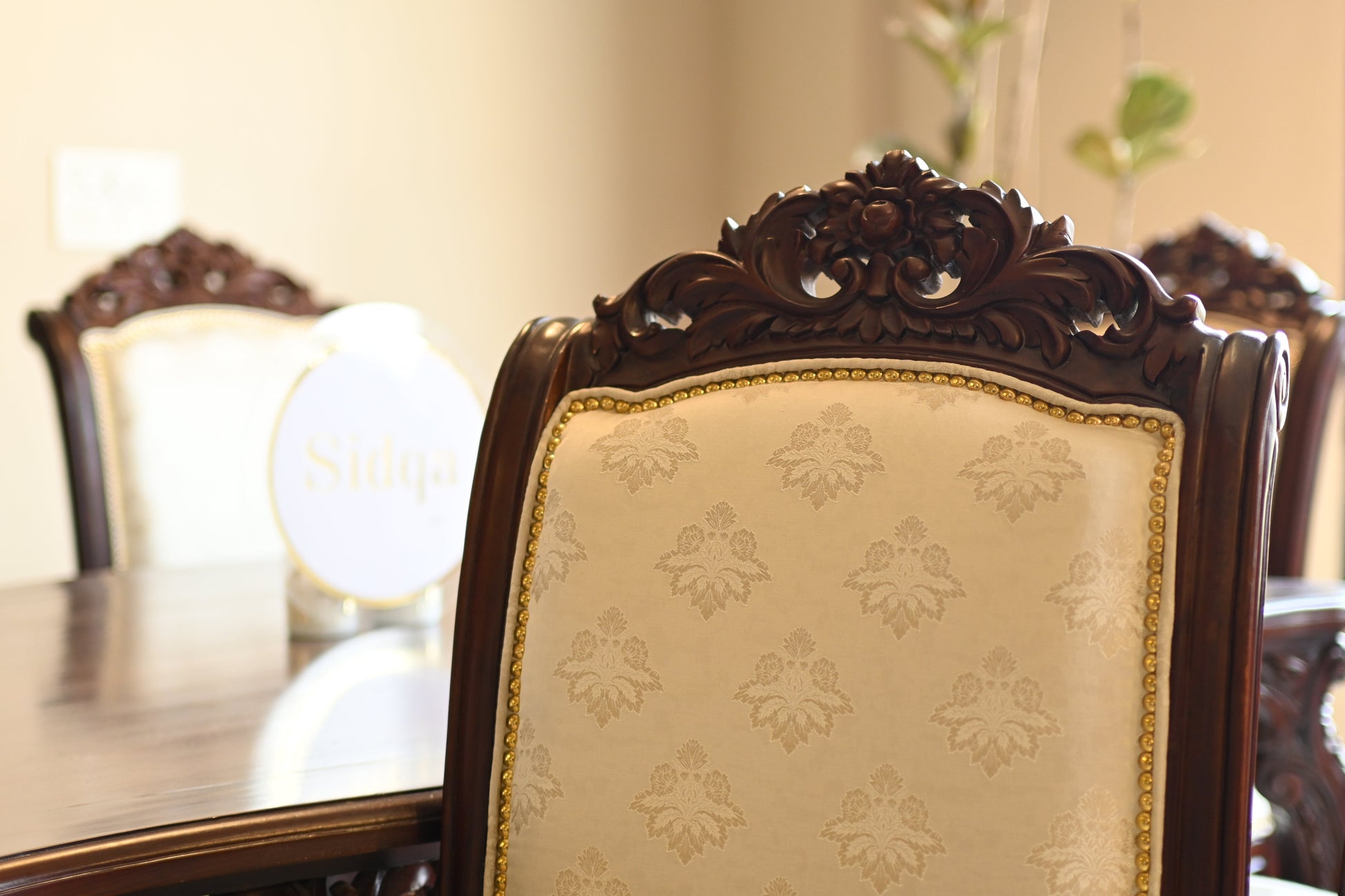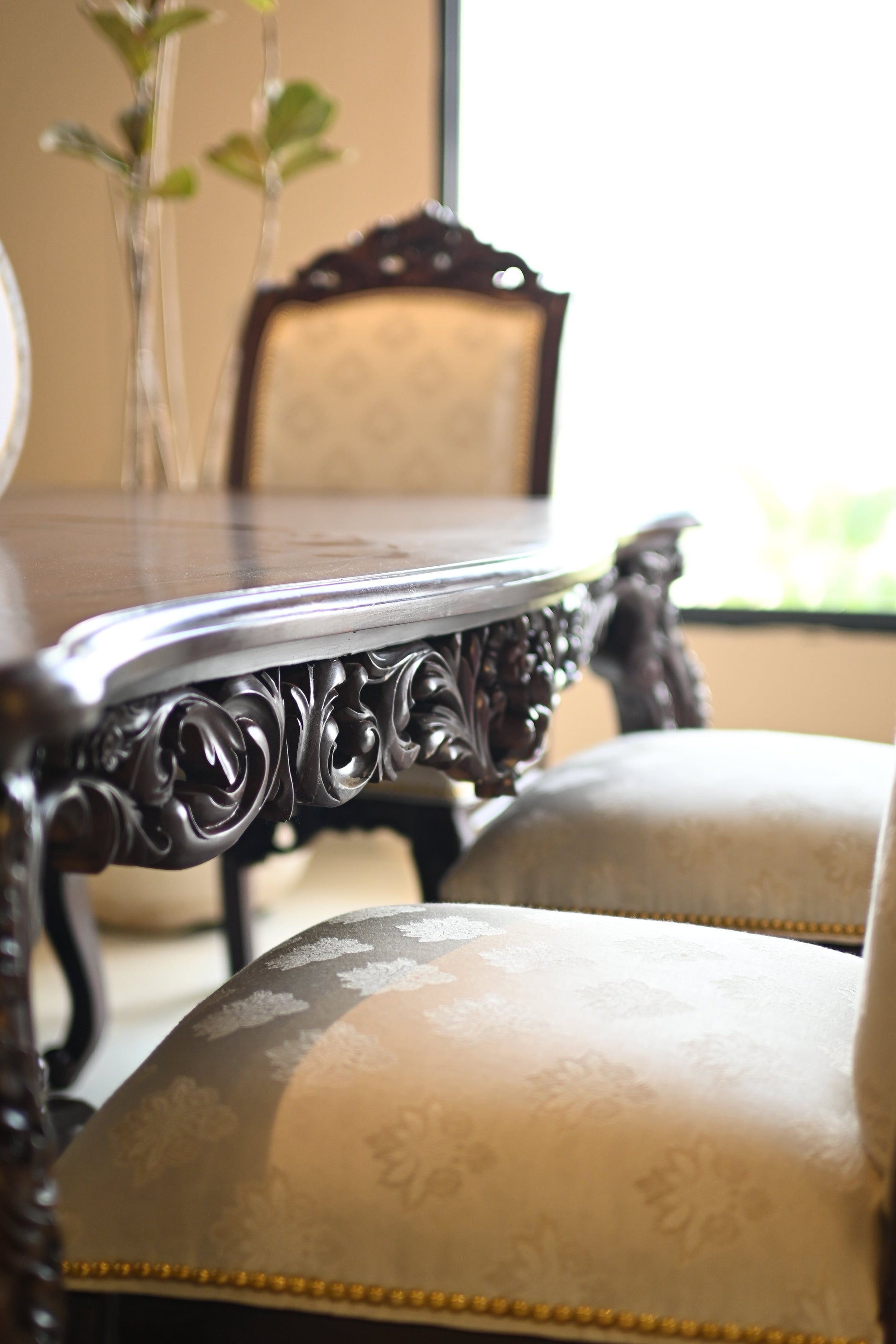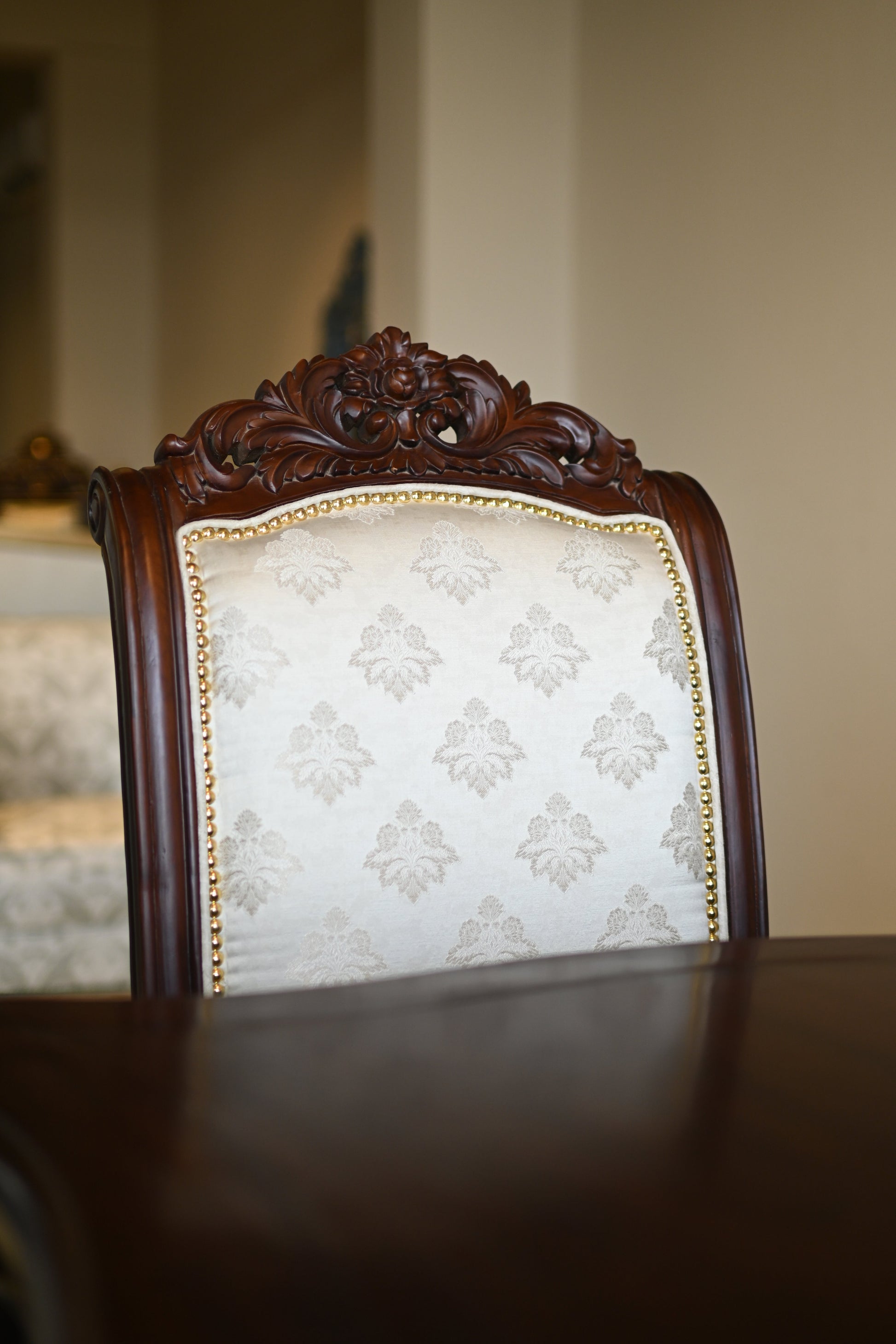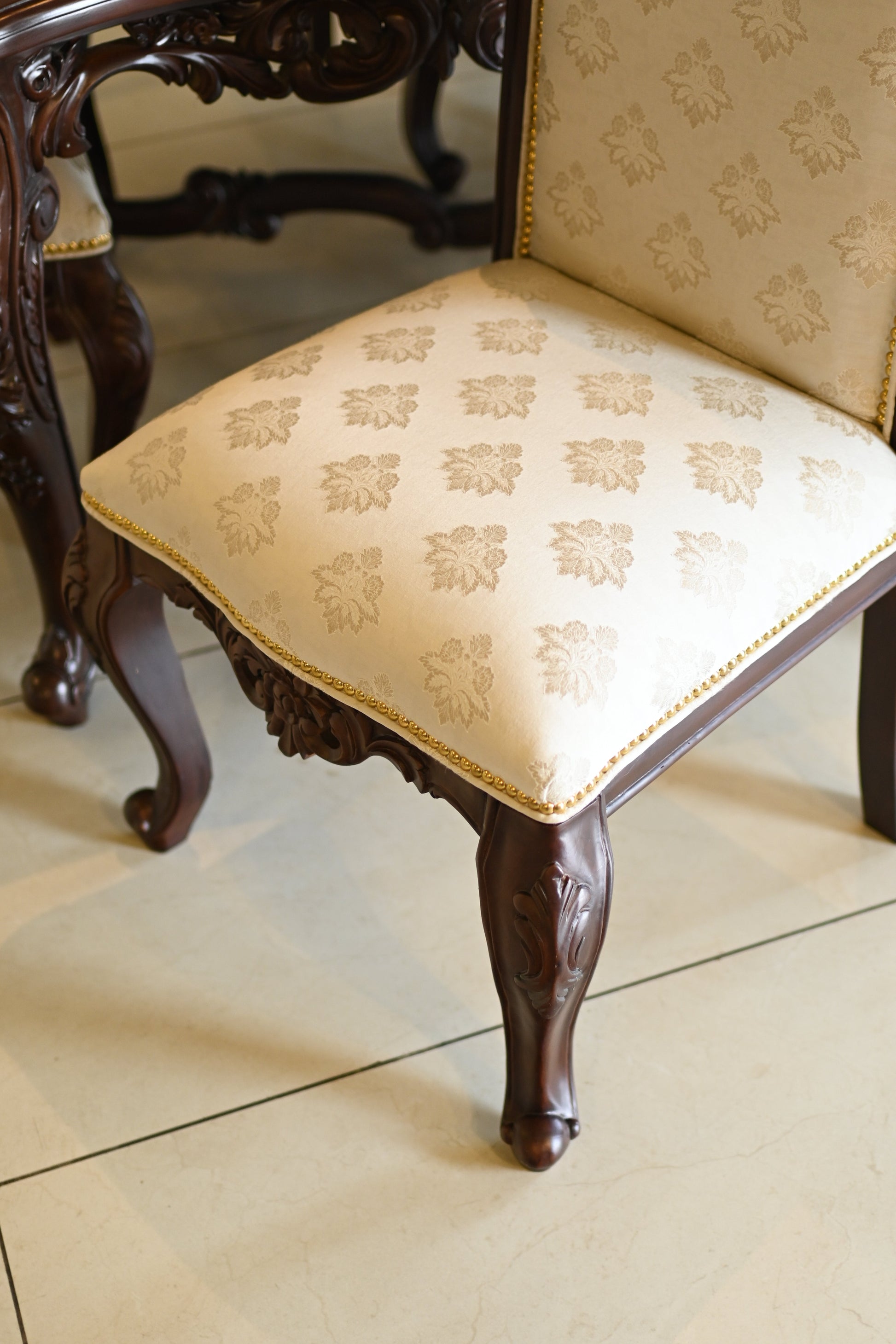 The table rests on elaborately hand-carved legs, exuding the quiet power of legacy, while each chair carries the poise of a throne — detailed with scrollwork, floral crests, and golden studding.