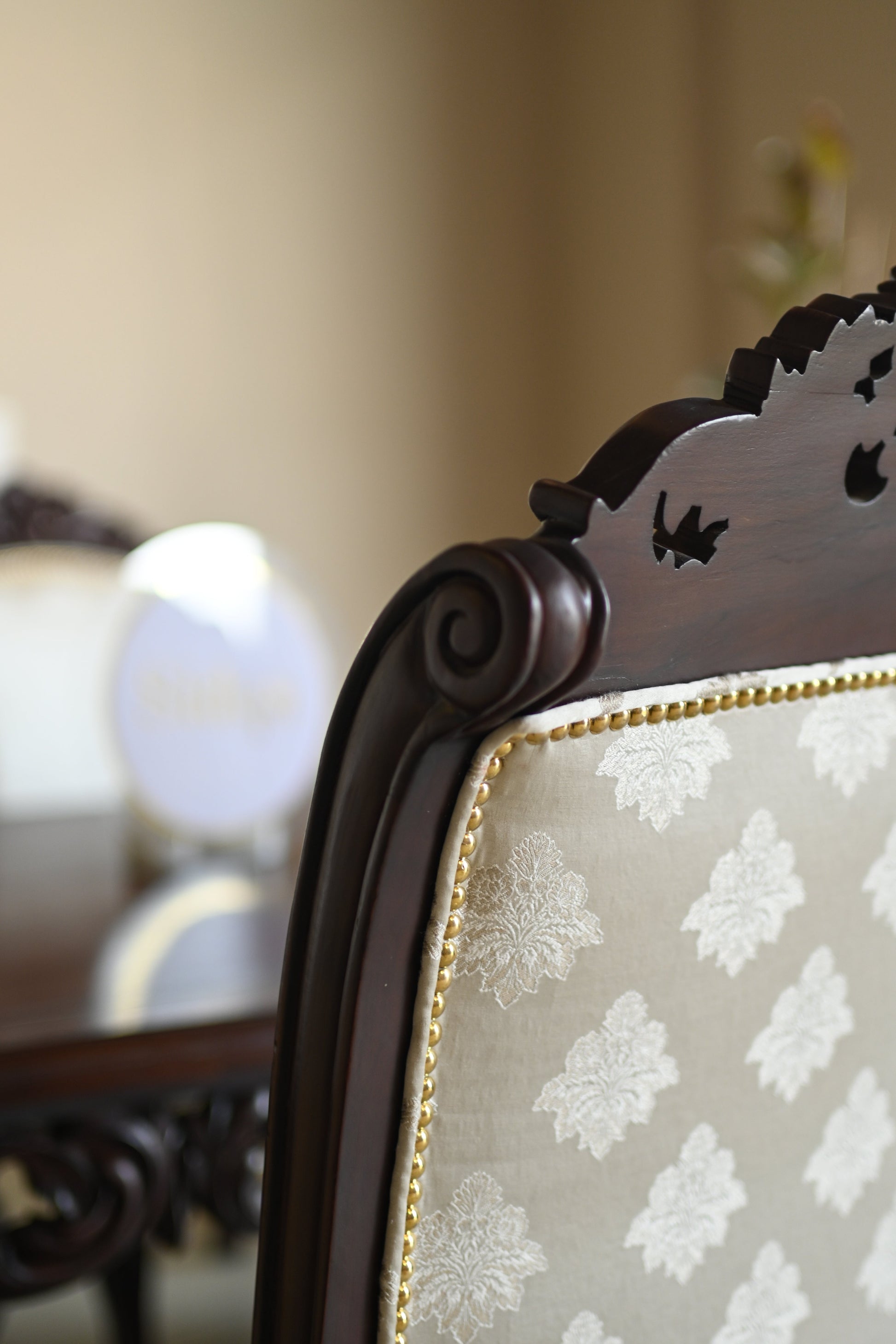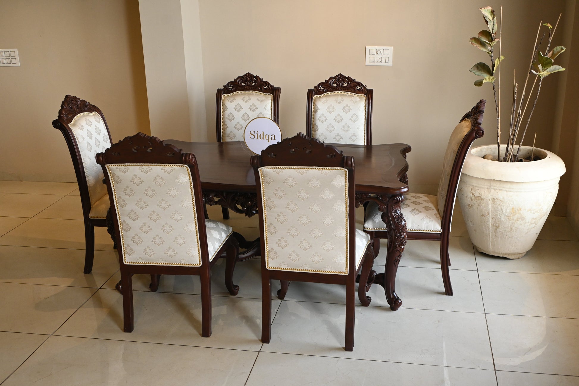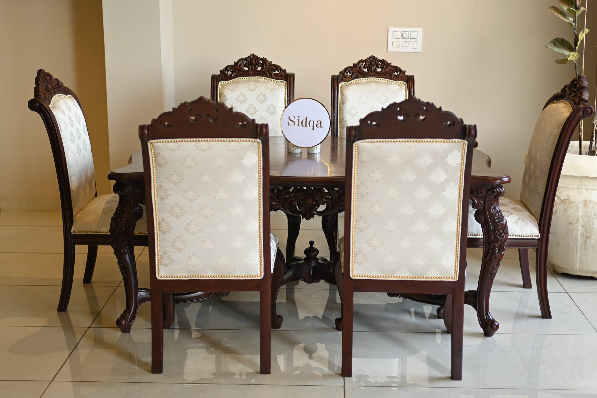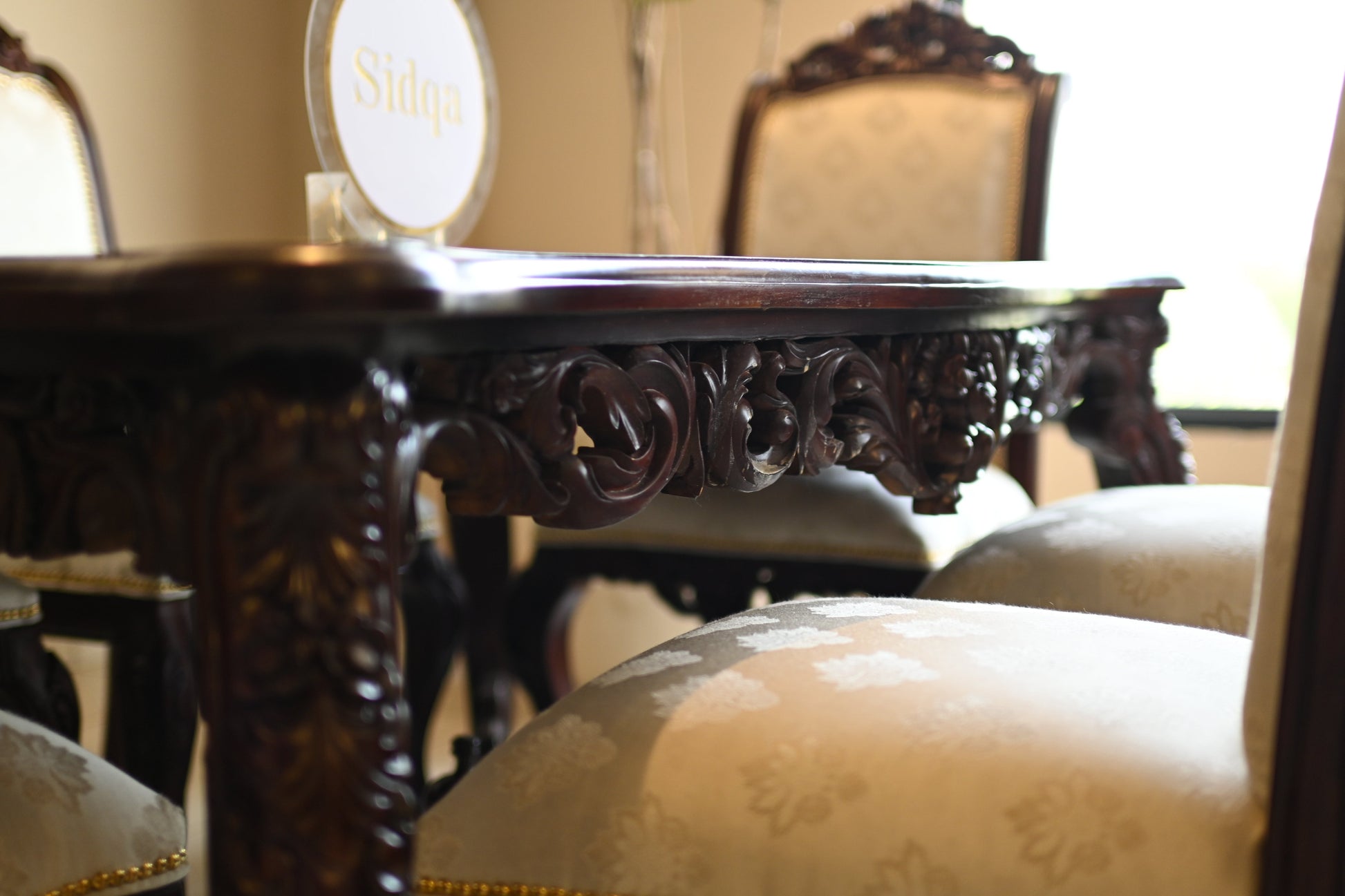 The table rests on elaborately hand-carved legs, exuding the quiet power of legacy, while each chair carries the poise of a throne — detailed with scrollwork, floral crests, and golden studding.