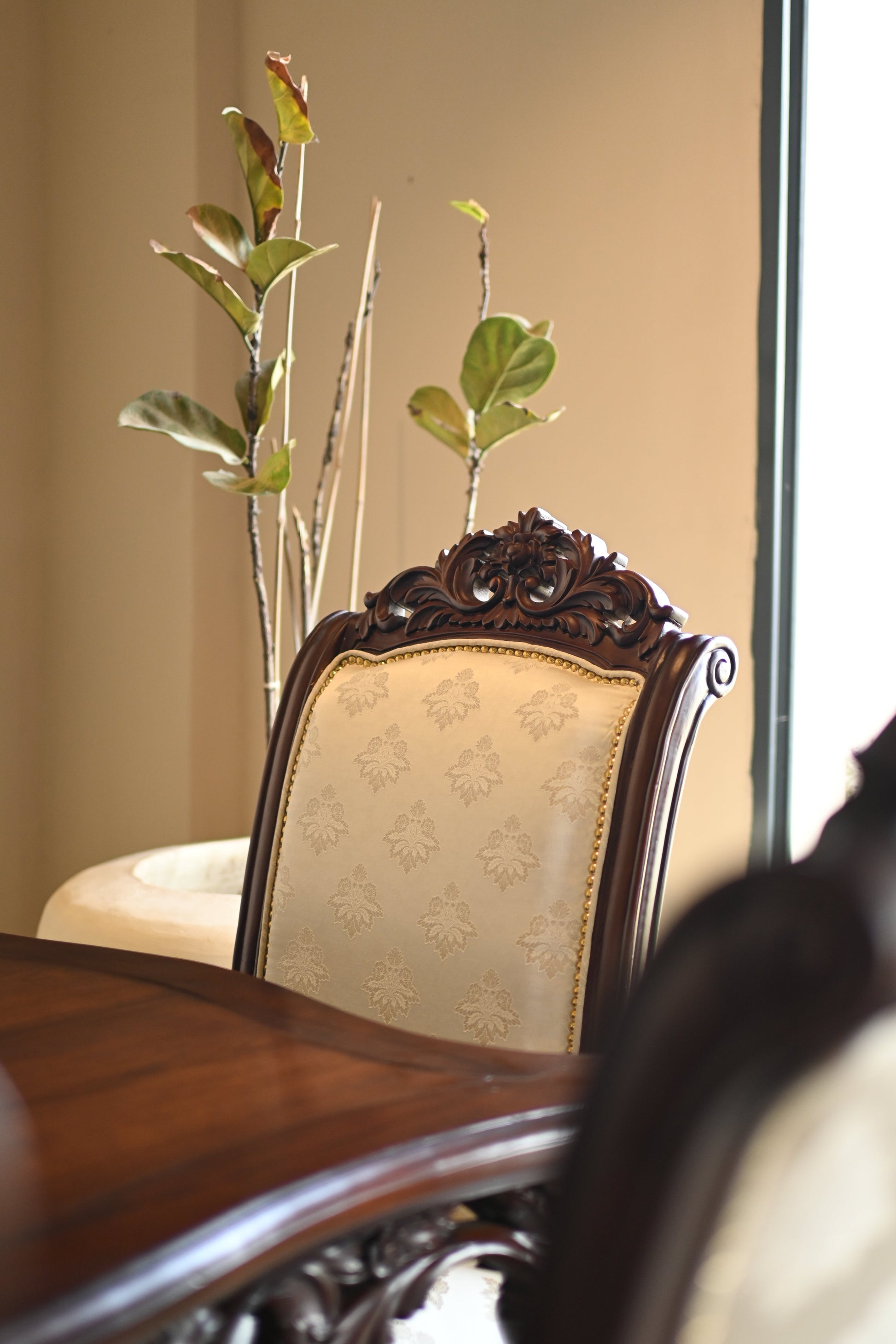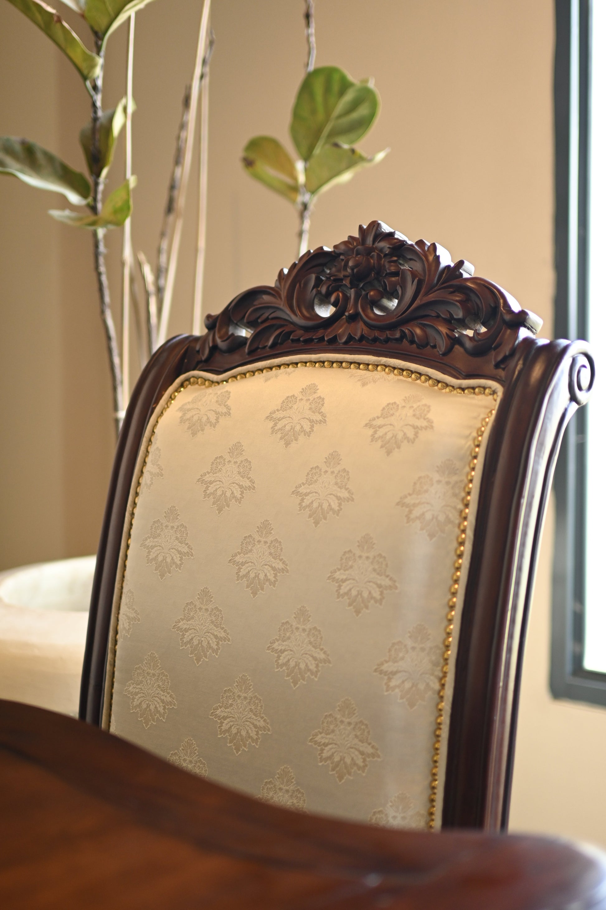 Every meal becomes a royal affair with L’Heure du Roi — a timeless 6-seater dining ensemble carved in grandeur and upholstered in soft ivory damask.
