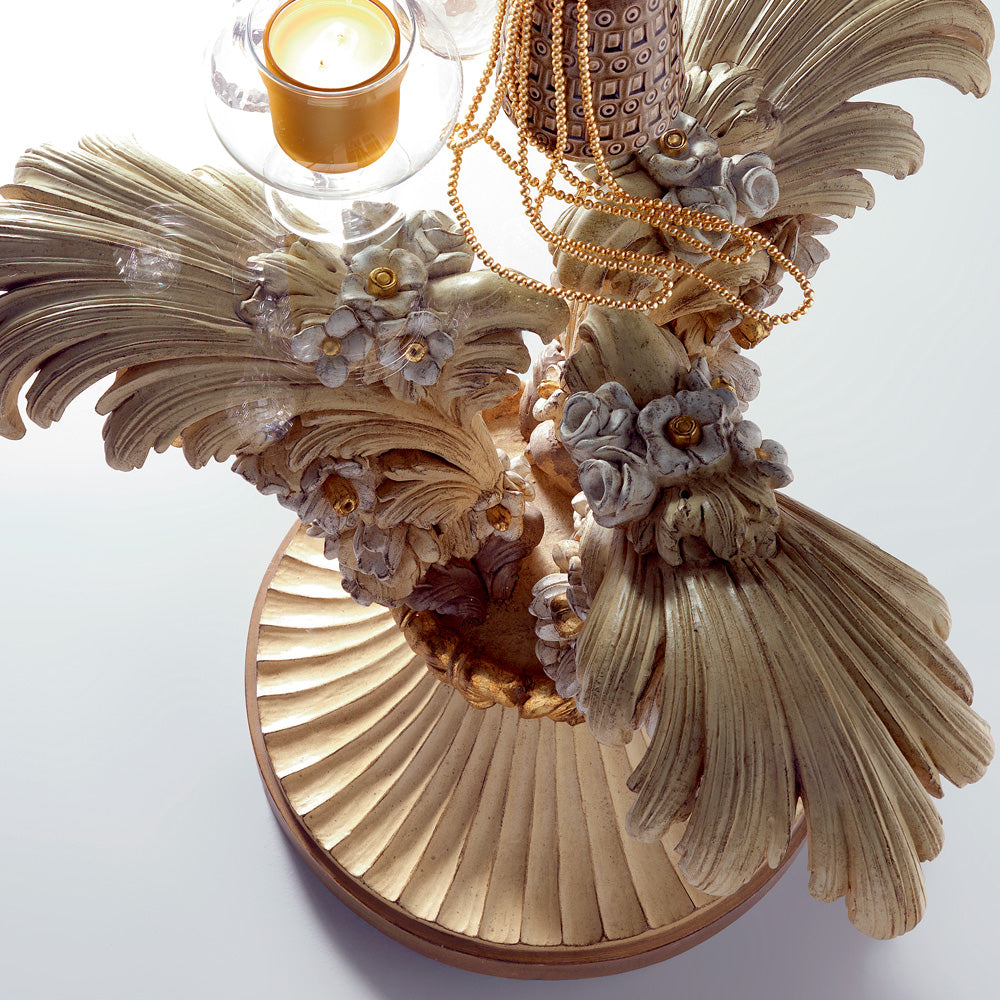 Her base flutes like the stem of a divine chalice, grounded in symmetry and old-world devotion.