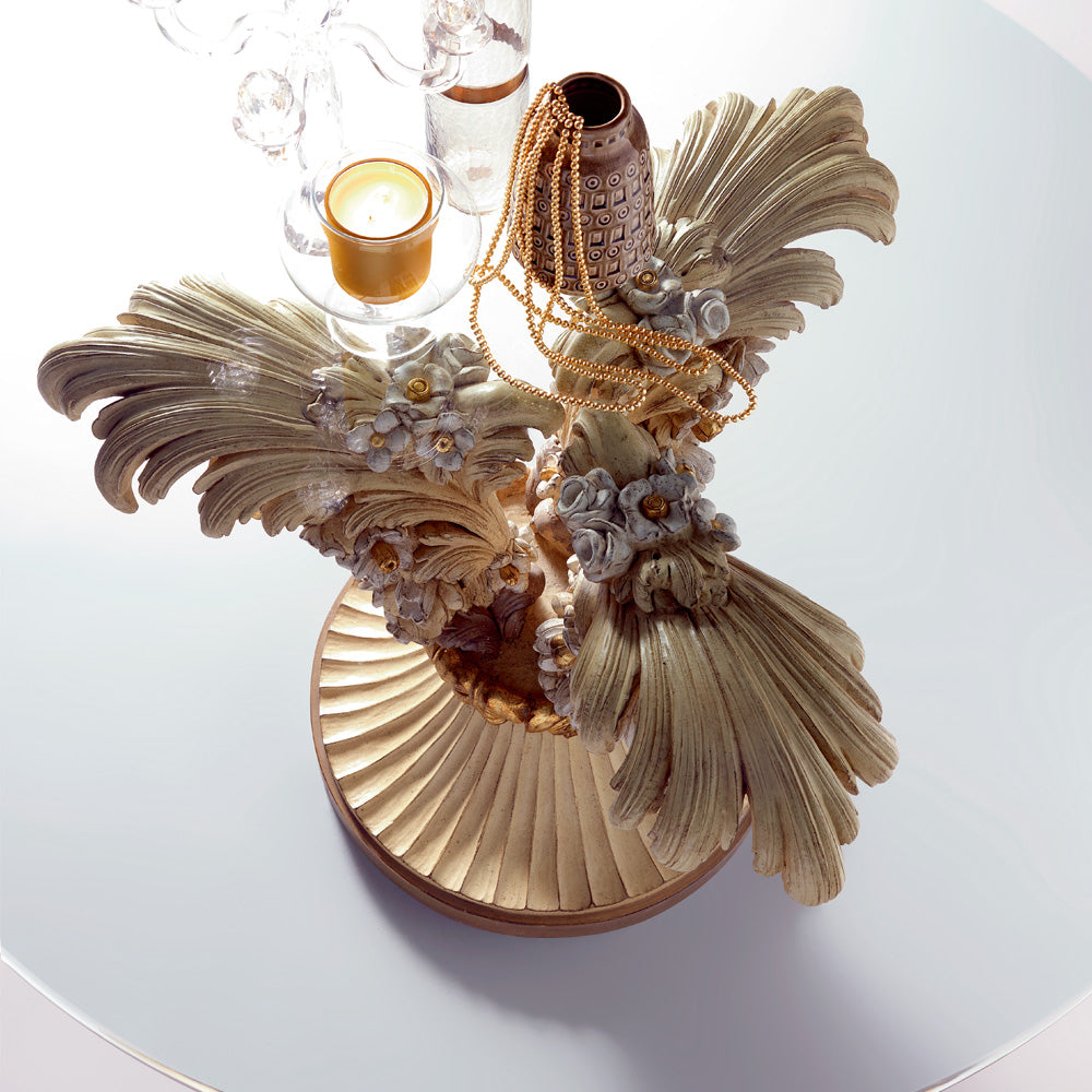 A crown of florals carved in full relief — not scattered, but gathered, rising upward with a grace that feels almost ceremonial.