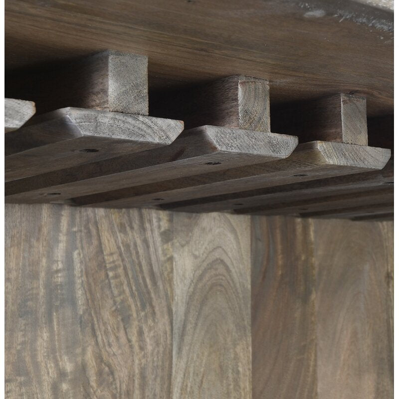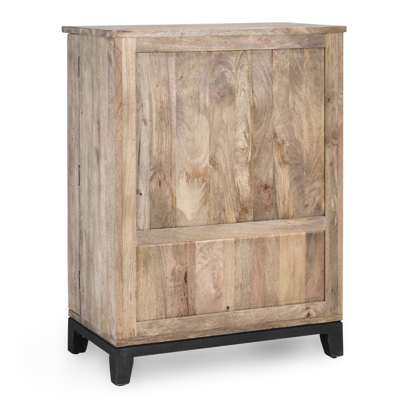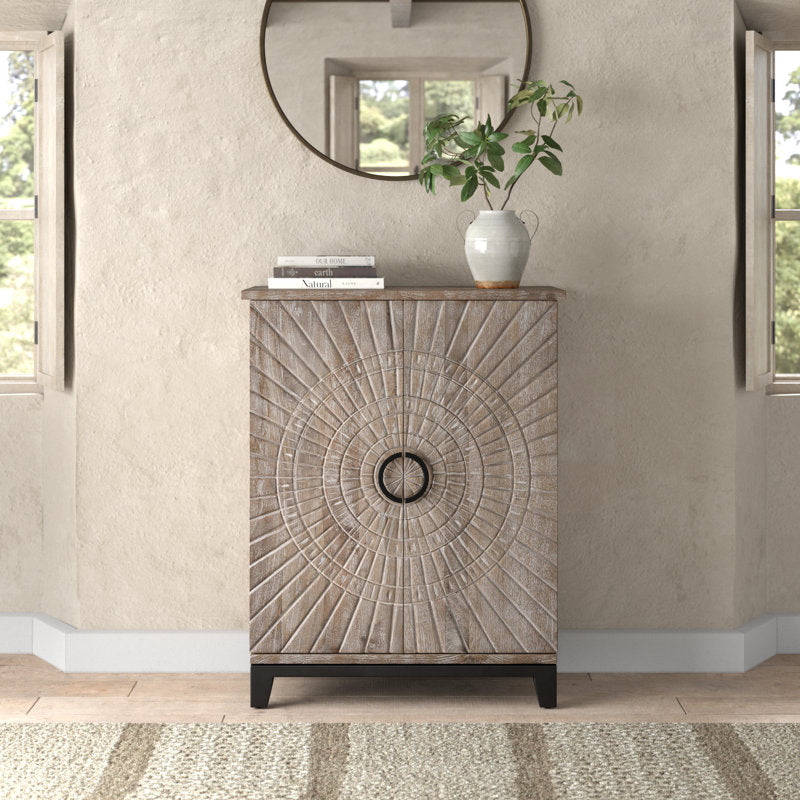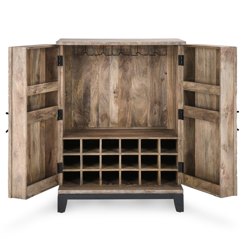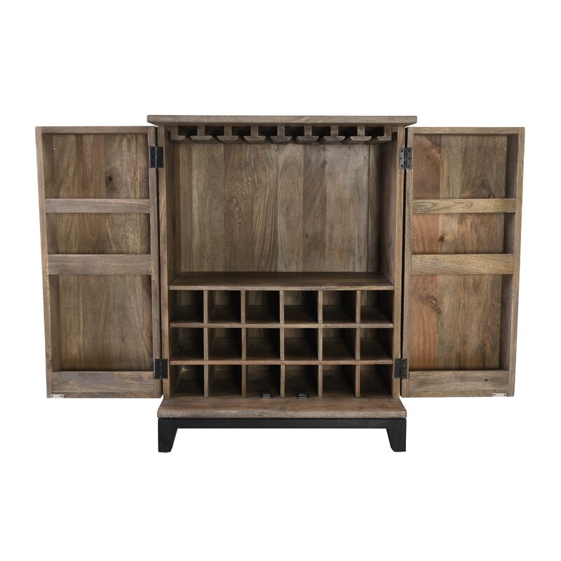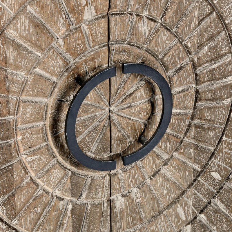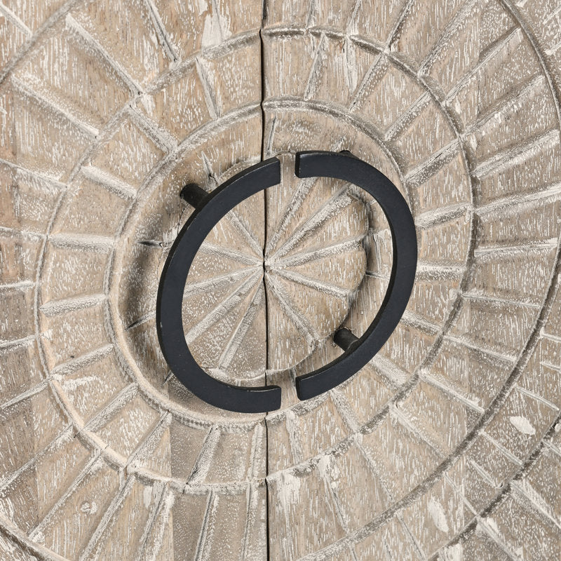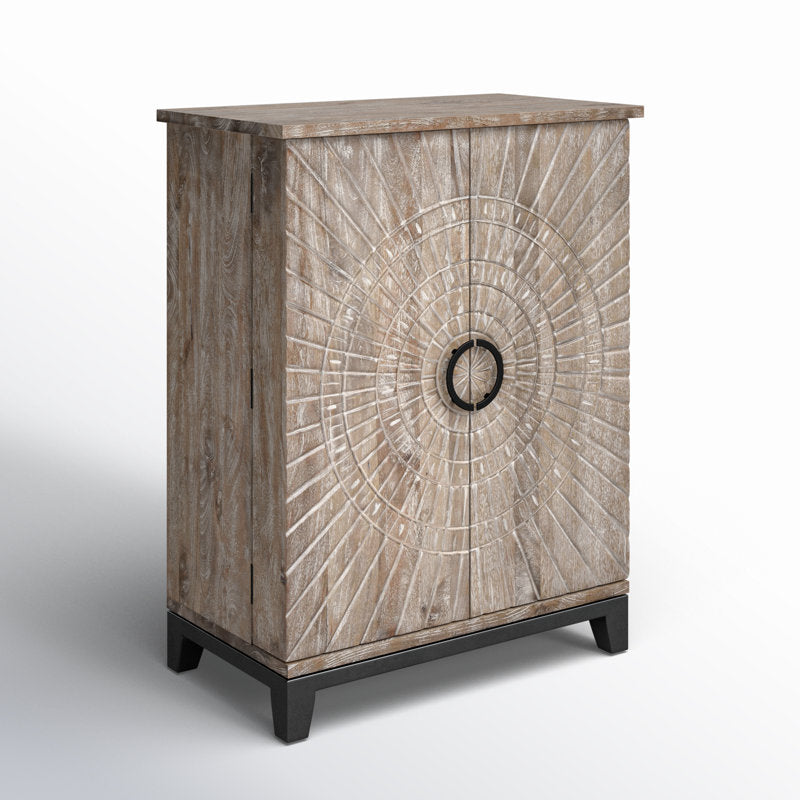 Lune de Bois carries the quiet poetry of an evening spent in hushed revelry. Its hand-carved façade, radiating like a celestial sundial, opens to reveal a sanctuary of spirits—meticulously arranged spaces for bottles and glasses, waiting to hold the night's finest indulgences. The weathered wood finish speaks of timeless elegance, while the grounding black base offers a touch of quiet sophistication. A cabinet not just for storage, but for stories waiting to be poured.
