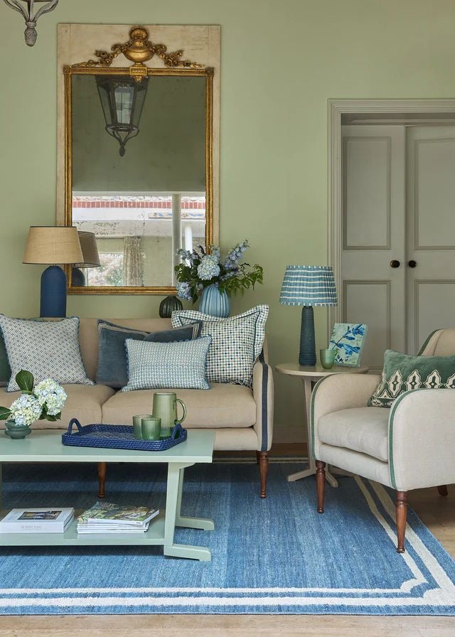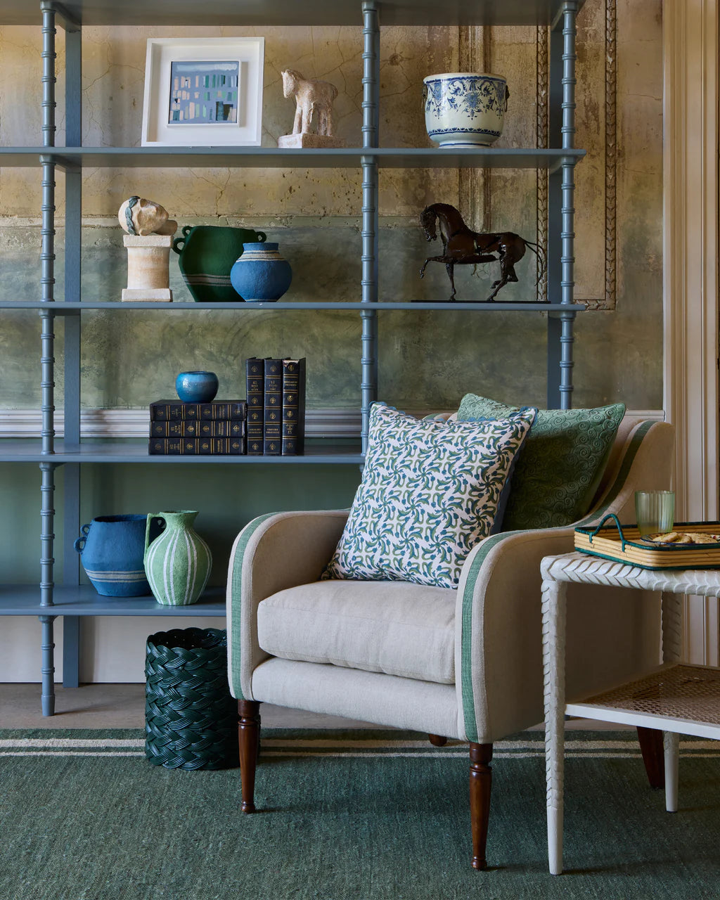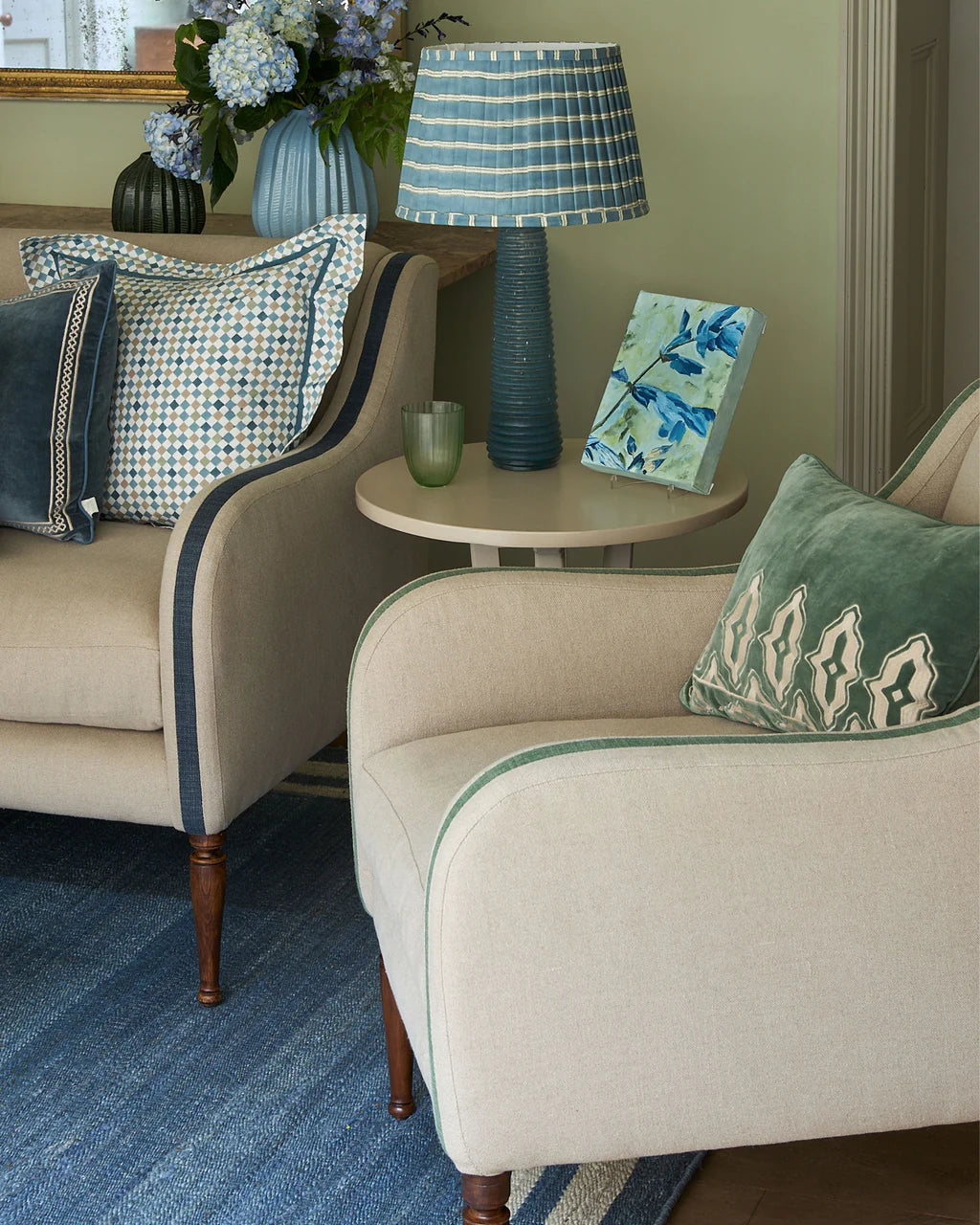 A slender ribbon of colour traces her form — in sage green or dusky blue, your choice — offering just enough contrast to speak, never shout.